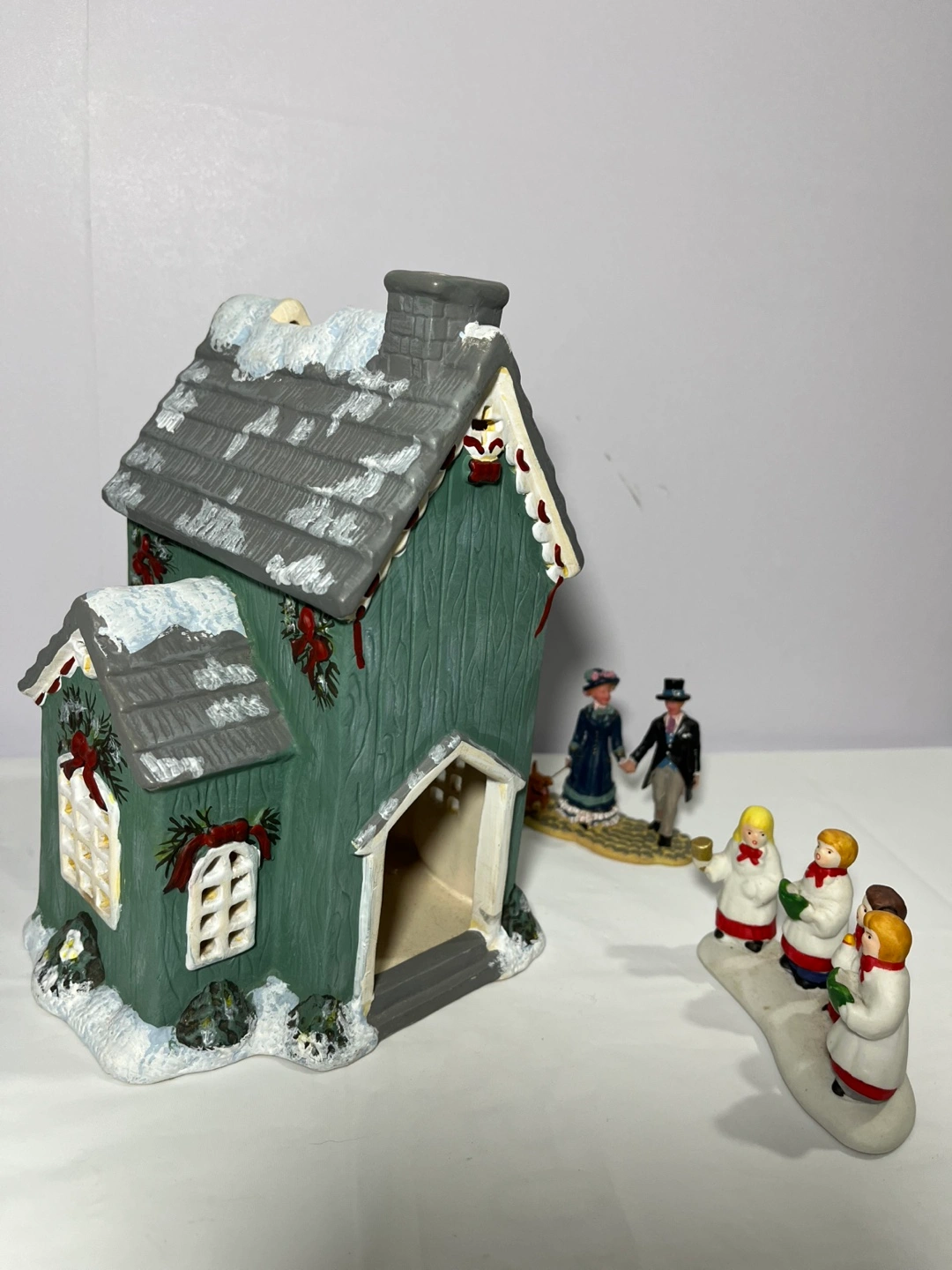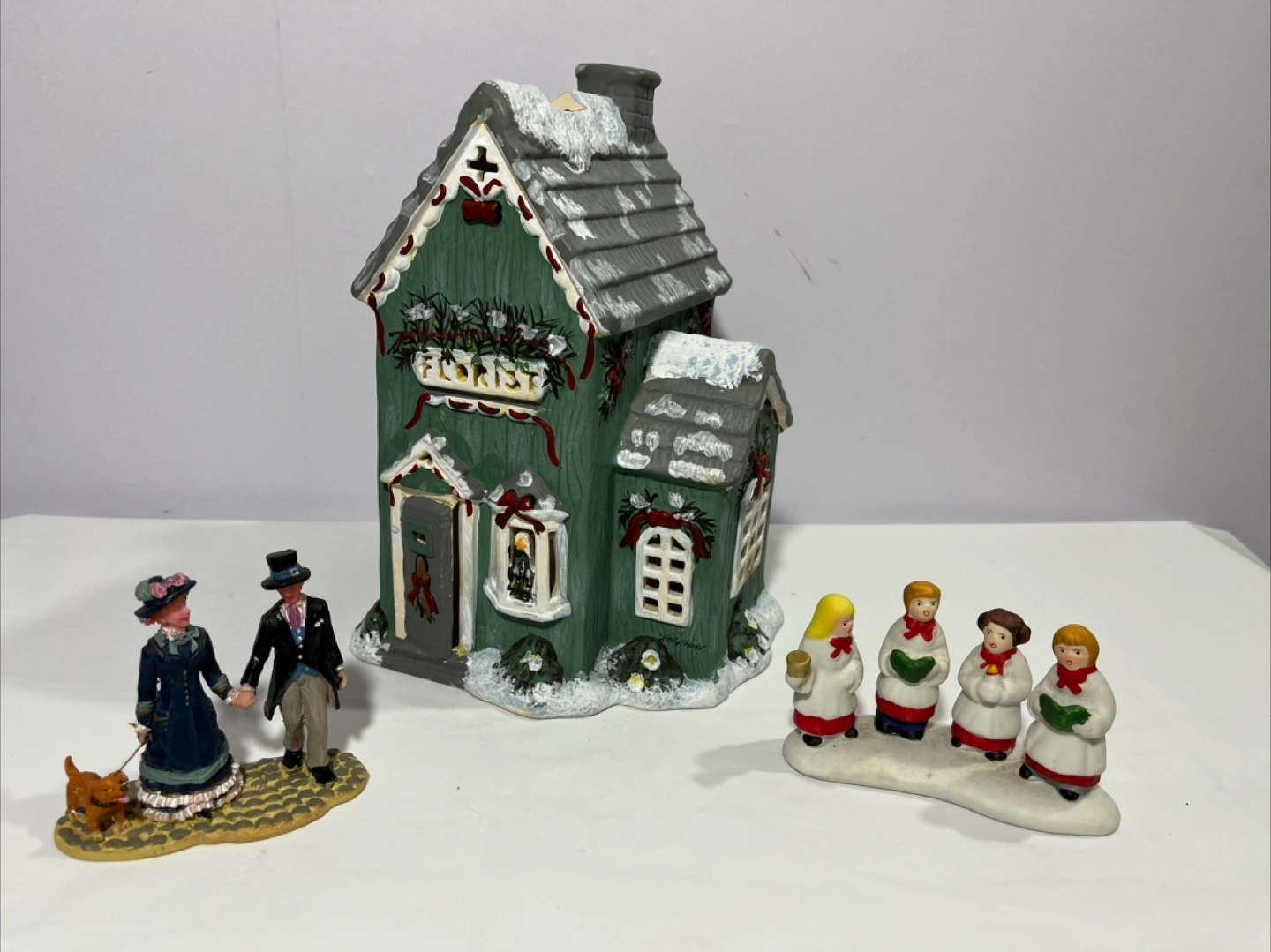 Christmas village set with a charming house and figurines. The house has a florist detail and snowy roof. Includes a couple with a dog and a choir group. Perfect for holiday decor!