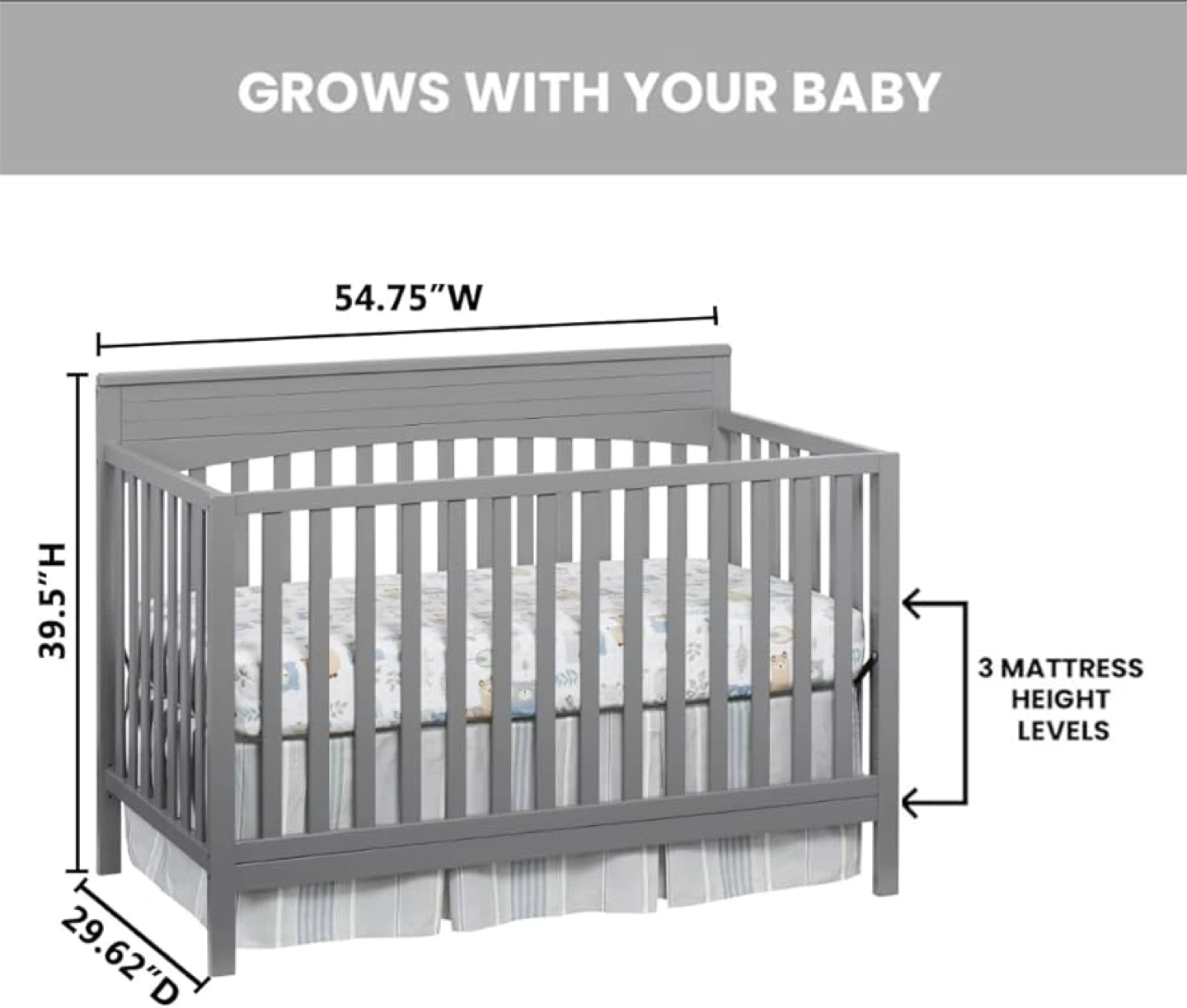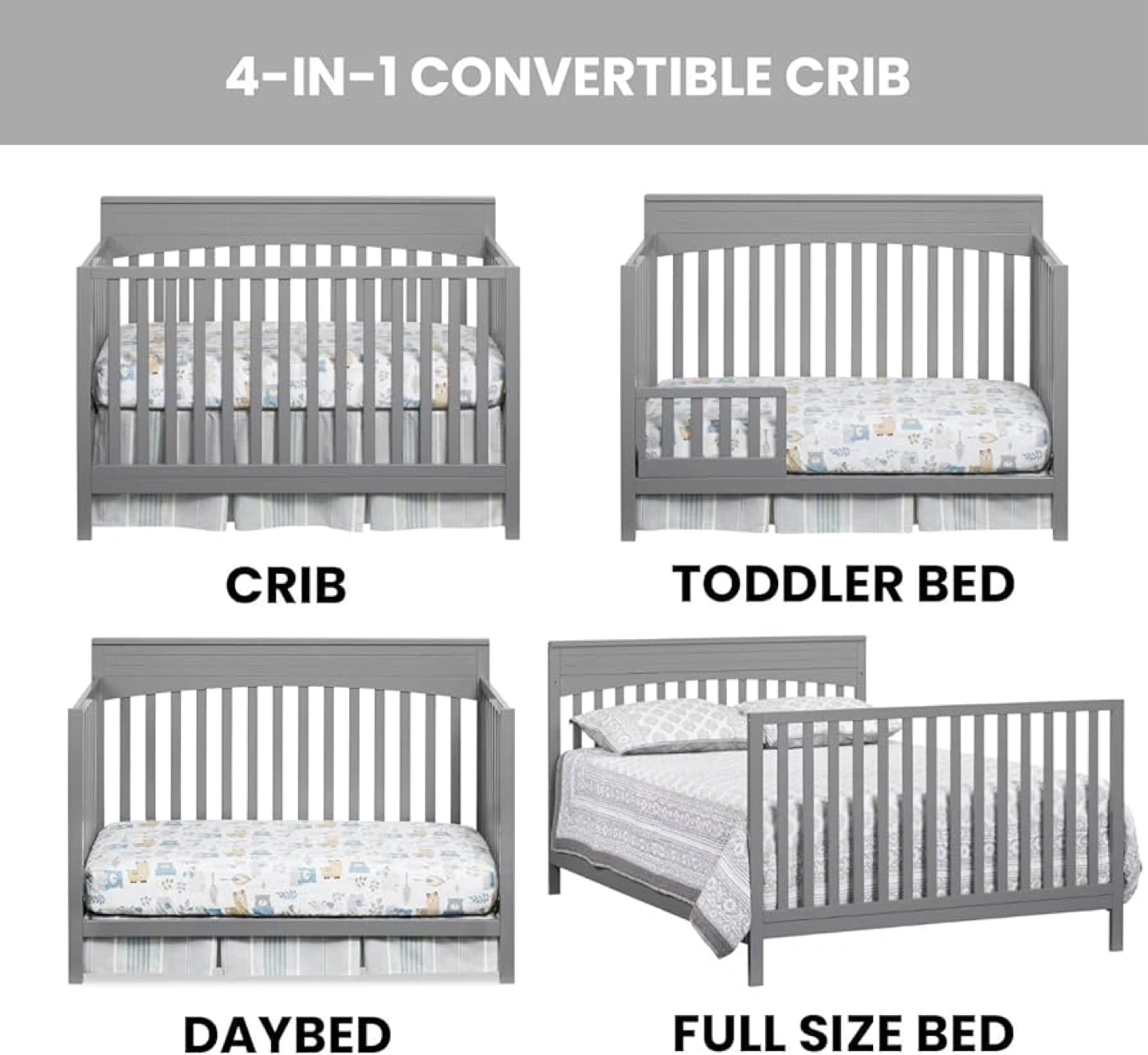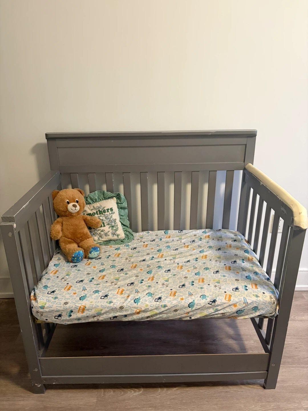 Selling a grey 4-in-1 convertible crib! It can be converted into a crib, toddler bed, daybed, or full-size bed. The dimensions are 54.75"W x 39.5"H x 29.62"D. Grows with your baby!