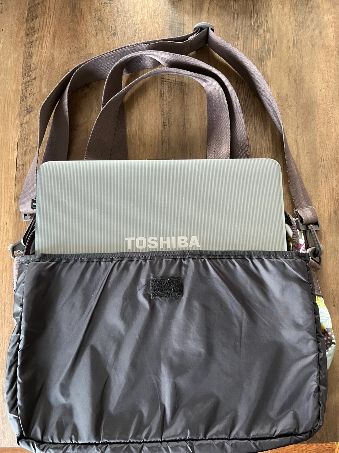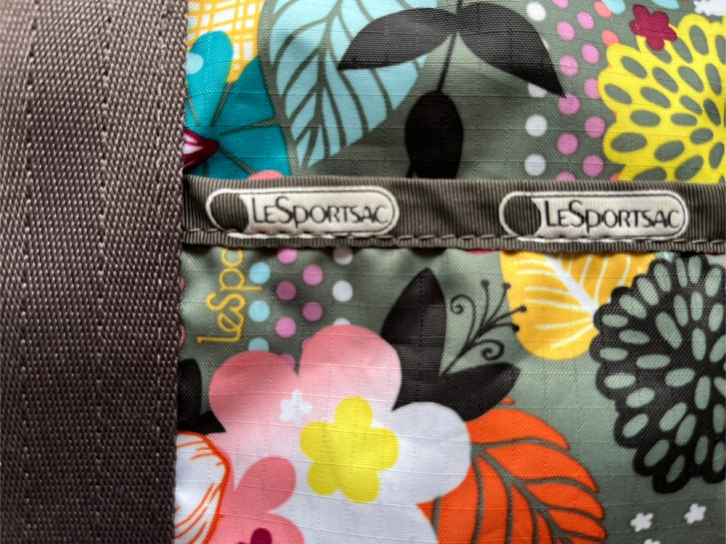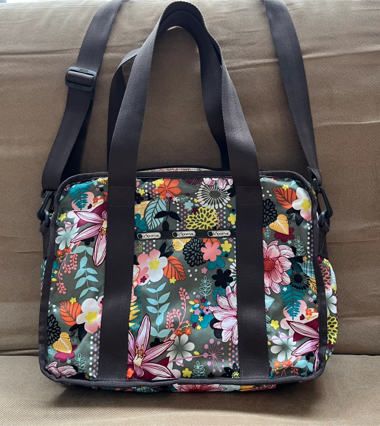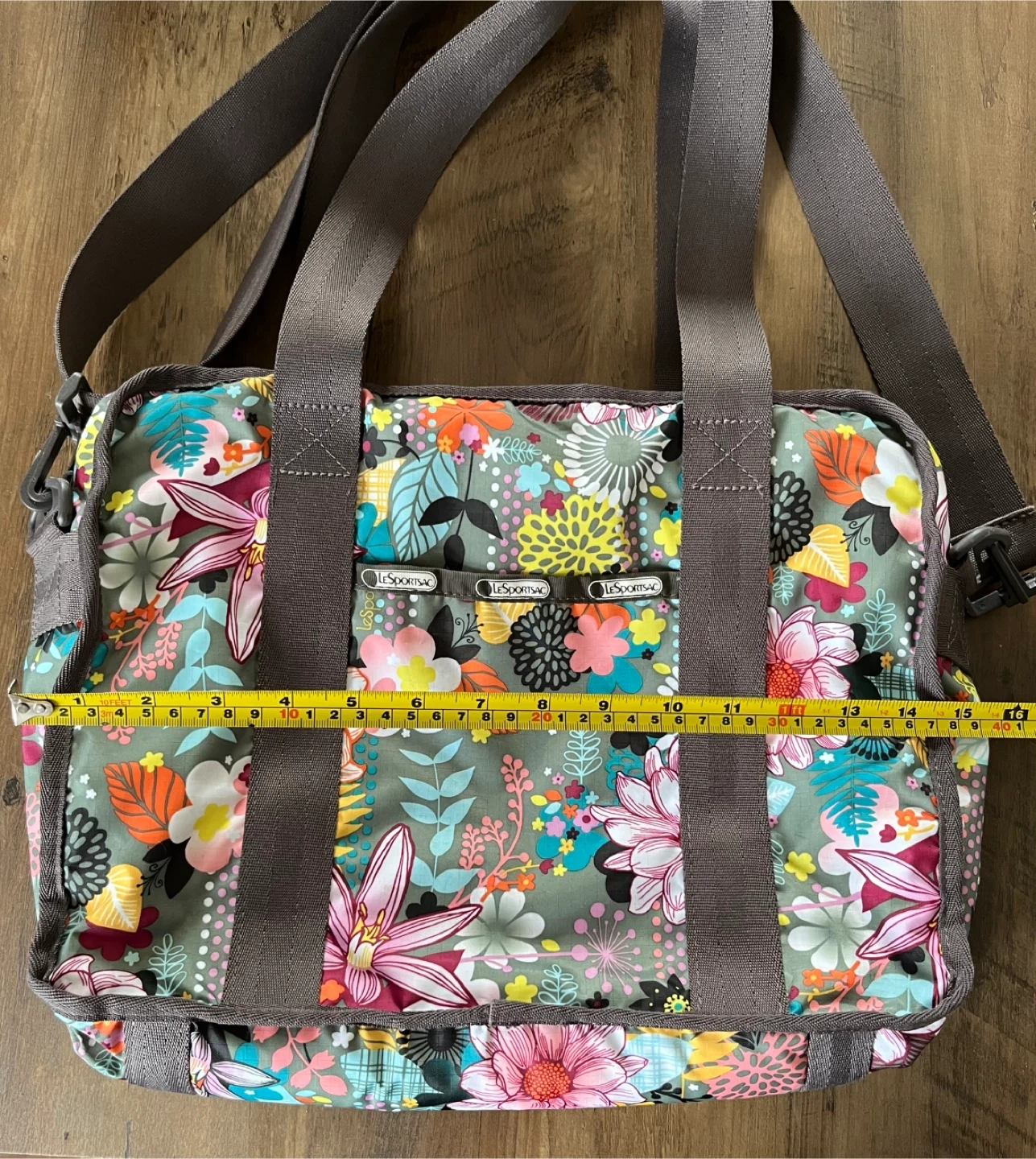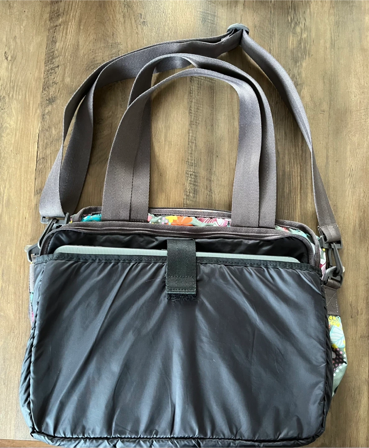 This is a LeSportsac laptop bag with a floral print. It has a brown strap and can also be used as a shoulder bag. The bag measures approximately 15 inches in length.
