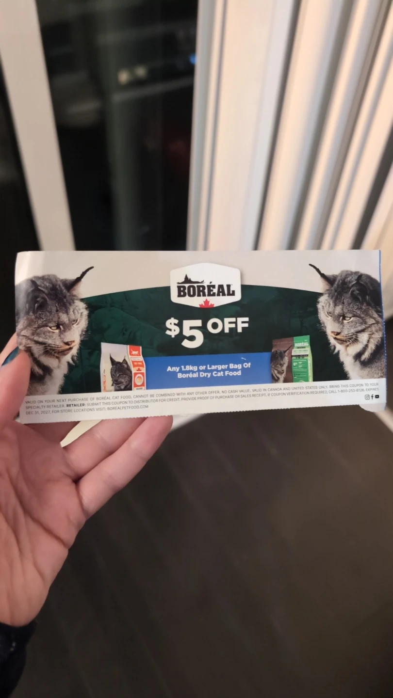 Gifting a coupon for $5 off any 1.8kg or larger bag of Boréal dry cat food. The coupon is valid in Canada and the United States. It expires December 31, 2027