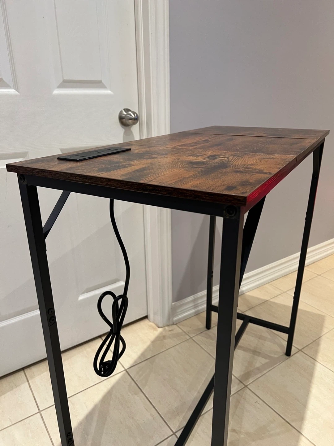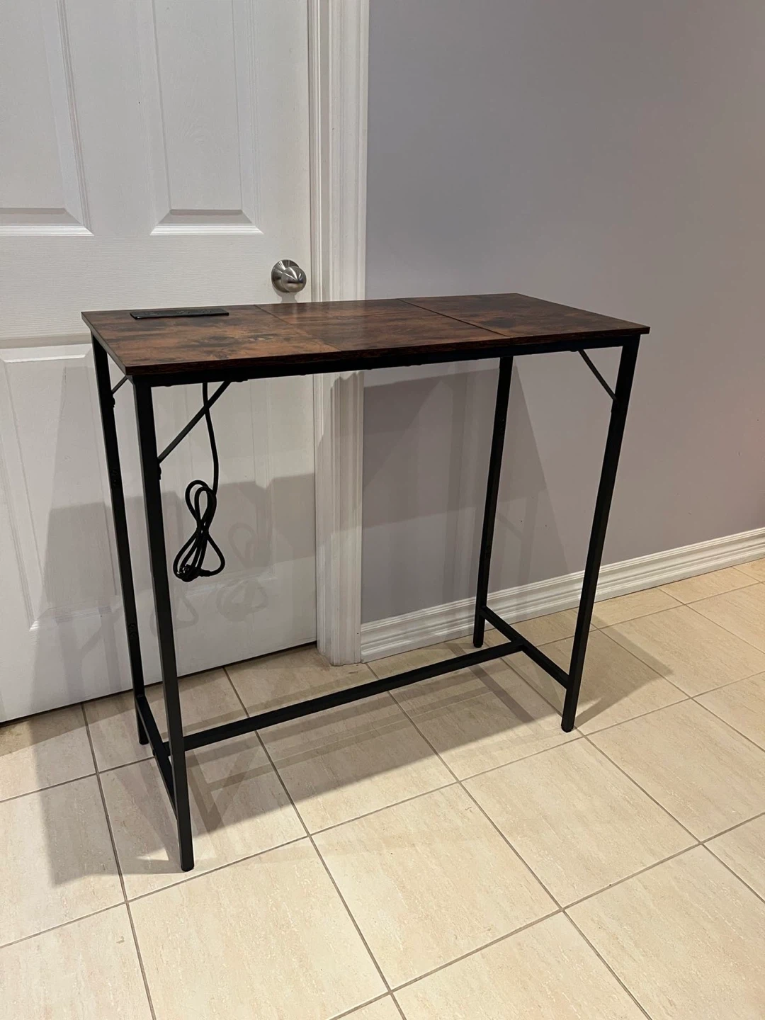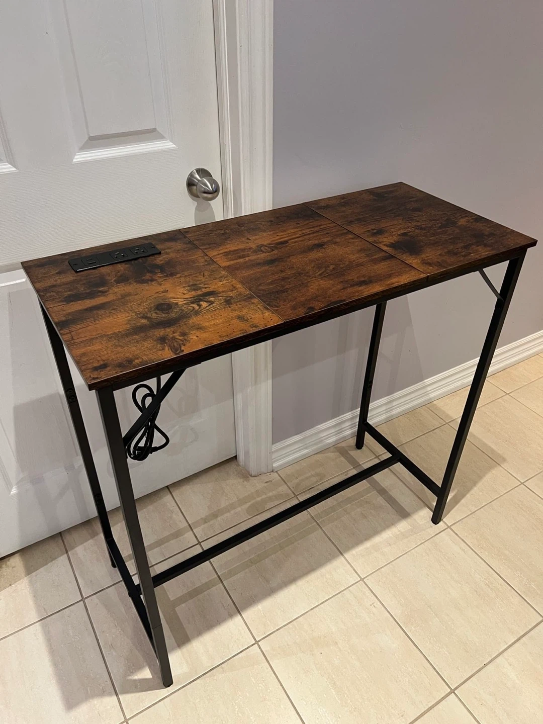 This desk features a brown wood top with a black metal frame. It also has built-in USB ports and power outlets, which is super handy! It's in great shape and ready to go