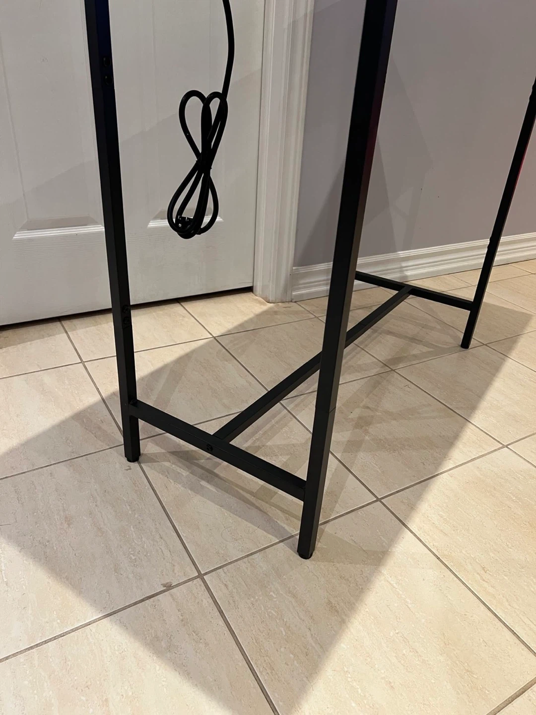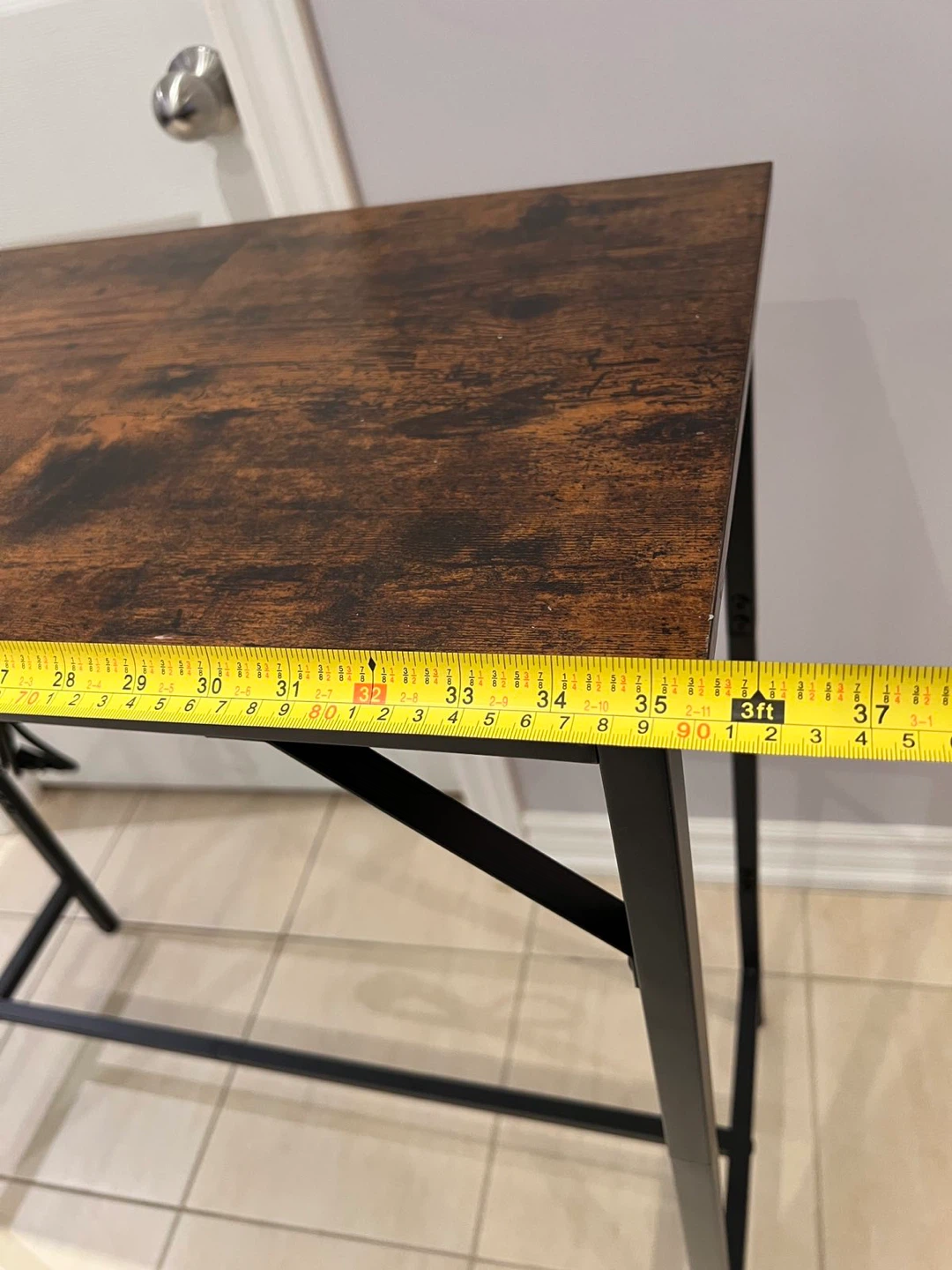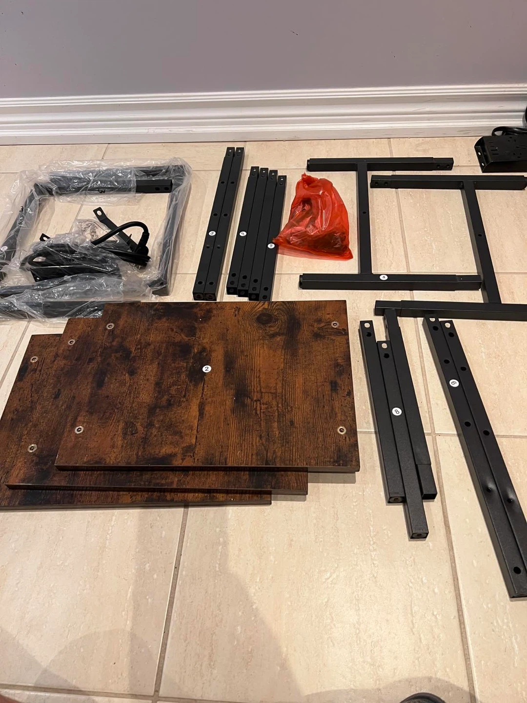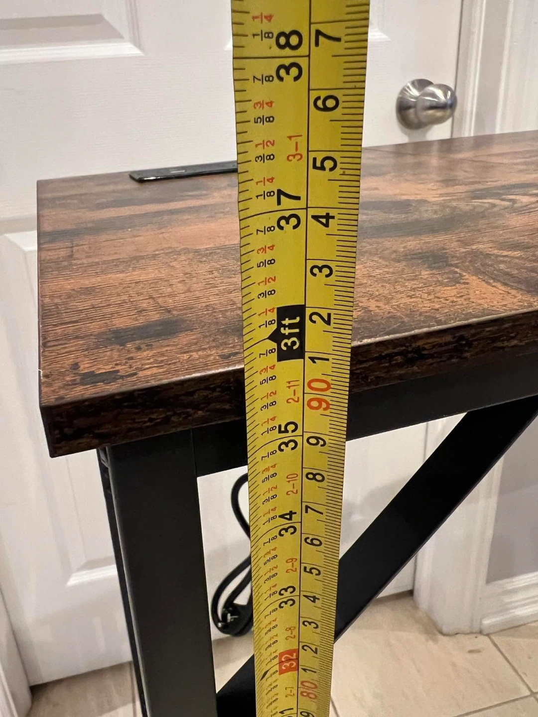 This desk features a brown wood top with a black metal frame. It also has built-in USB ports and power outlets, which is super handy! It's in great shape and ready to go