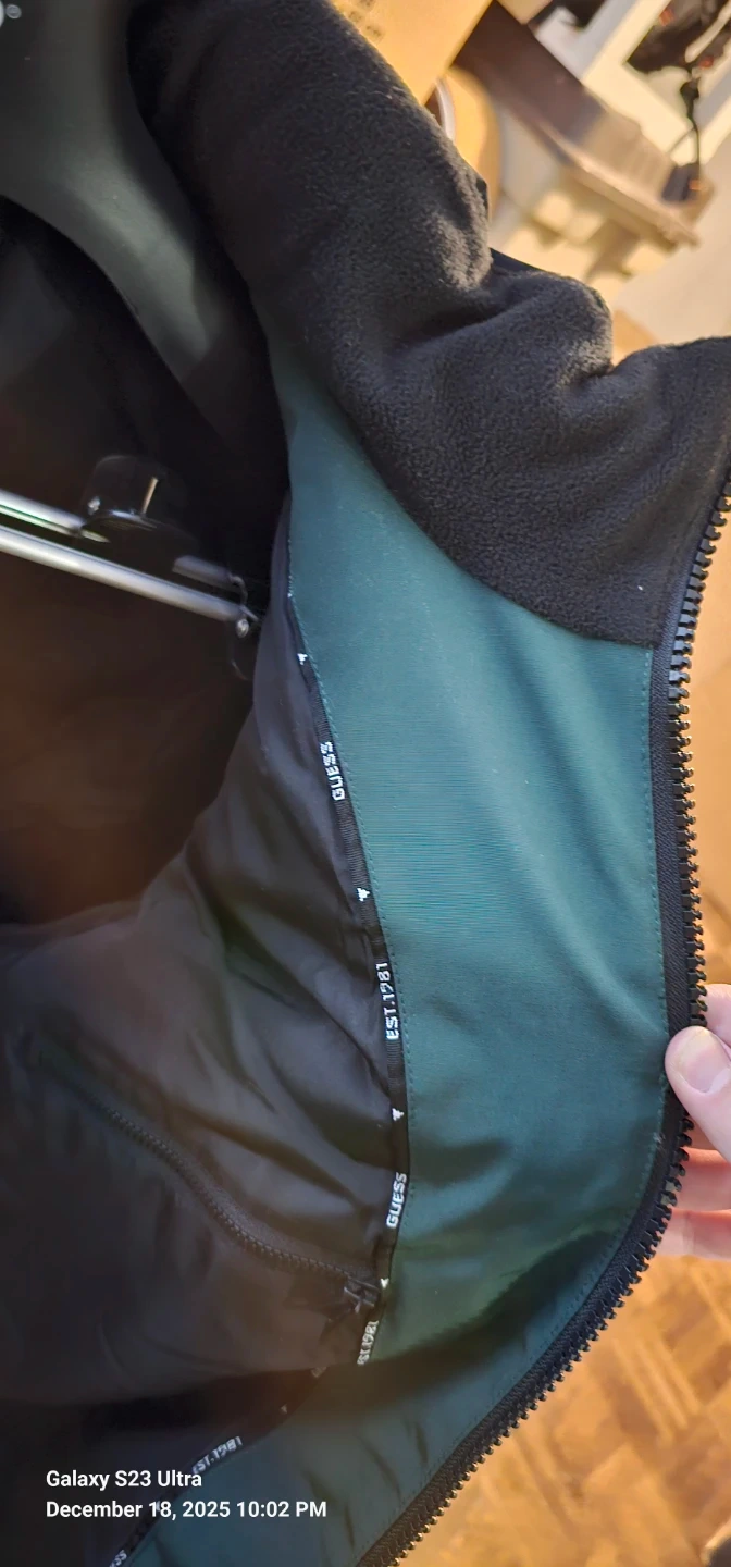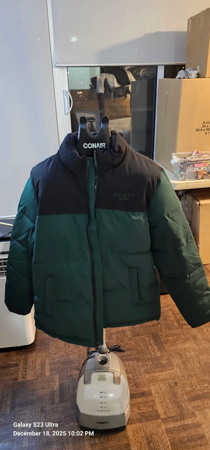 I have a Guess puffer jacket for sale! It's a size XL and features a stylish colour block design with black and green. The jacket is in great condition and ready for the colder weather