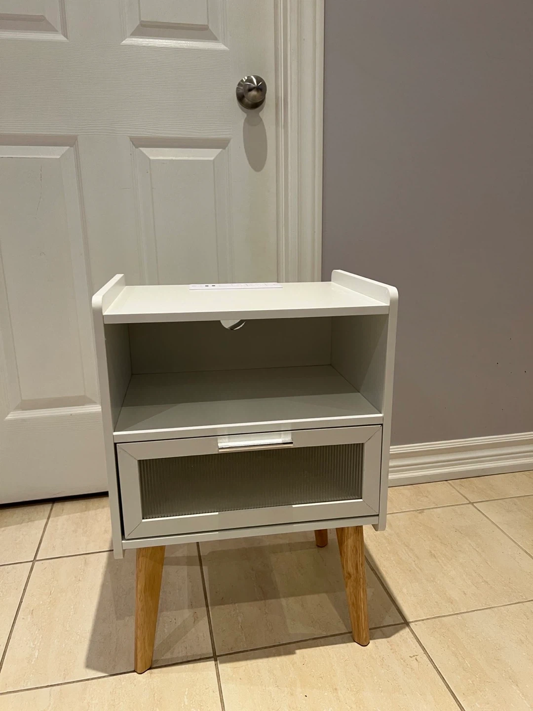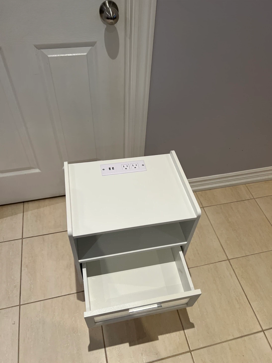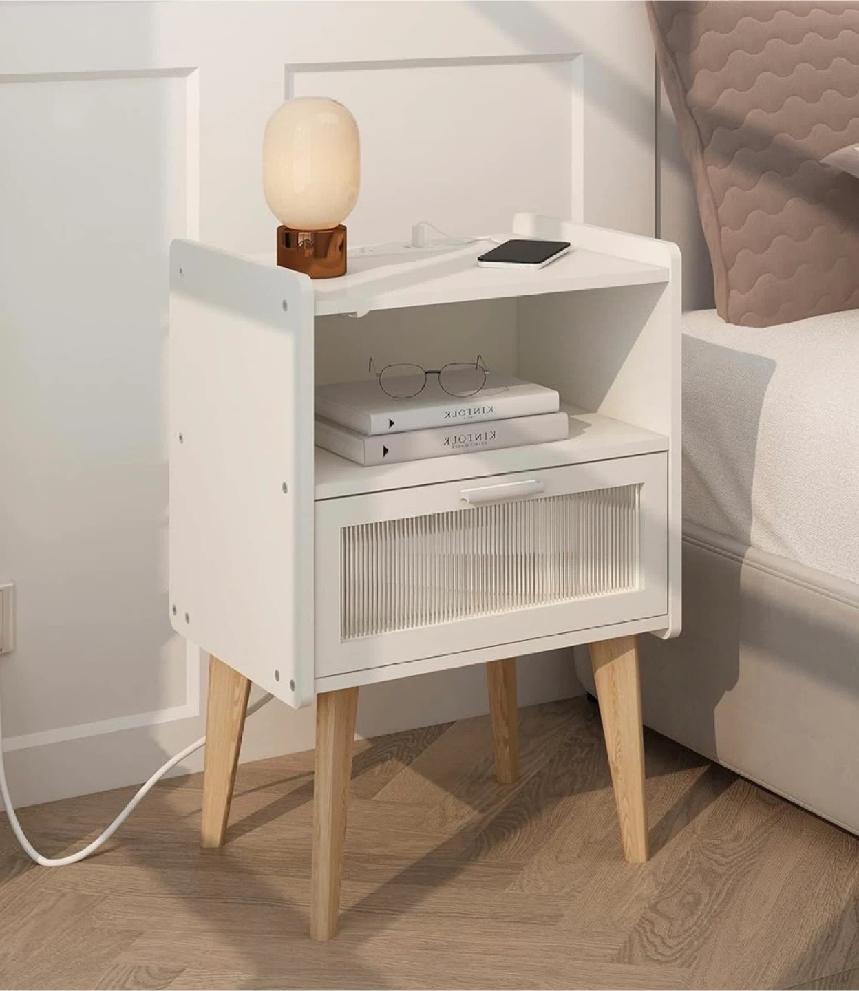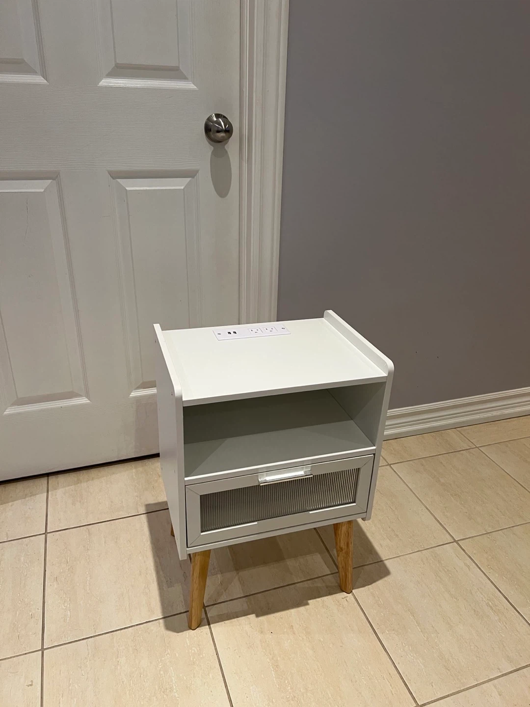Here's a handy white nightstand that's in great shape! It has a drawer with a ribbed glass front and a shelf for storage. The top of the nightstand features built-in USB ports and outlets, perfect for charging your devices overnight