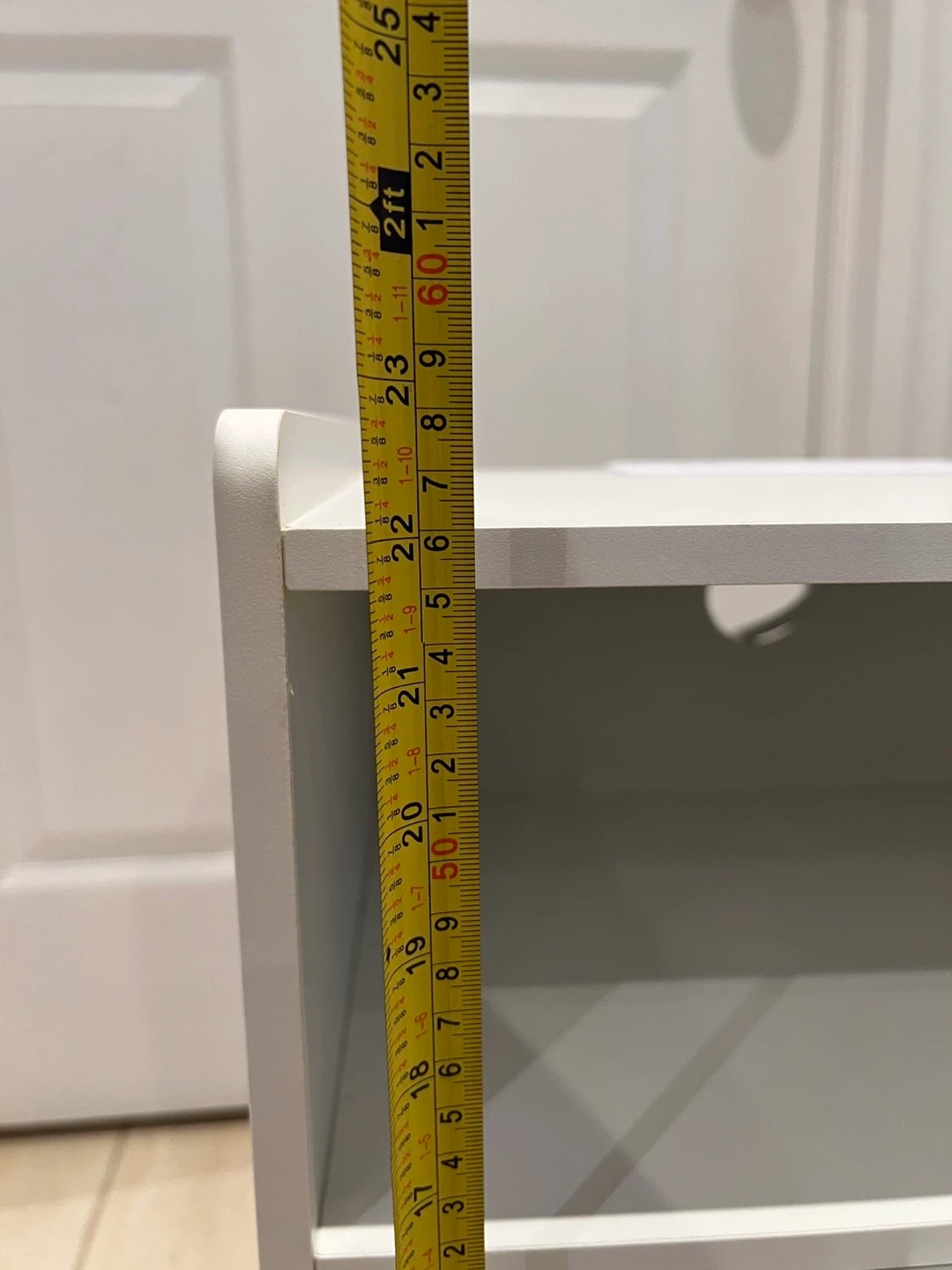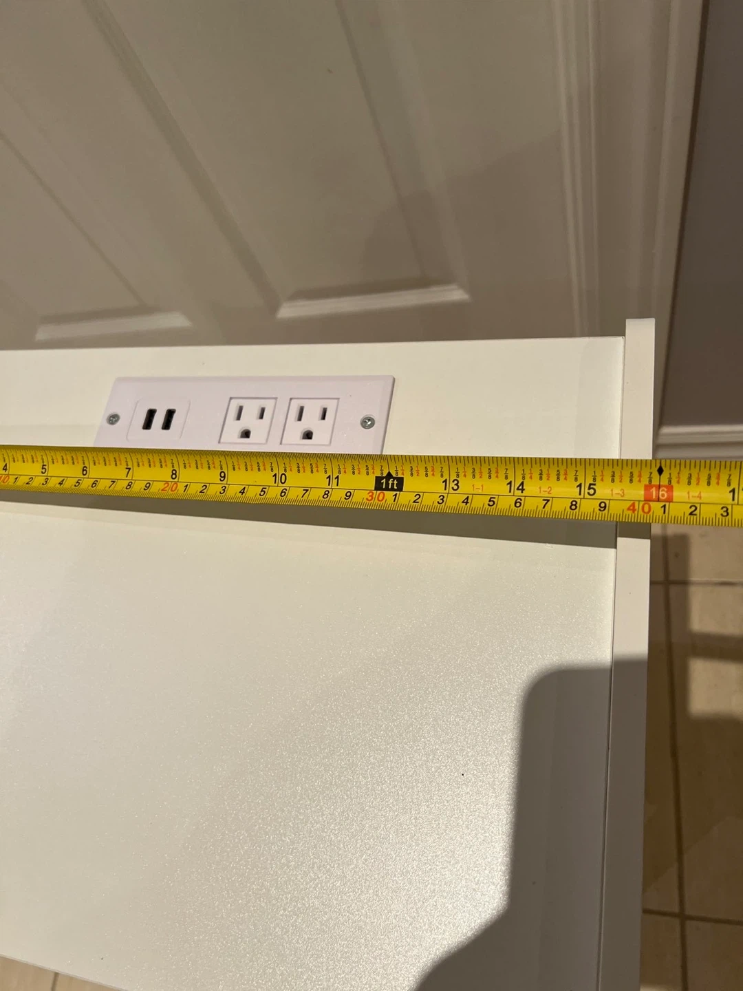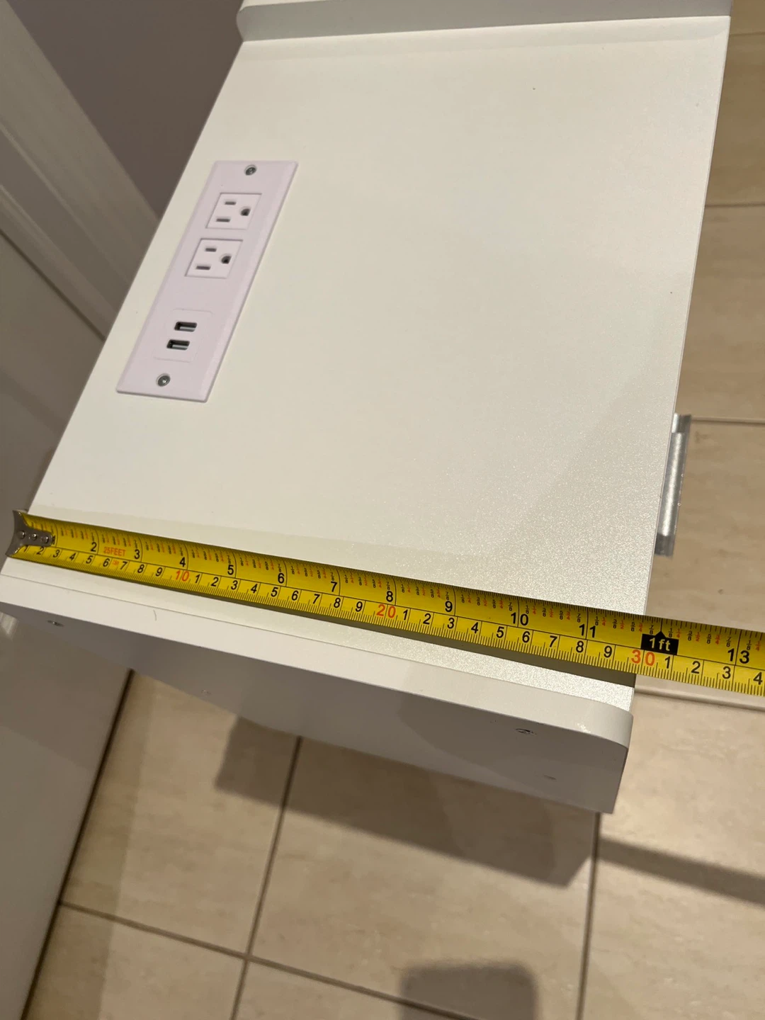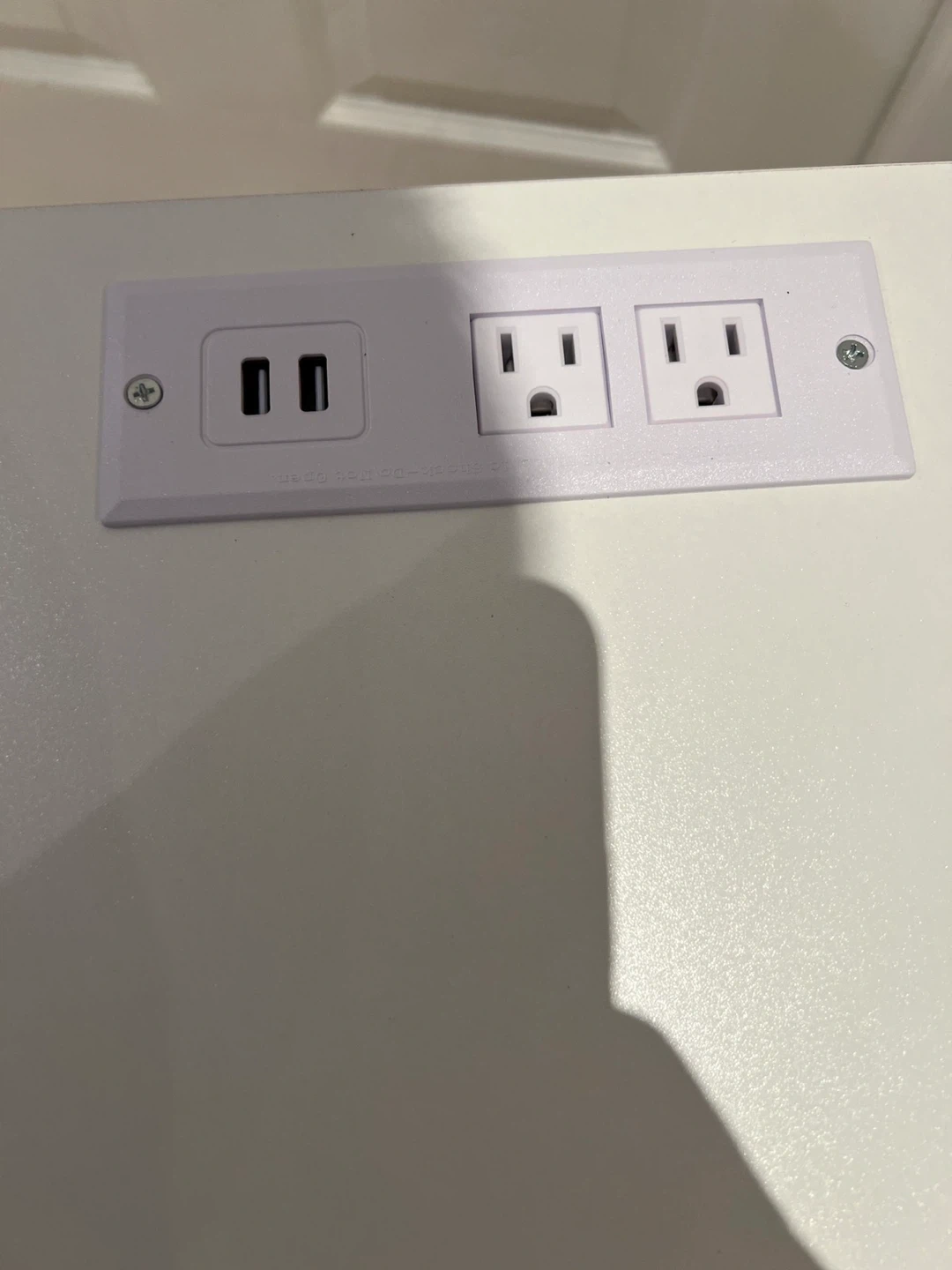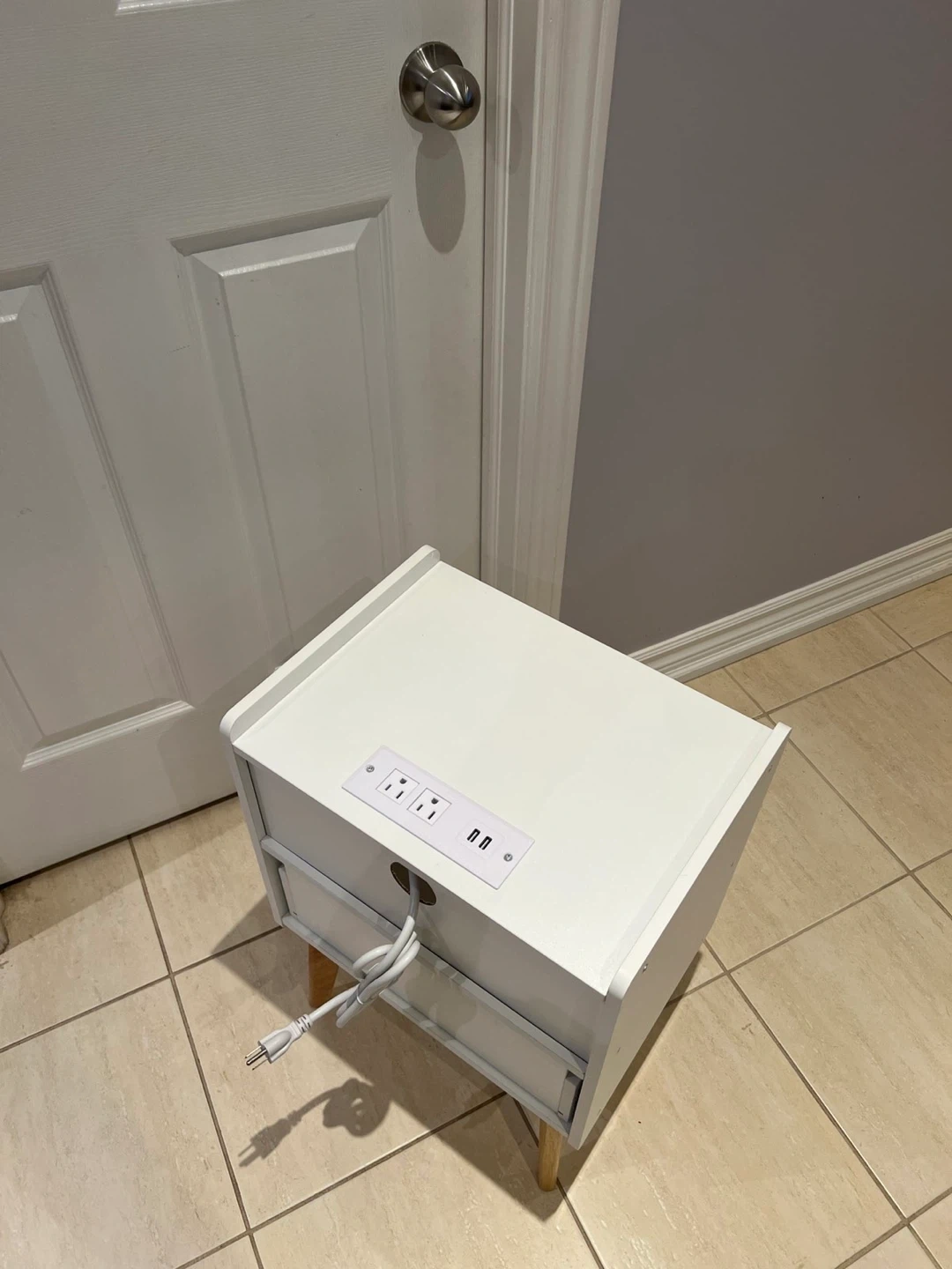 Here's a handy white nightstand that's in great shape! It has a drawer with a ribbed glass front and a shelf for storage. The top of the nightstand features built-in USB ports and outlets, perfect for charging your devices overnight