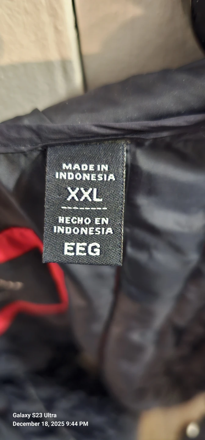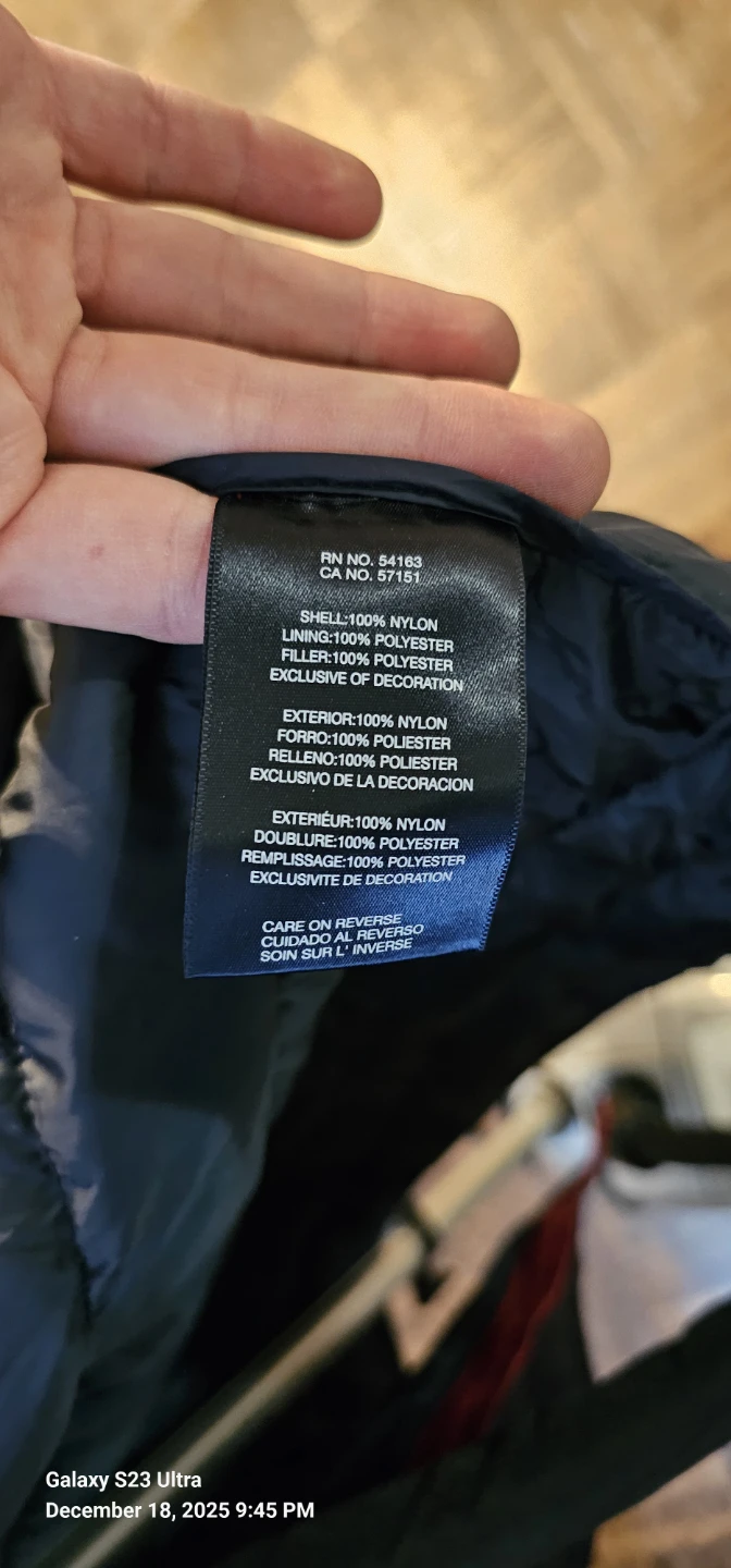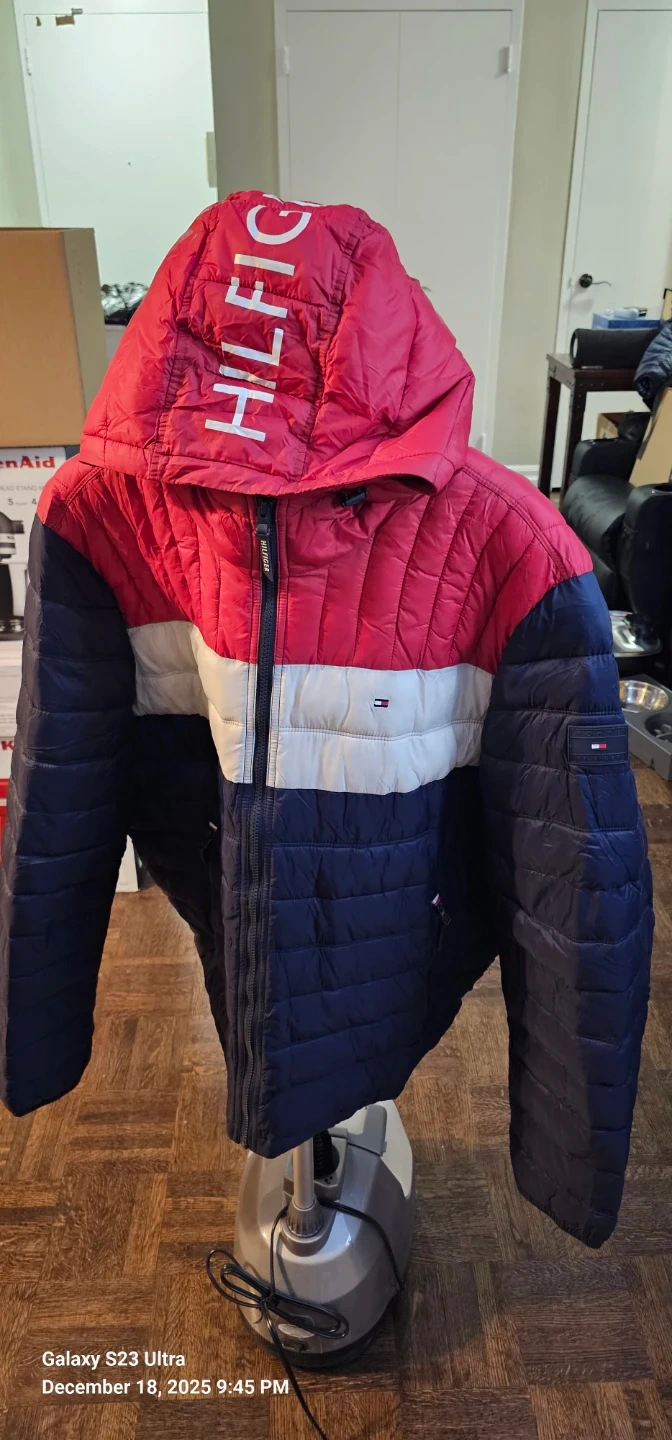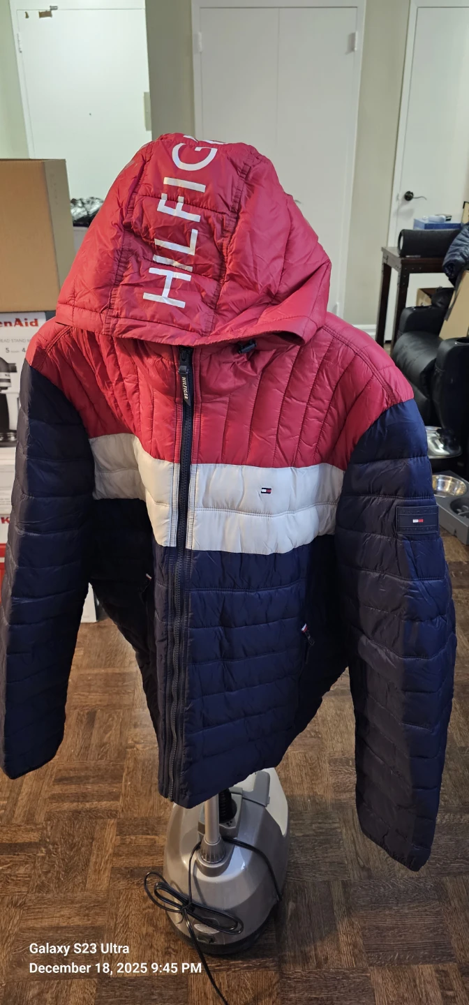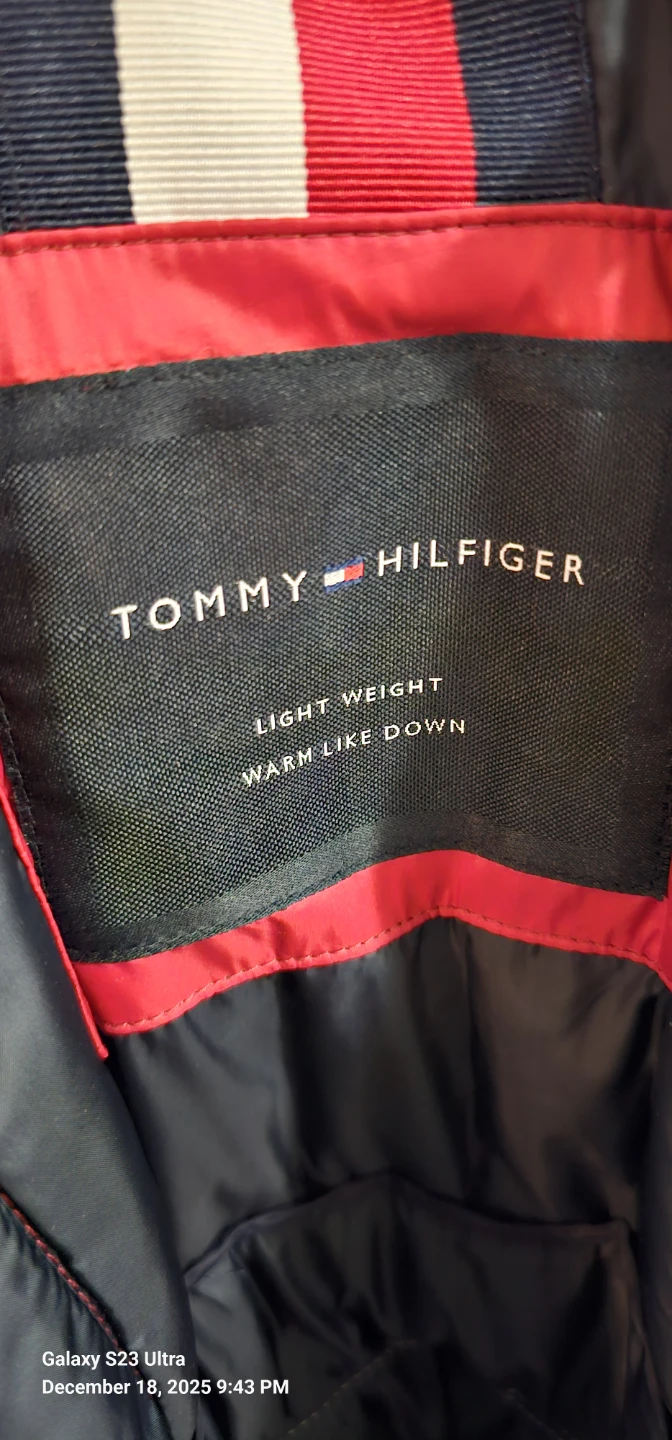 Tommy Hilfiger puffer jacket in size XXL. It's lightweight and warm like down. The shell is 100% nylon and the lining is 100% polyester. Perfect for staying cozy this winter!