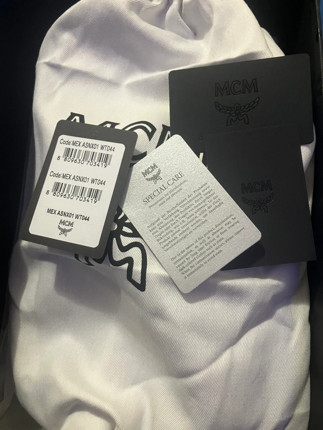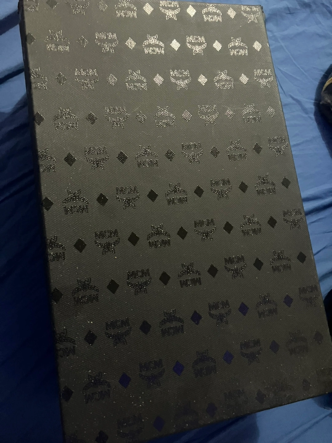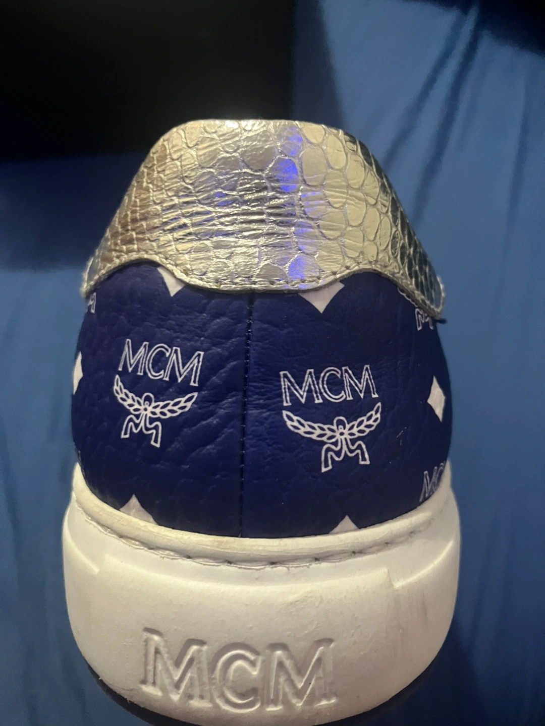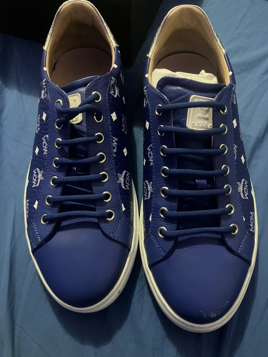 Selling a pair of MCM sneakers in blue leather. These have the classic MCM logo pattern. They're in good condition