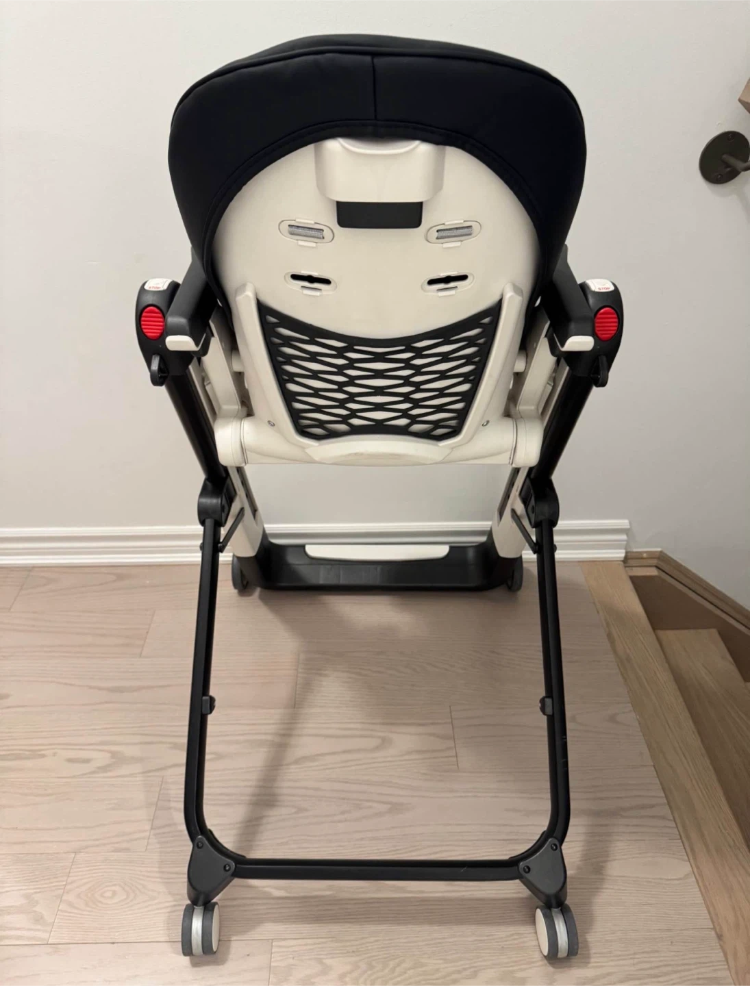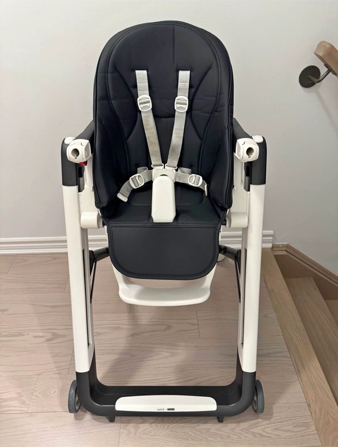 Selling a Peg Perego high chair, made in Italy! It features a black seat and a white frame. It has some wear on the straps, but is otherwise in good condition. Perfect for your little one's mealtime!