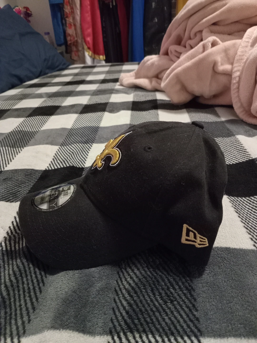 Selling a New Era 9TWENTY adjustable hat featuring the New Orleans Saints logo. It's in great condition and ready for a new fan! The hat is black with a gold Saints logo on the front and a New Era logo on the side. The adjustable strap ensures a comfortable fit.