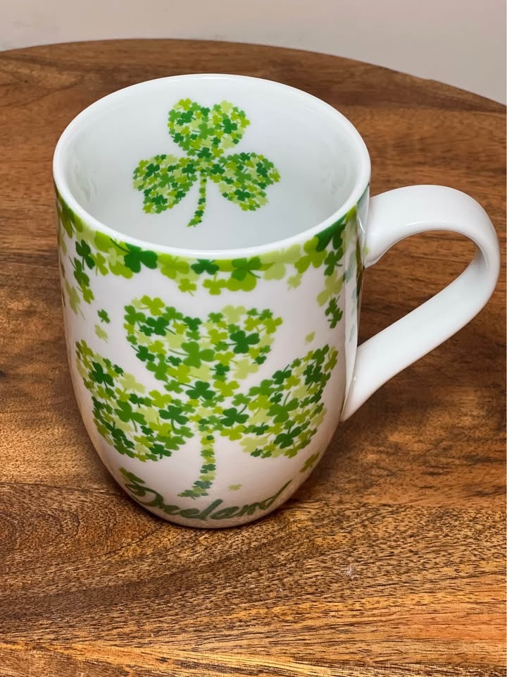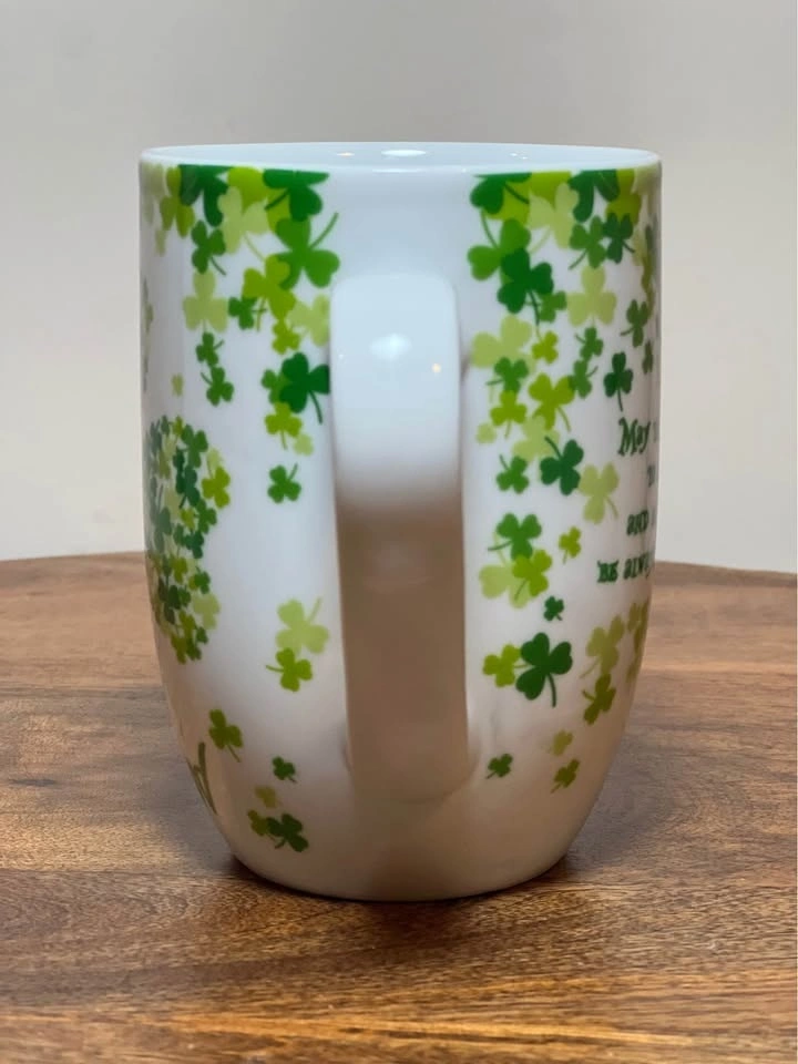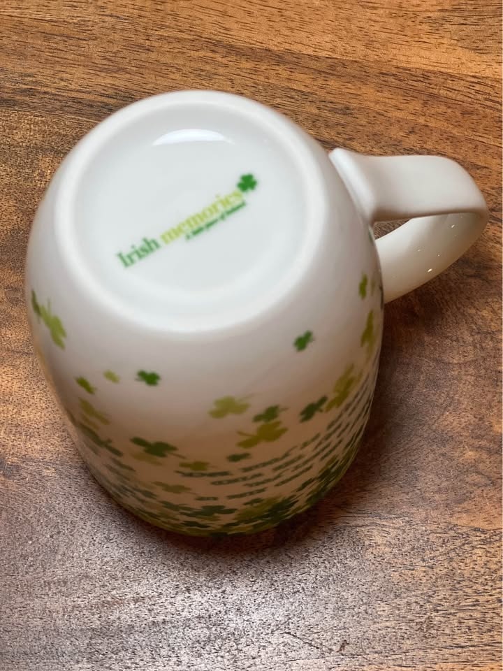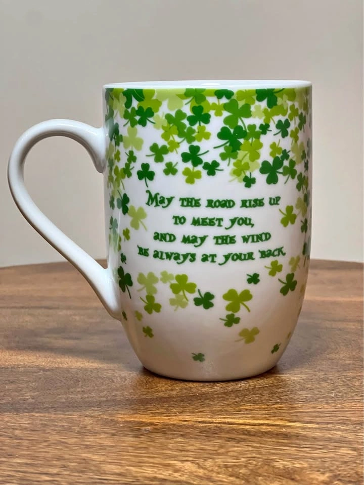 This is a white ceramic Irish Memories Shamrock Mug. The mug features a large shamrock graphic made up of smaller green shamrocks. The word "Ireland" is written in a green script font below the main graphic. It is a souvenir item associated with Irish culture and St. Patrick's Day. The shamrock symbol represents the Holy Trinity in Irish Christianity. The mug also features a traditional Irish blessing printed in the center, surrounded by delicate sprigs of green clover. The text reads, "May THE ROAD RISE UP TO MEET YOU, AND May THE WIND BE always at your BACK". A clover made from multiple smaller clovers is featured inside the mug. Preowned. Pickup is 58th and 7th ave in midtown Manhattan