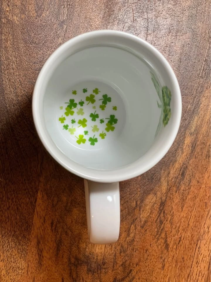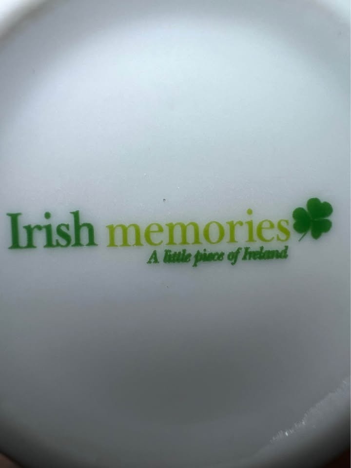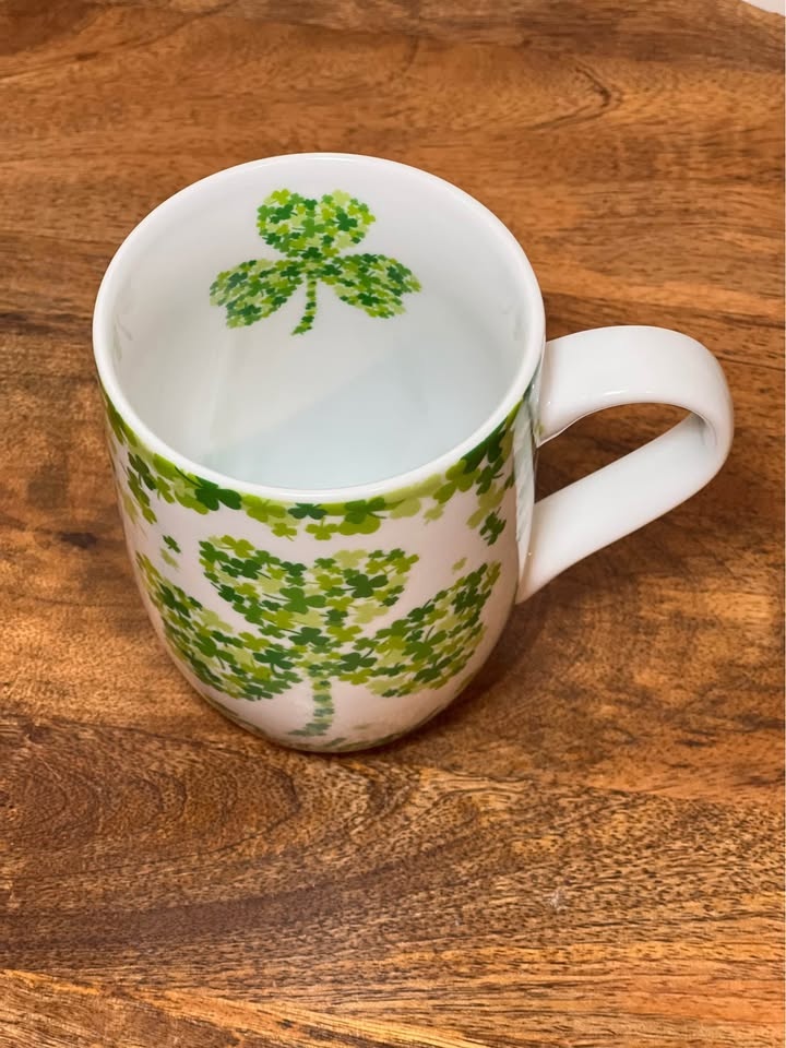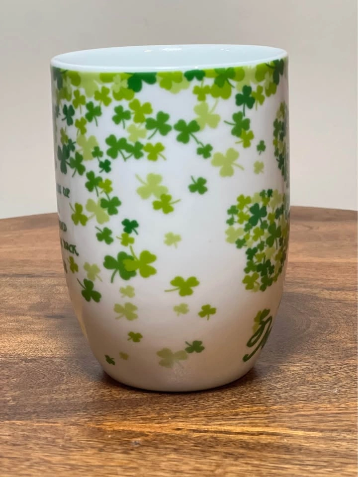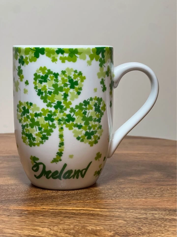 This is a white ceramic Irish Memories Shamrock Mug. The mug features a large shamrock graphic made up of smaller green shamrocks. The word "Ireland" is written in a green script font below the main graphic. It is a souvenir item associated with Irish culture and St. Patrick's Day. The shamrock symbol represents the Holy Trinity in Irish Christianity. The mug also features a traditional Irish blessing printed in the center, surrounded by delicate sprigs of green clover. The text reads, "May THE ROAD RISE UP TO MEET YOU, AND May THE WIND BE always at your BACK". A clover made from multiple smaller clovers is featured inside the mug. Preowned. Pickup is 58th and 7th ave in midtown Manhattan