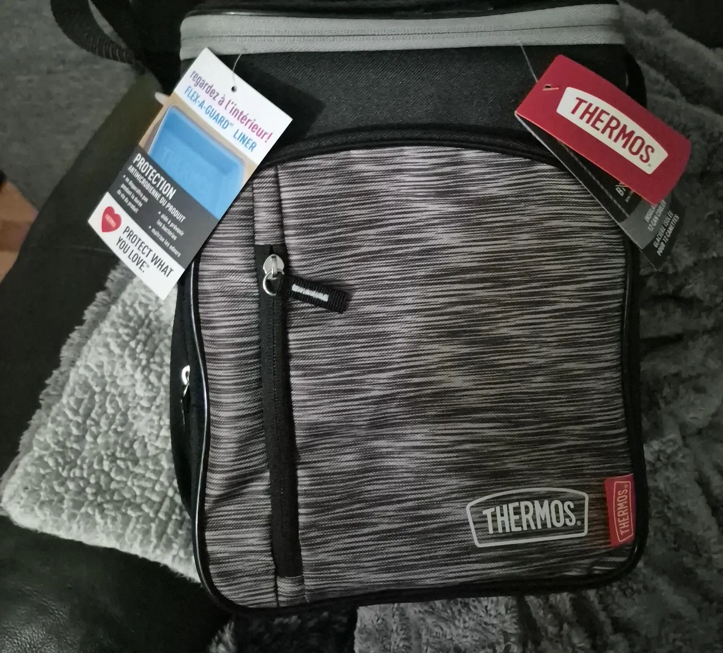 I'm selling a brand new Thermos 12-can cooler bag! It features a Flex-A-Guard liner for protection and is antimicrobial. It also helps to prevent bacteria and control odours. Perfect for keeping your drinks and snacks cool on the go!