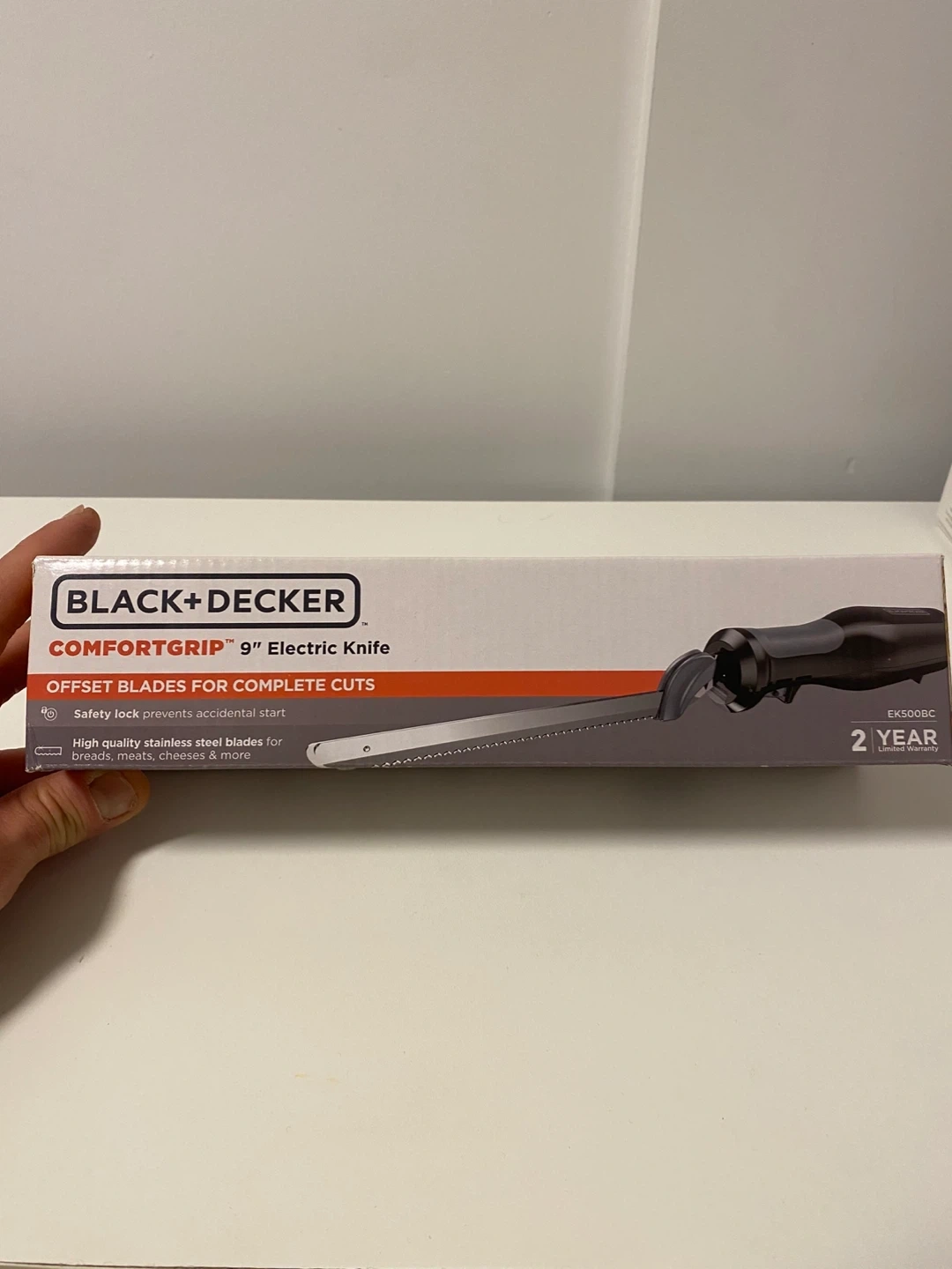 Selling a brand new Black+Decker ComfortGrip 9" Electric Knife! This knife features offset blades for complete cuts and a safety lock to prevent accidental starts. It also has high-quality stainless steel blades perfect for breads, meats, cheeses, and more. The box is included!