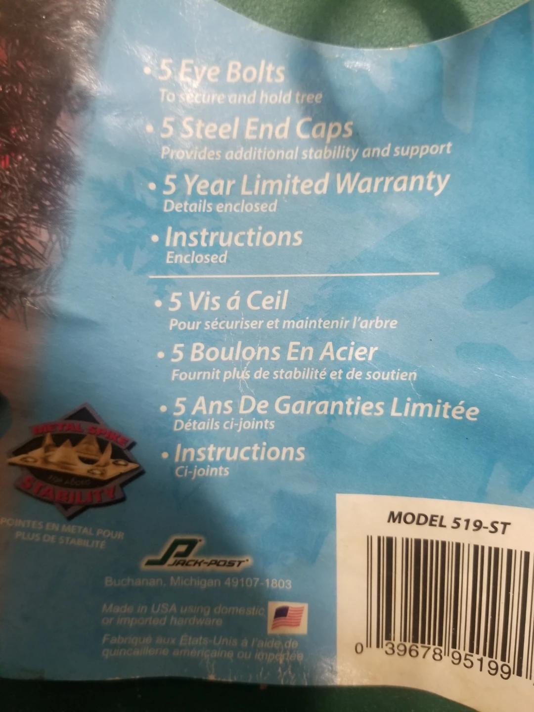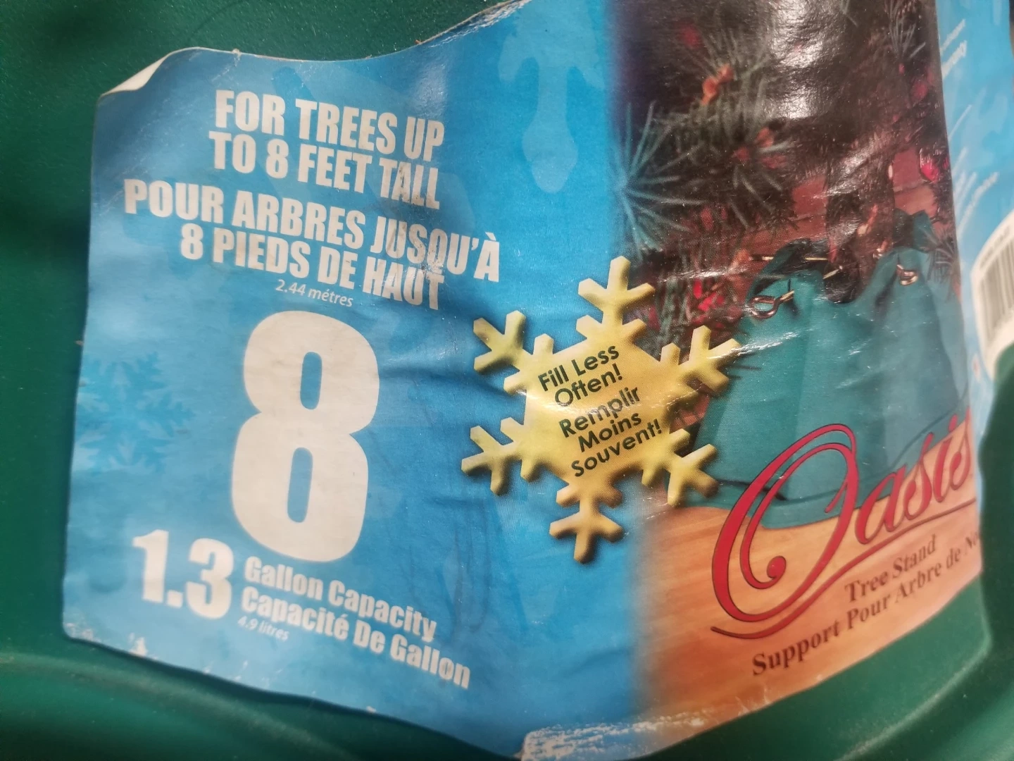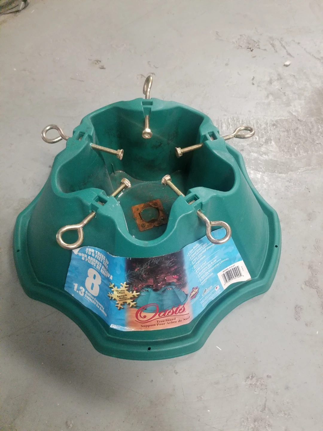Selling a Jack-Post Oasis tree stand. It's green and holds trees up to 8 feet tall. It has a 1.3-gallon capacity and includes 5 eye bolts for additional stability.
