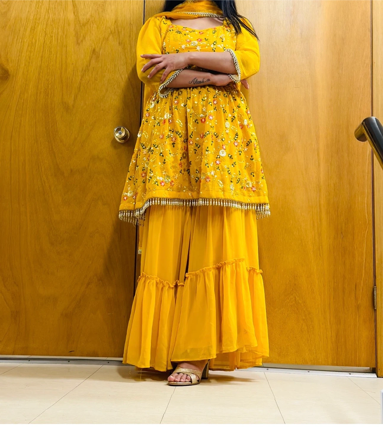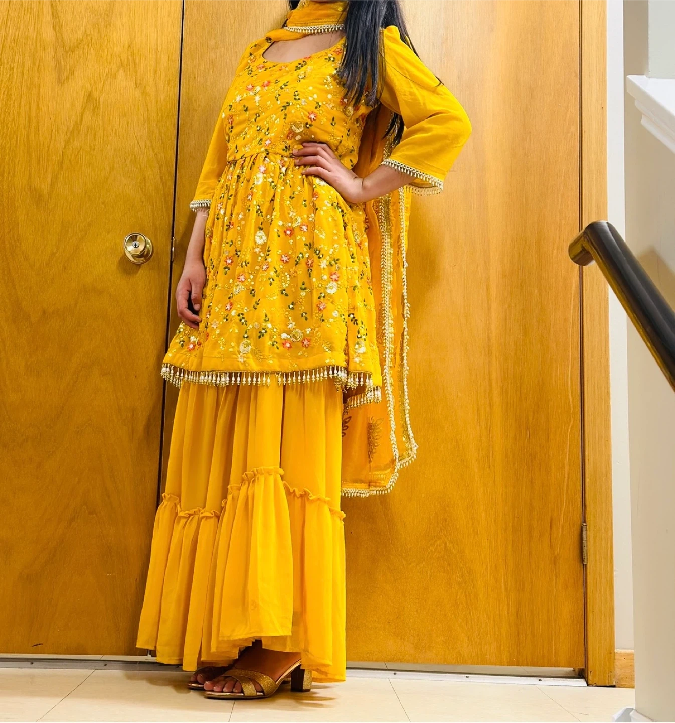 Beautiful yellow outfit very pretty duppata with intricate embroidery. Perfect for special occasions or adding a pop of colour to your wardrobe!