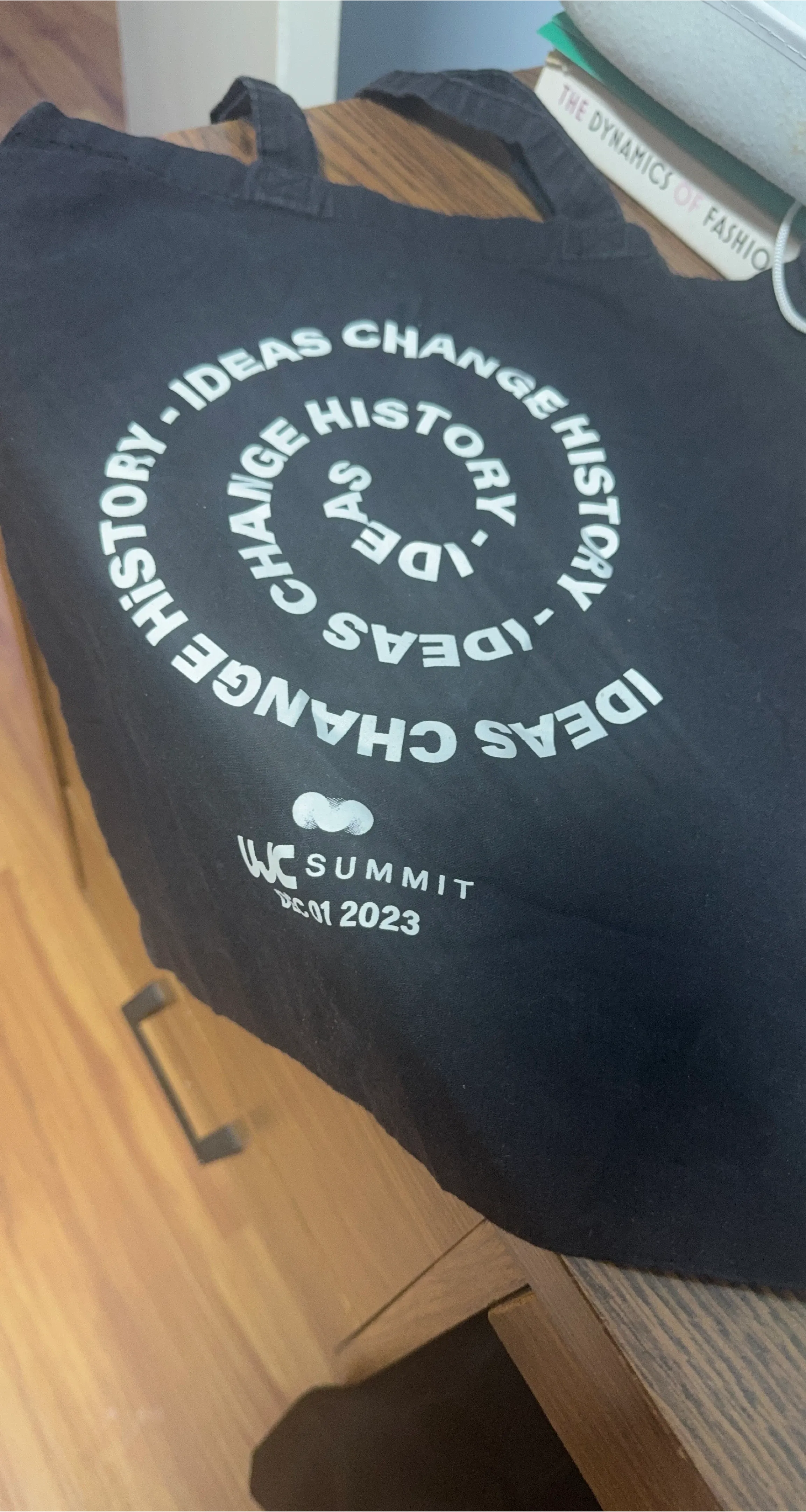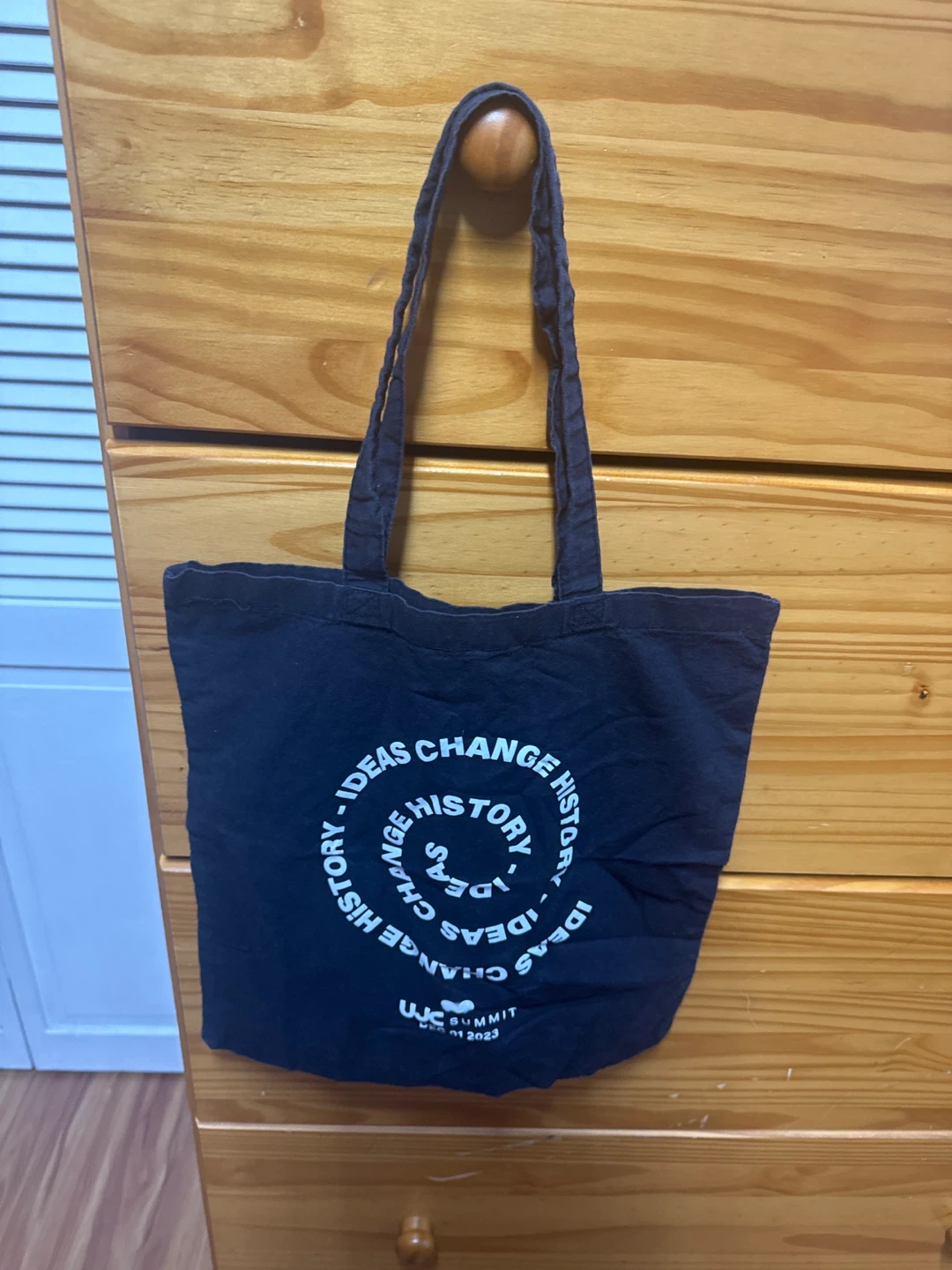 I'm selling a black tote bag with the design 'Ideas Change History' printed on it. It also has 'IWC Summit DC.01 2023' printed near the bottom. It's in good condition and perfect for carrying books or groceries Measurements are the following: Length = 15 3/4 inches Width = 14 1/2 inches