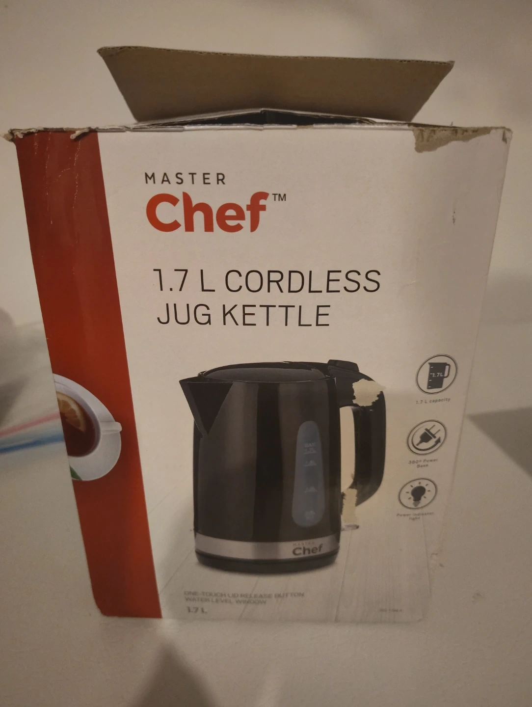 Selling a Master Chef 1.7 L cordless jug kettle. It has a 1.7L capacity and a 360° power base. It also features a one-touch lid release button and a water level window. Box is a bit ripped but product is good to use.