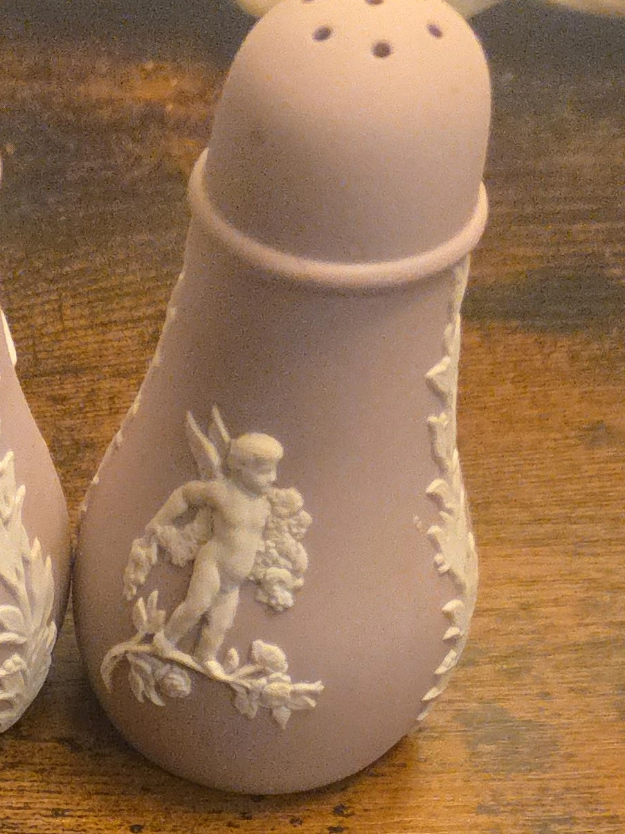 Here are a pair of Wedgwood Jasperware salt and pepper shakers! They're a lovely lilac colour with white bas-relief decorations.