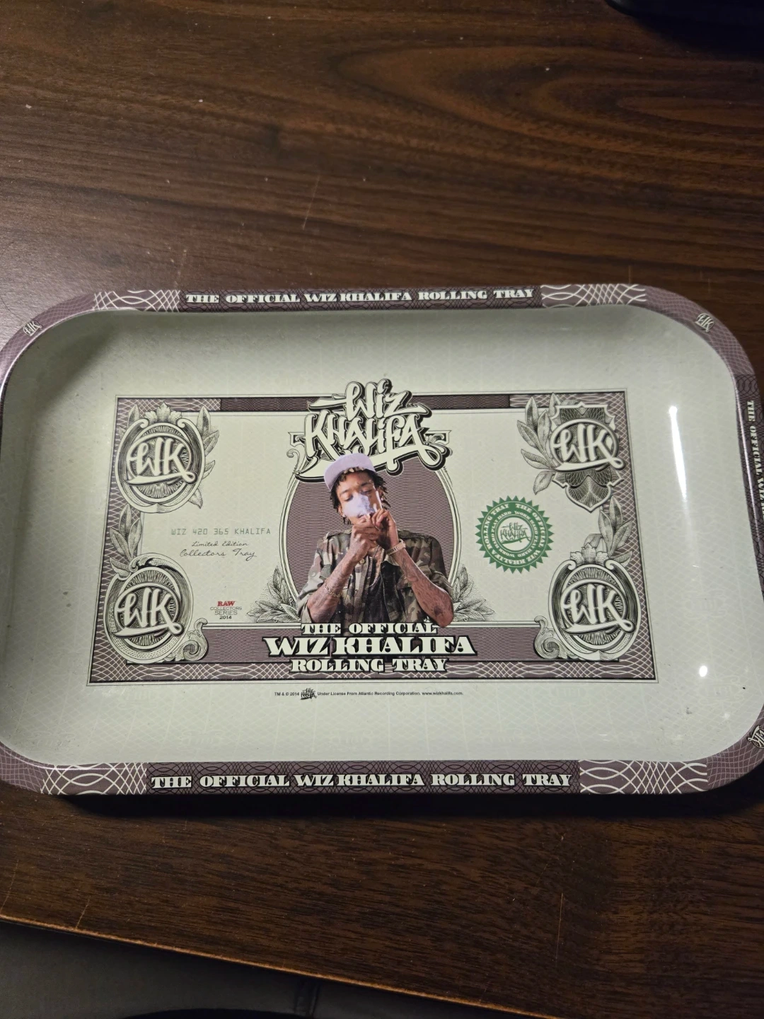 This is the official Wiz Khalifa rolling tray. It's a limited edition collectors item. Metal construction with a printed graphic design.