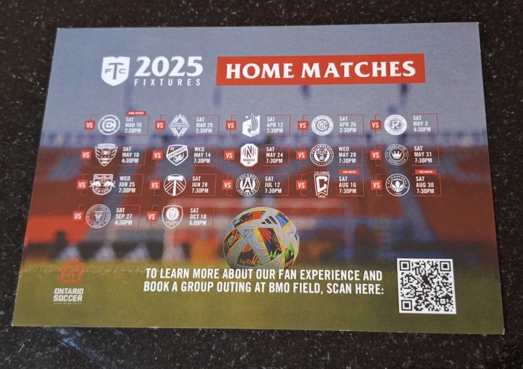 Gifting a 2025 TFC magnetic schedule of home matches. Perfect for a soccer fan who wants a memento or who wants to cut it and make individual magnets - soccer ball, TFC shield, etc