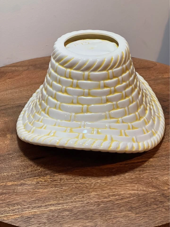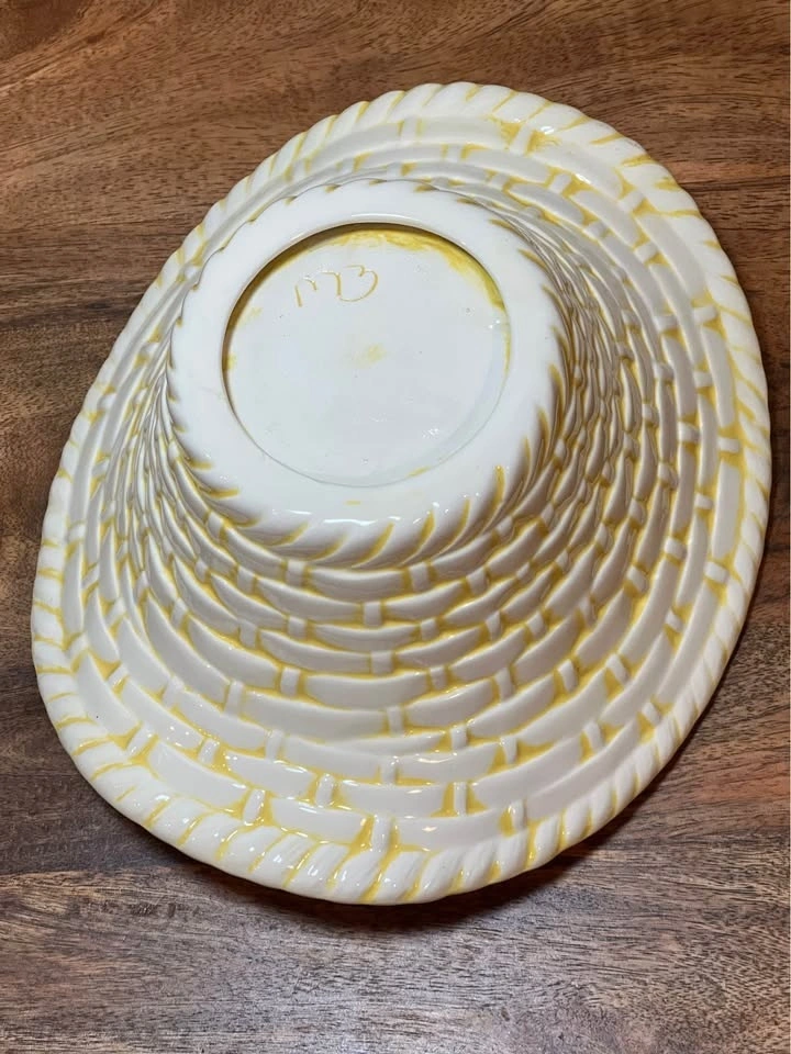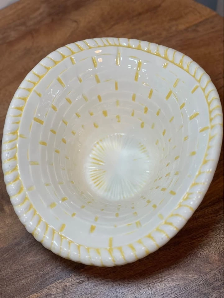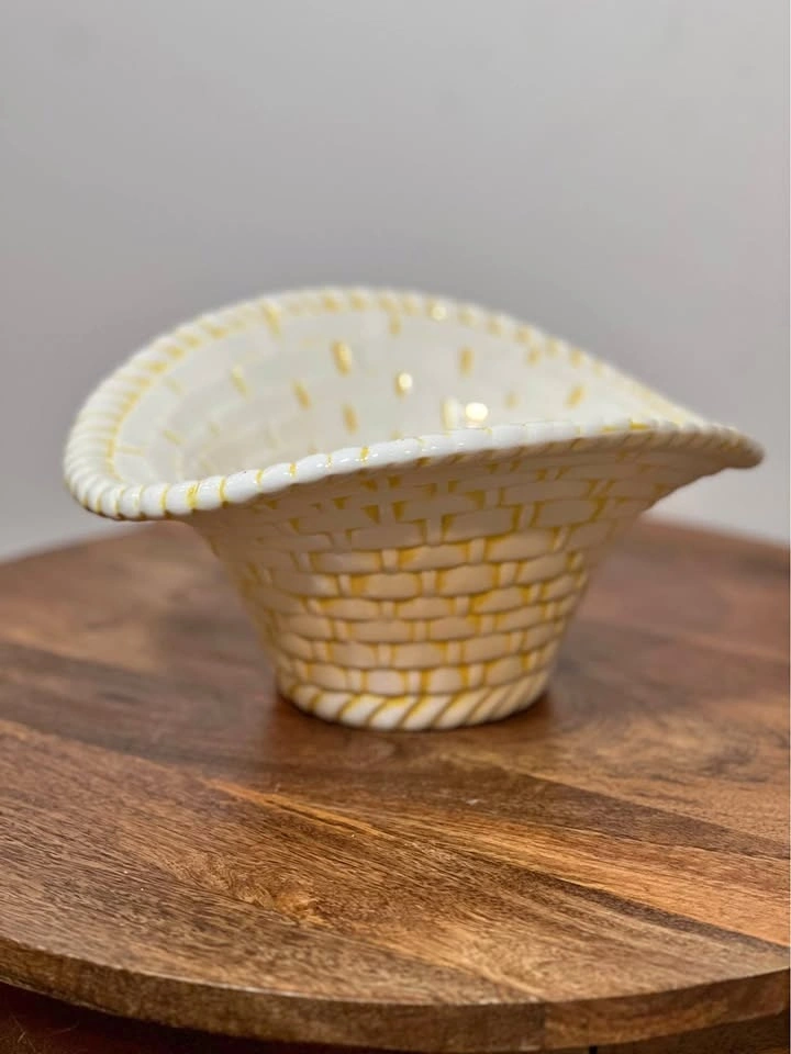 Color: Primarily white, with hand-painted yellow detailing on the rim and weave intersections.