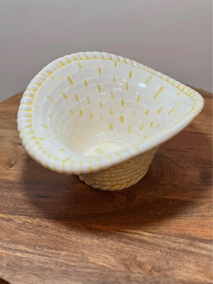 This item is a vintage ceramic basket weave bowl or dish, often referred to as a "reticulated" or "open weave" ceramic piece. The white glaze features distinct hand-painted yellow accents that highlight the woven texture, creating a cheerful, cottage-core aesthetic.