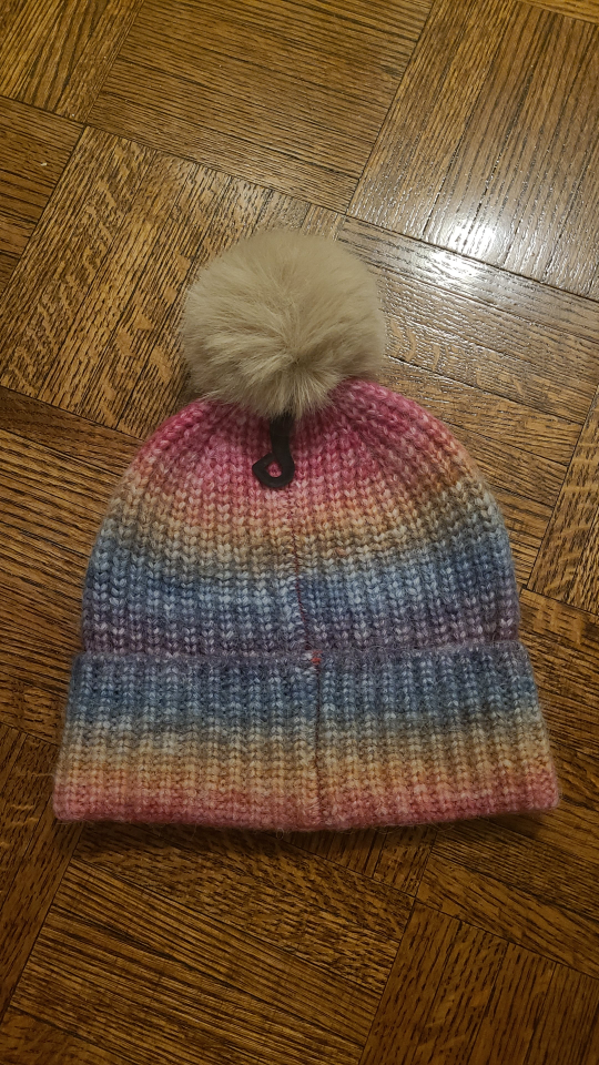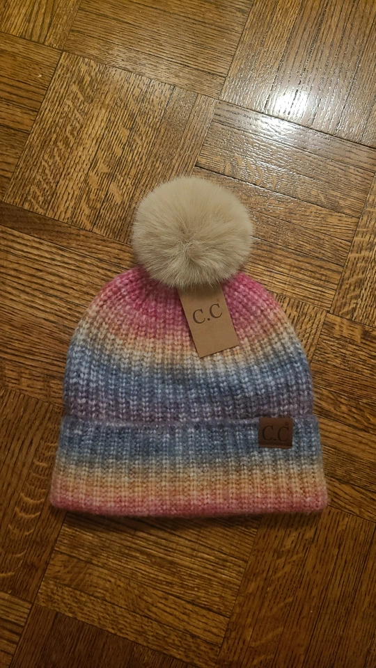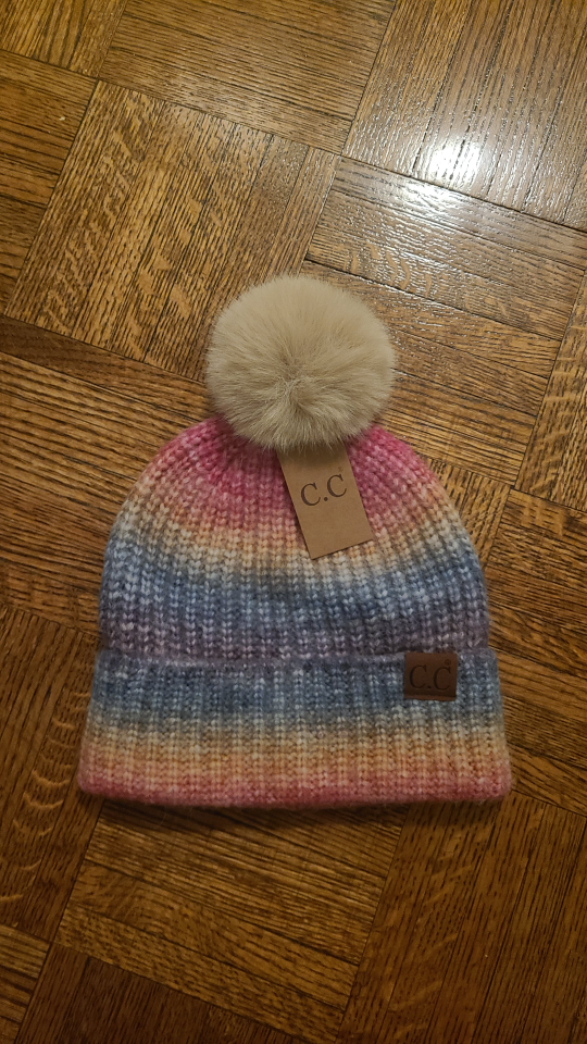 Cute C.C. brand beanie with a fluffy pom pom on top! It features a lovely rainbow knit design that adds a pop of colour to any outfit. Perfect for staying warm and stylish during the colder months