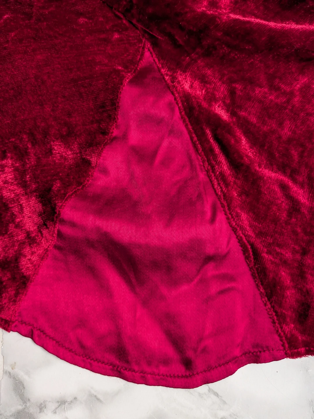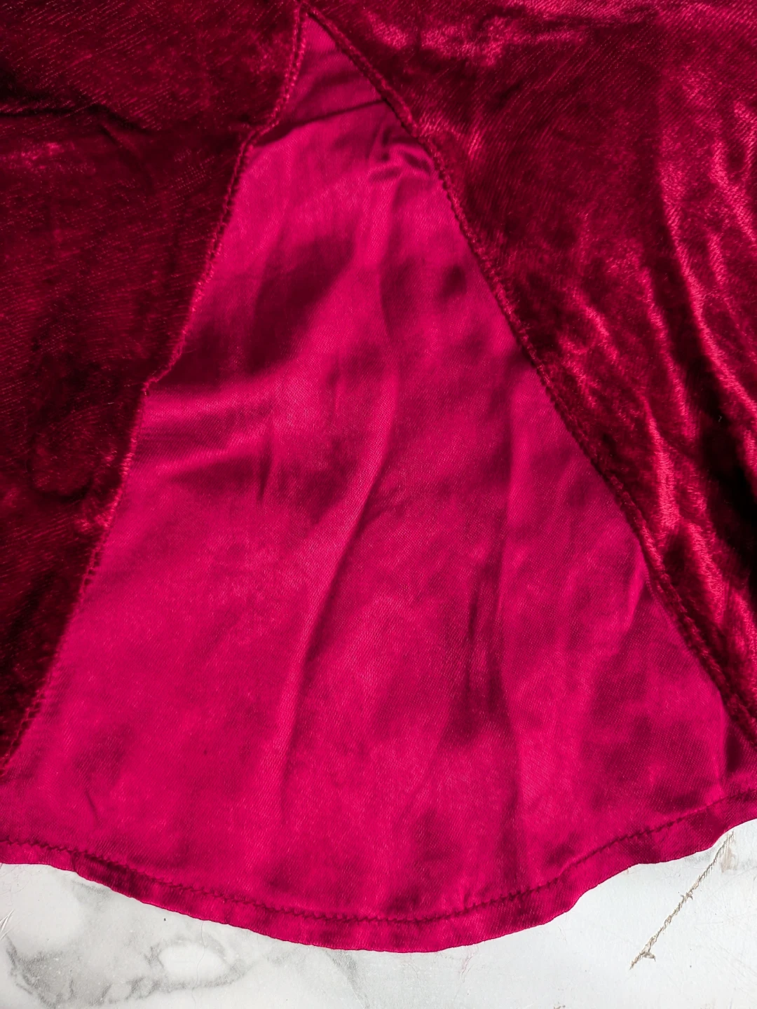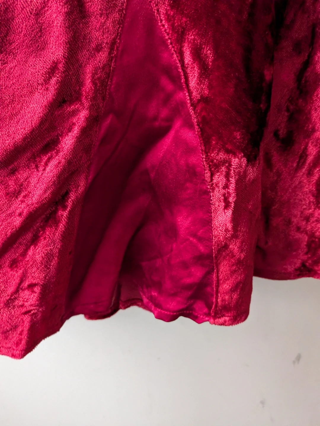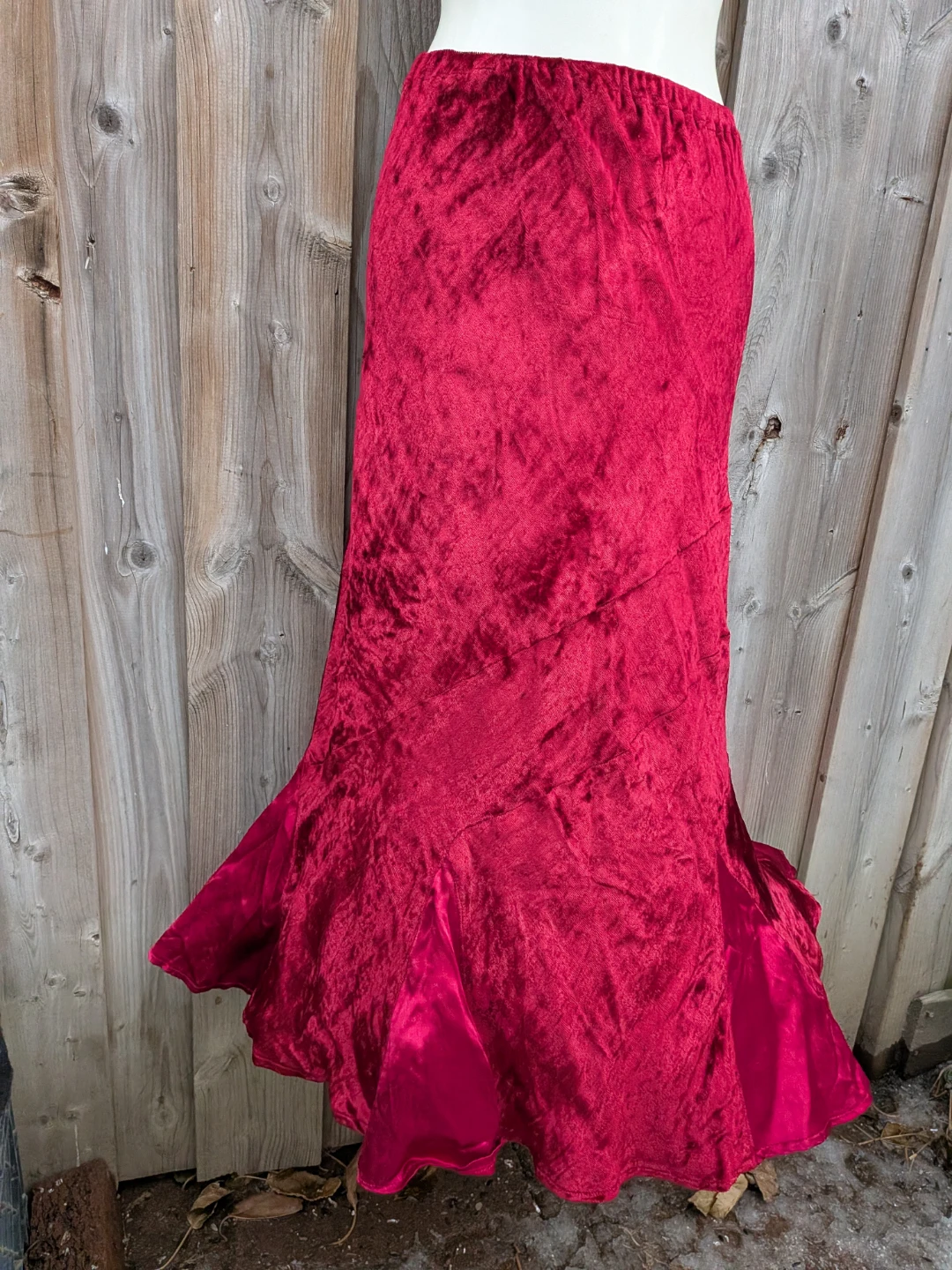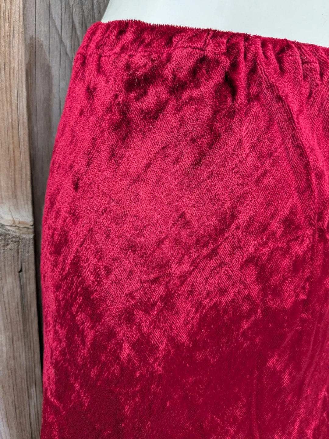 A lovely vintage red velvet maxi skirt from April Cornell. The skirt has a unique design with a slight flare at the bottom. Perfect for adding a touch of elegance to any outfit