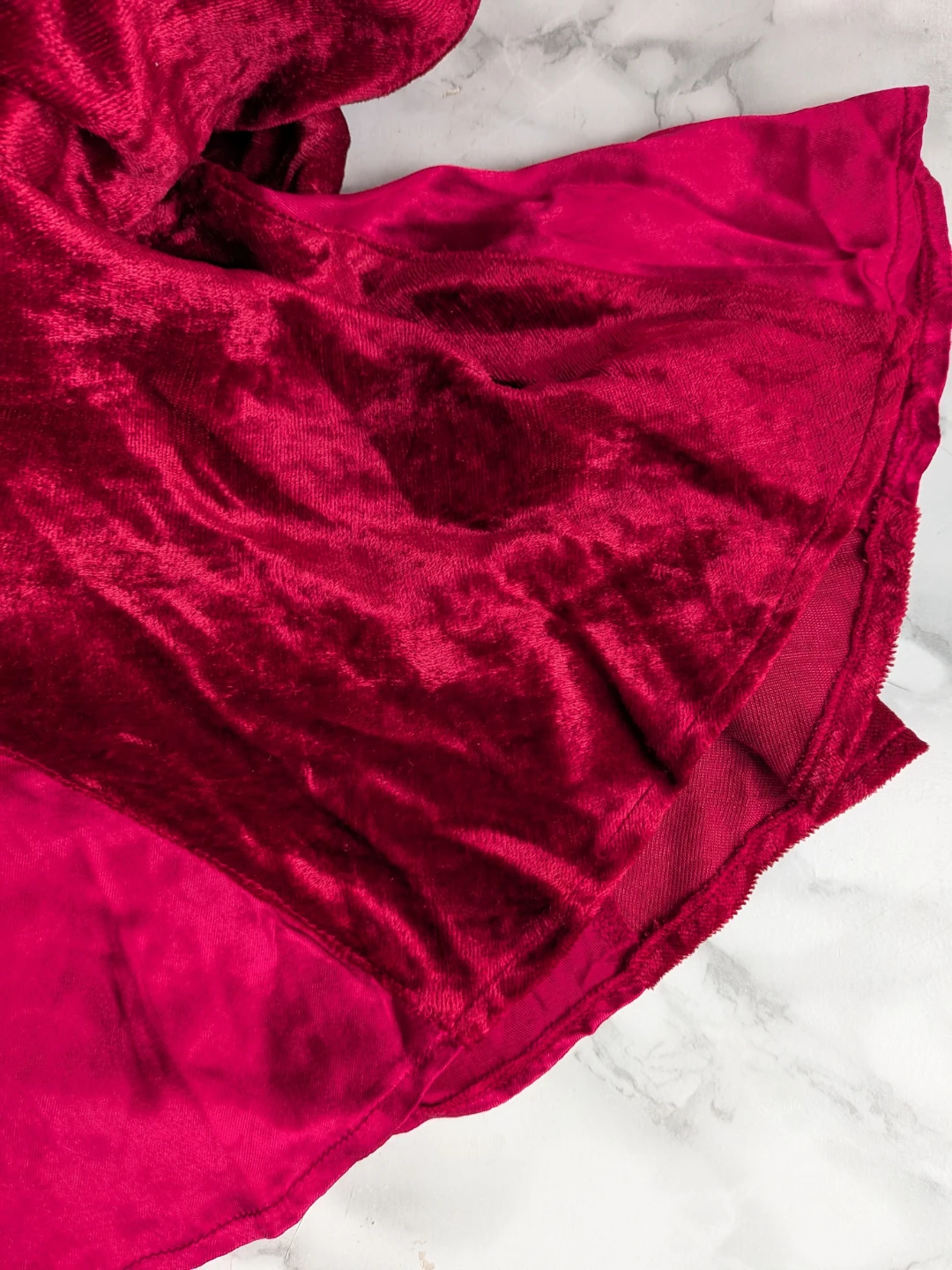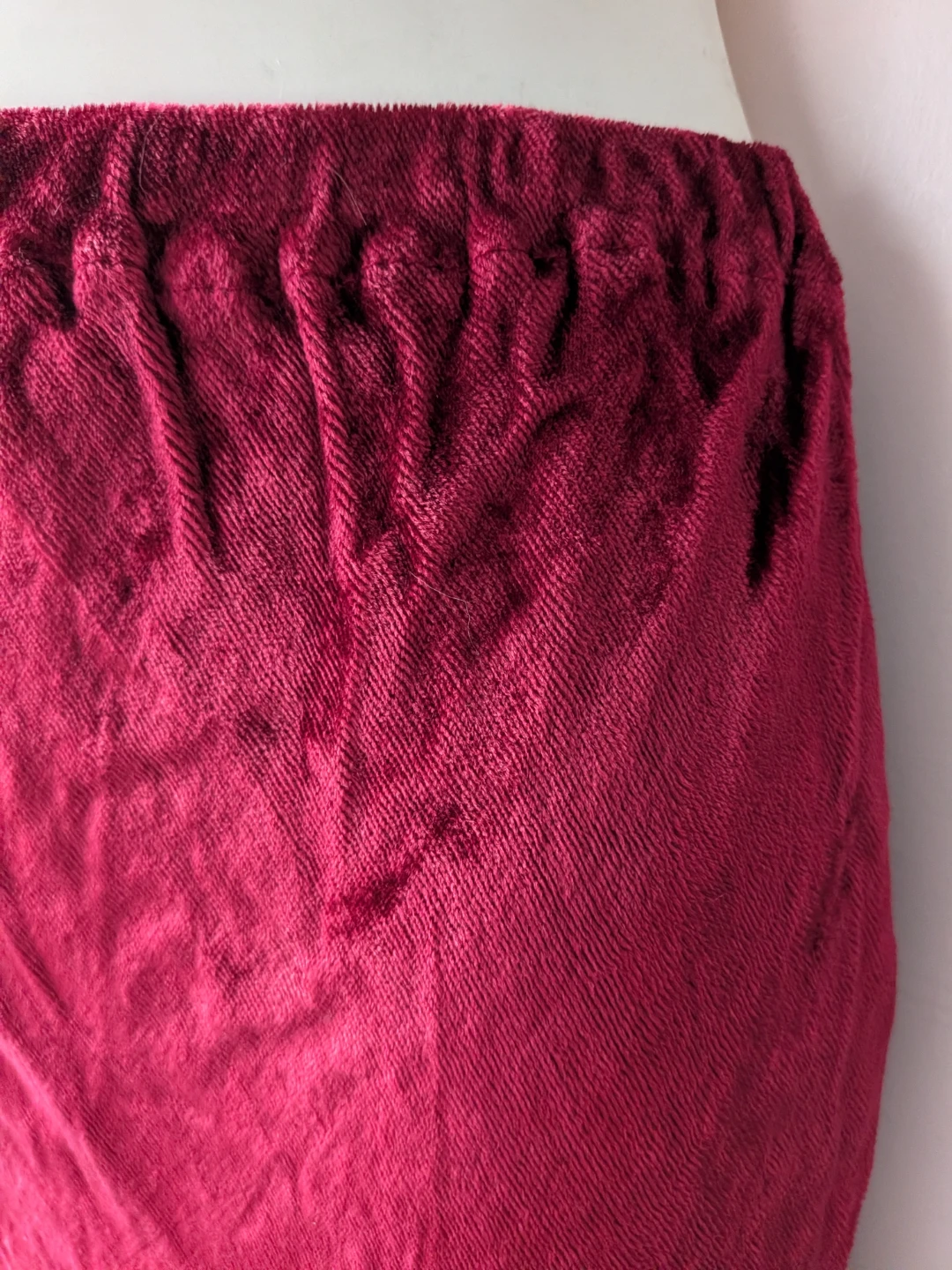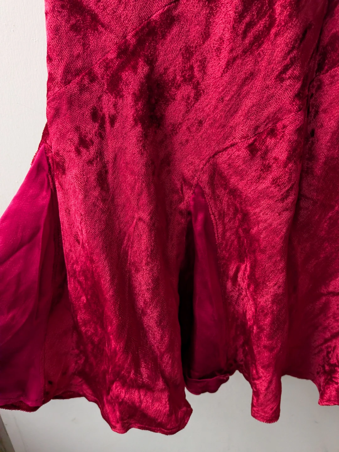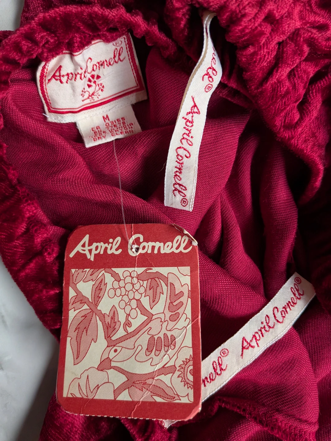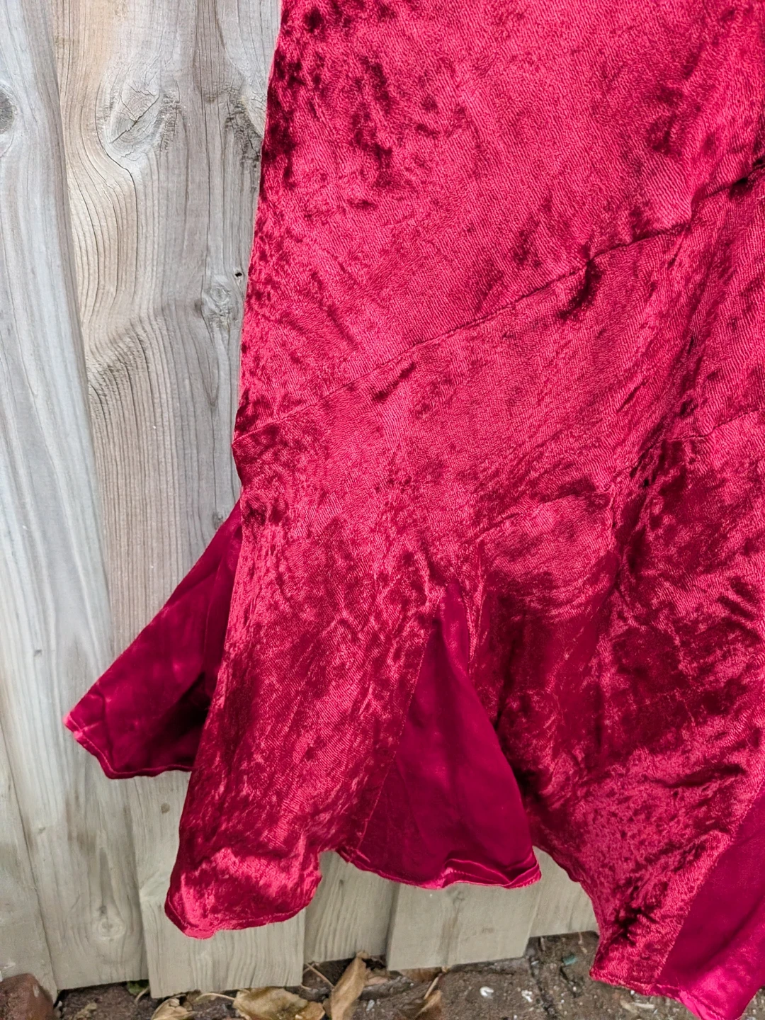 A lovely vintage red velvet maxi skirt from April Cornell. The skirt has a unique design with a slight flare at the bottom. Perfect for adding a touch of elegance to any outfit