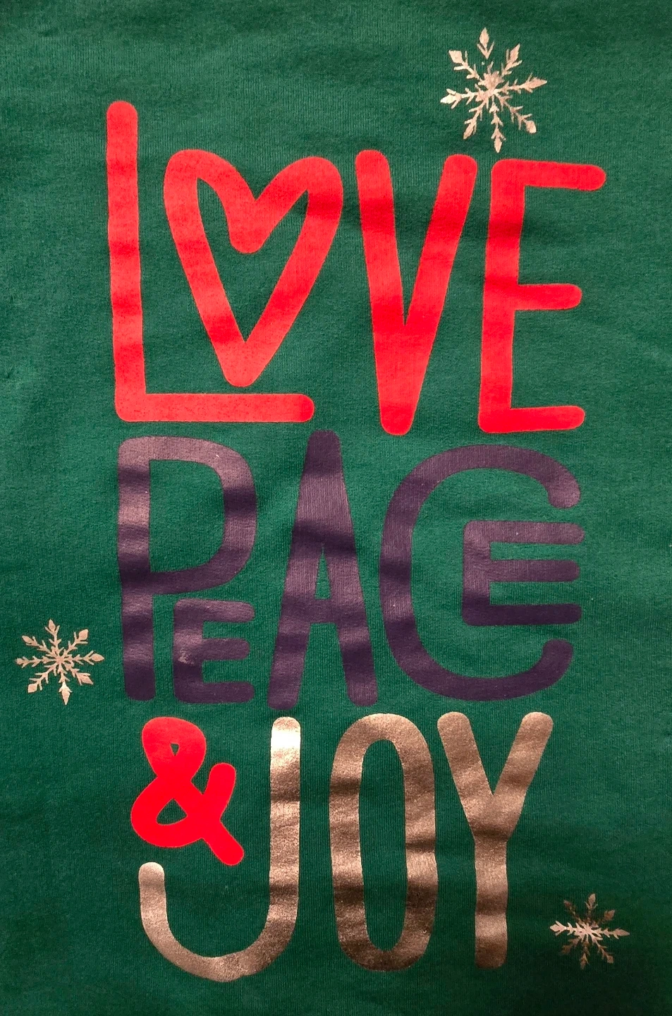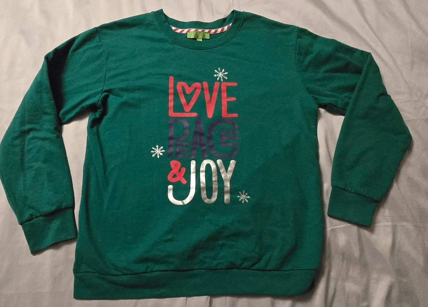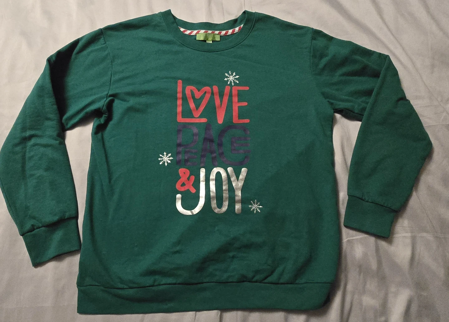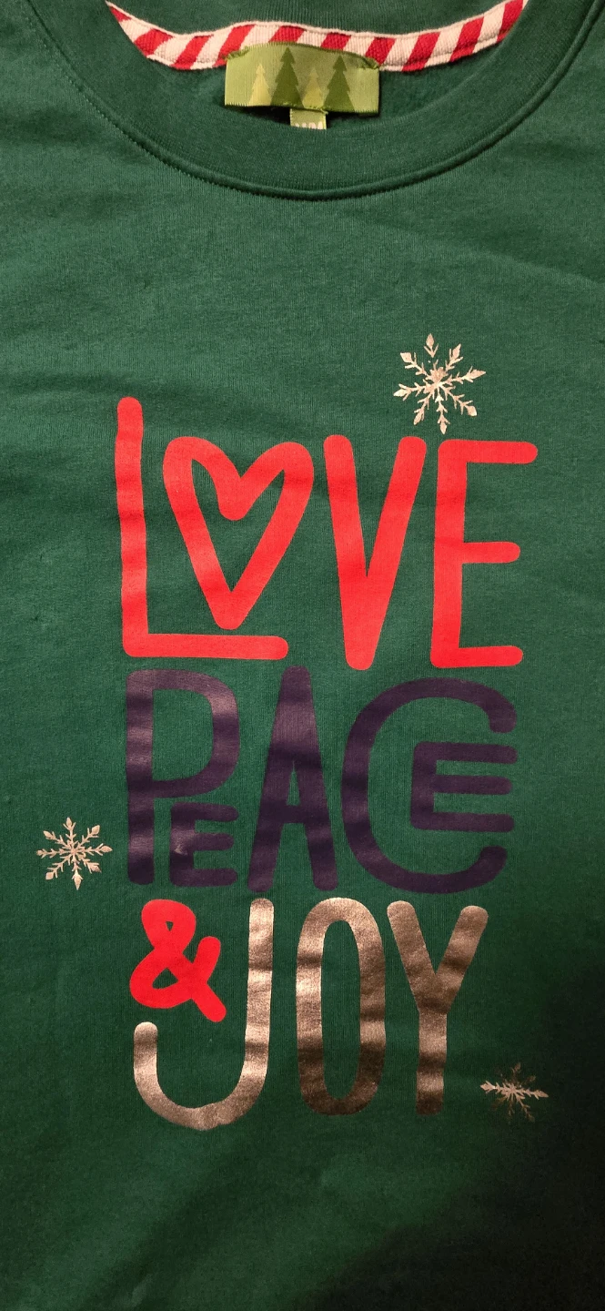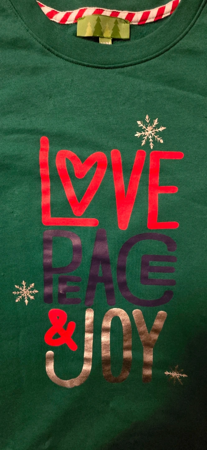 Cozy green sweater with a festive 'Love Peace & Joy' design! It's a size medium, perfect for staying warm and spreading some cheer!