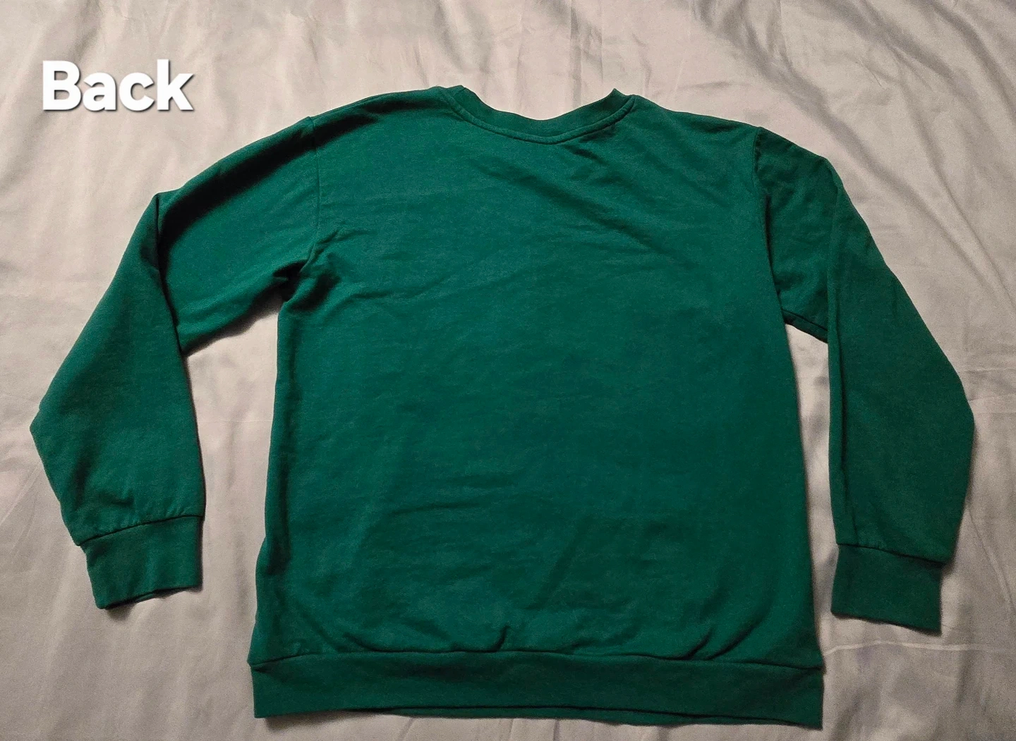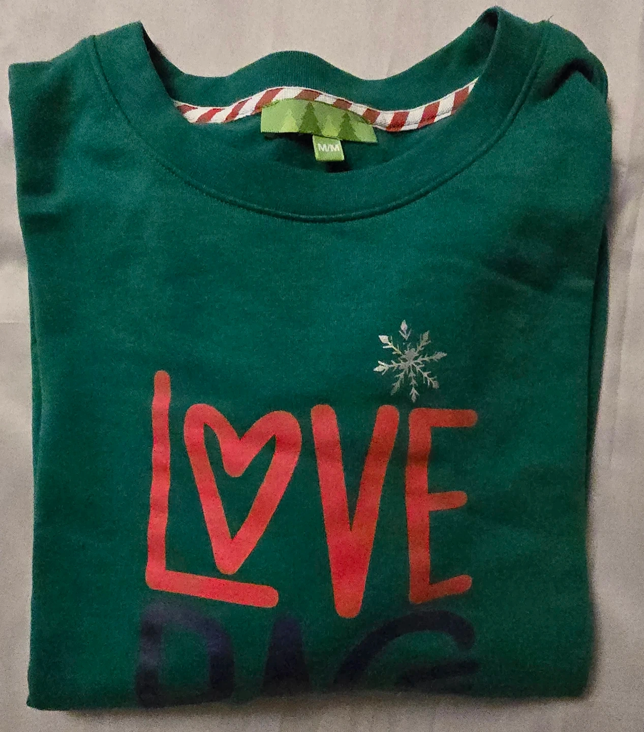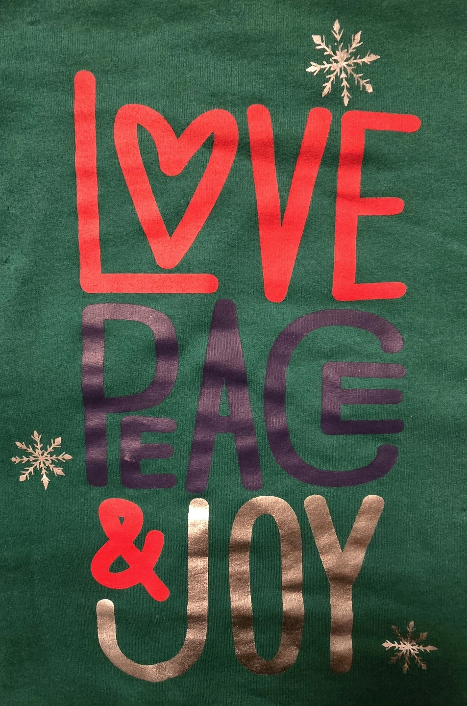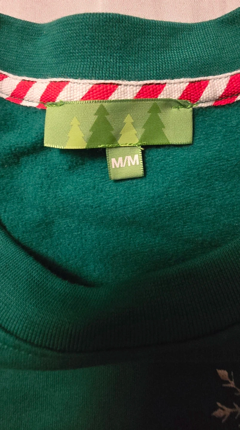 Cozy green sweater with a festive 'Love Peace & Joy' design! It's a size medium, perfect for staying warm and spreading some cheer!