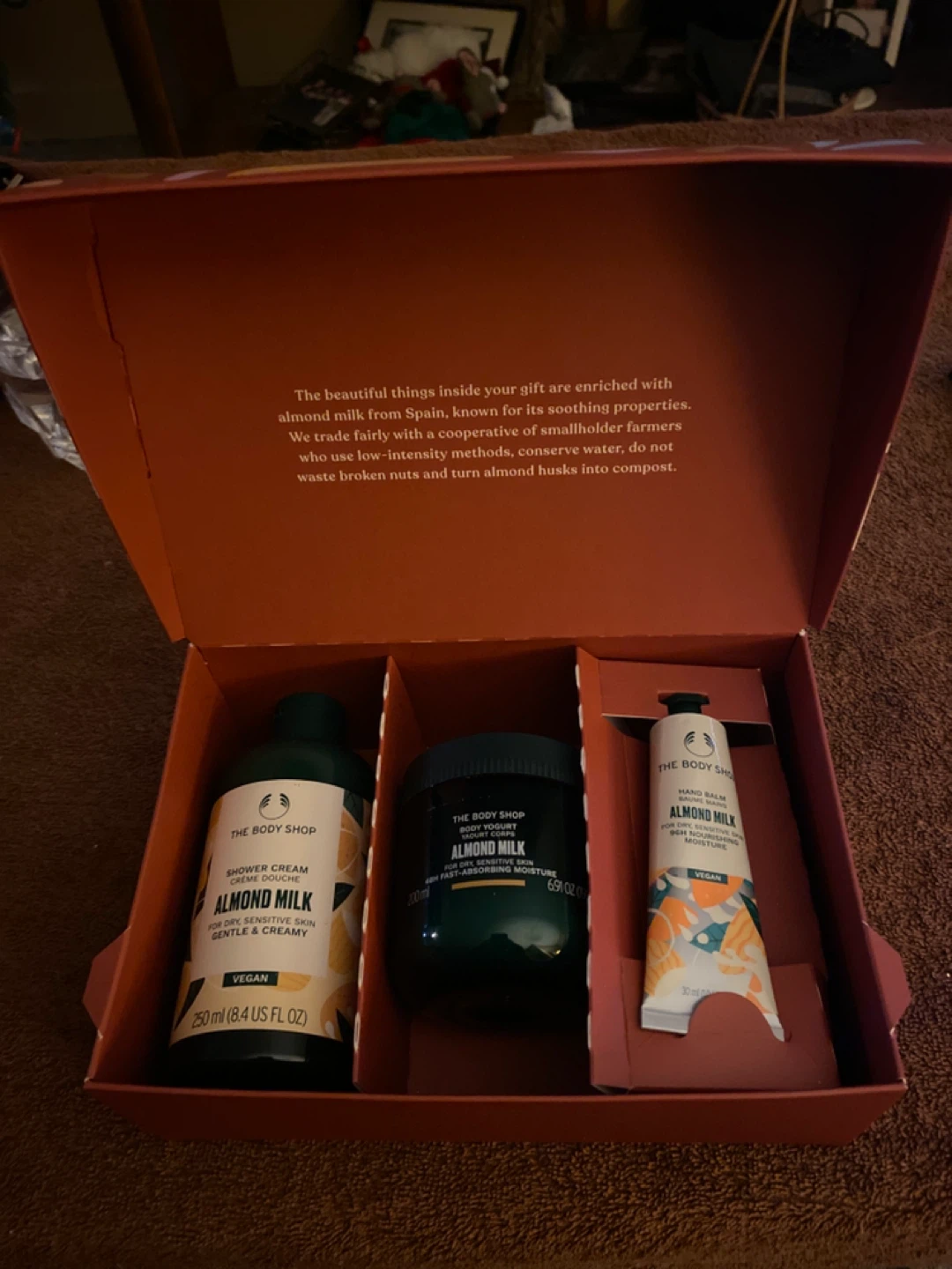 The Body Shop Almond Milk Essentials Gift Set! It includes shower cream, body yogurt, and hand balm. The beautiful things inside your gift are enriched with almond milk from Spain, known for its soothing properties. This set is perfect for dry, sensitive skin and provides gentle and creamy moisture