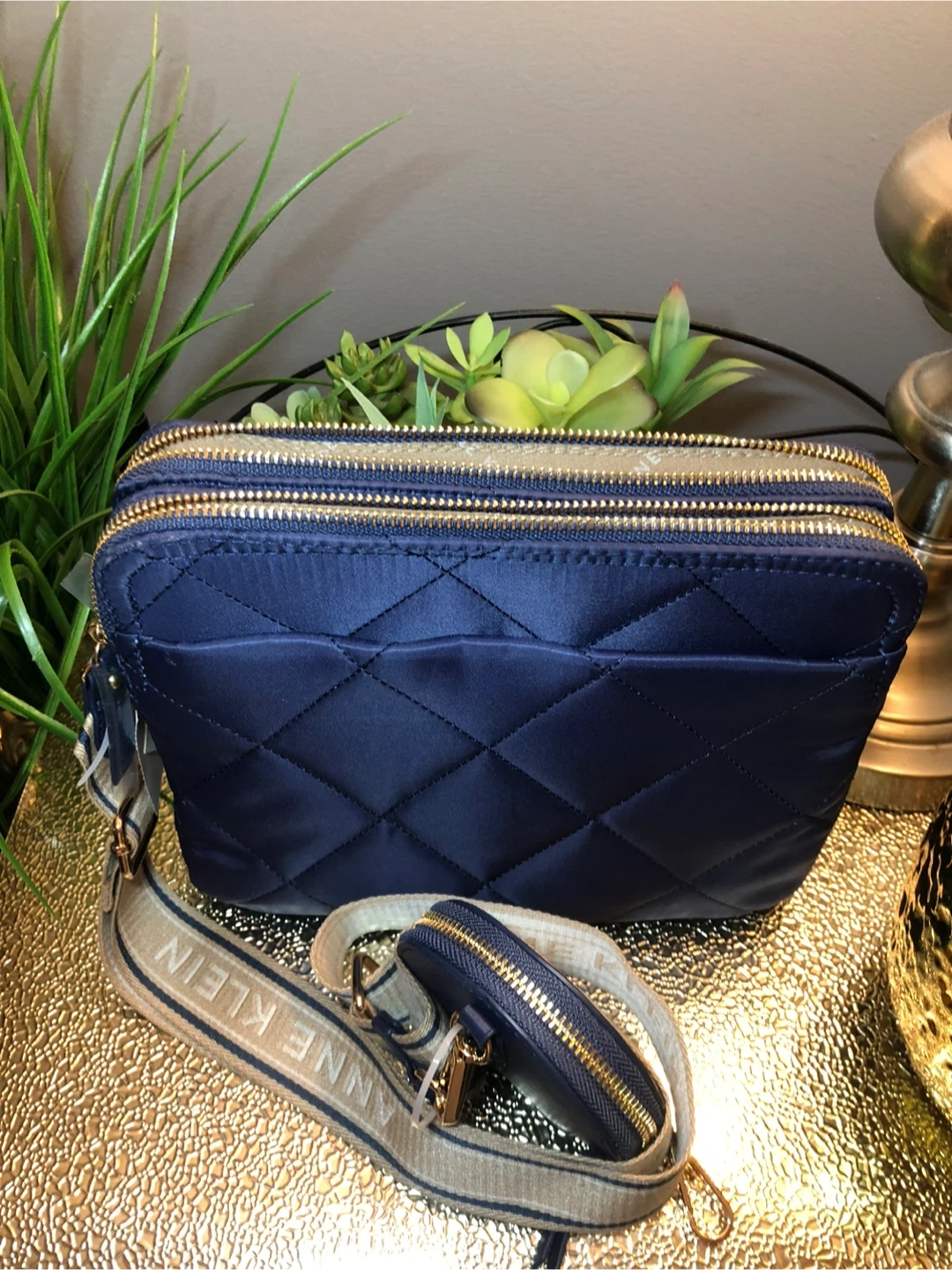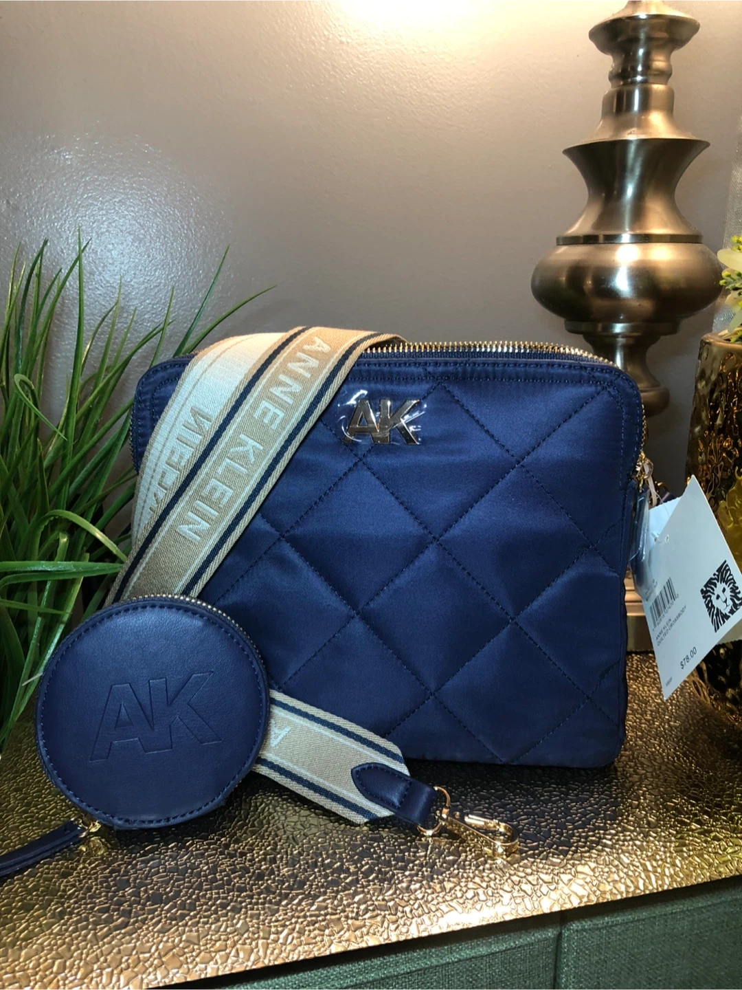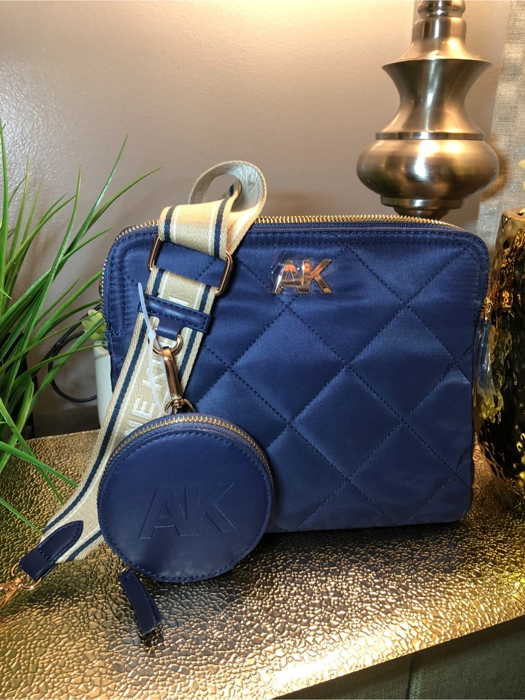 This is a beautiful Anne Klein quilted crossbody bag in a lovely navy blue color. It comes with a matching coin purse and a stylish strap with the Anne Klein name on it. Perfect for adding a touch of elegance to any outfit!