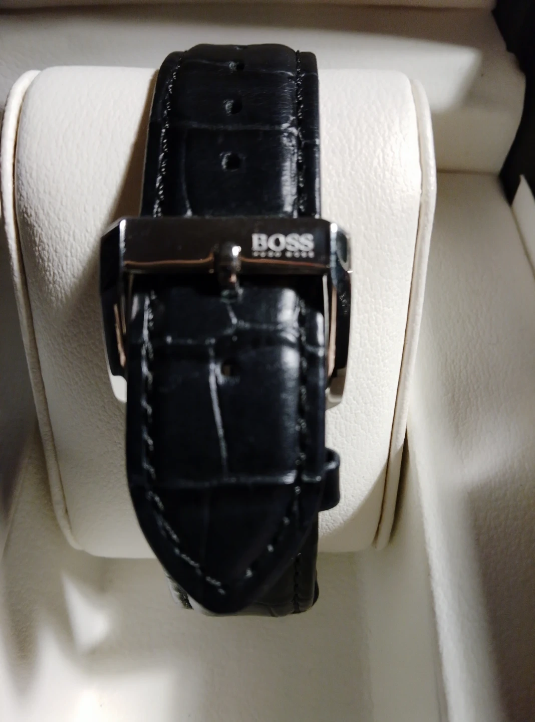 Selling a Hugo Boss watch with a black leather strap. It's in new condition and comes with the box. The watch features a sleek, rectangular design with a blue face. Box has some wear and tear on it