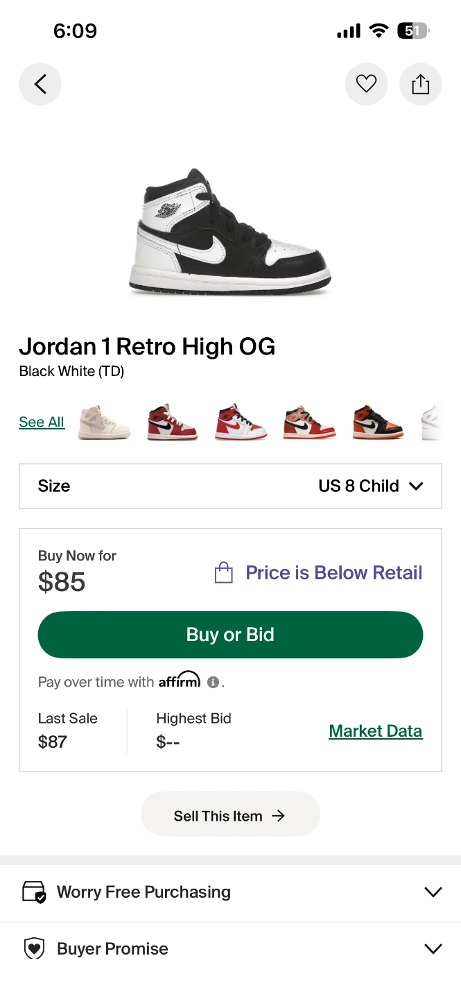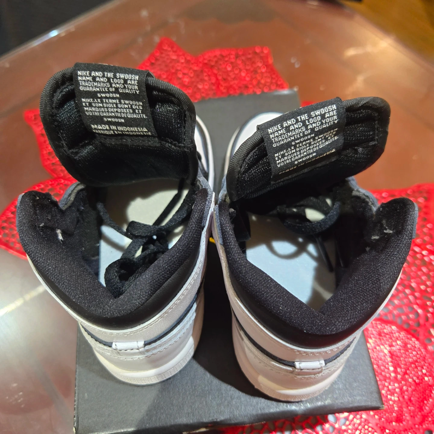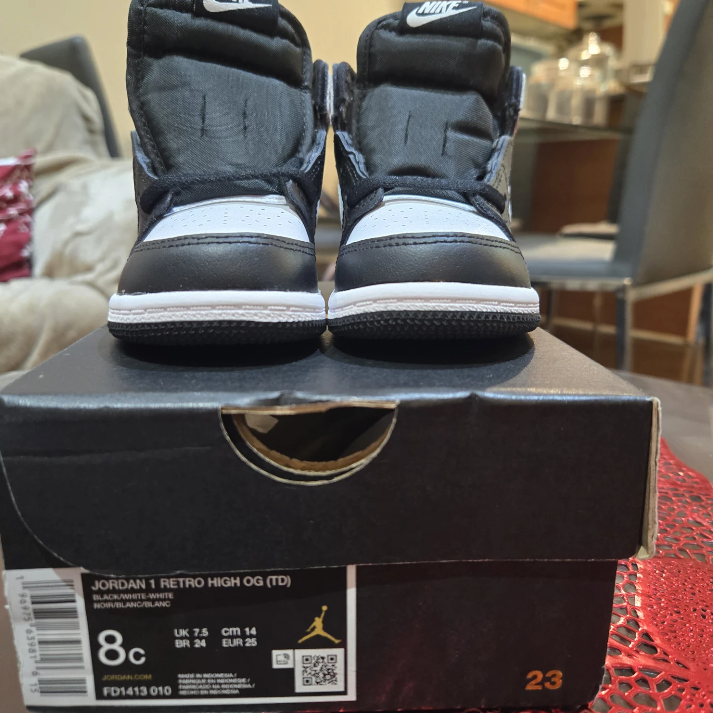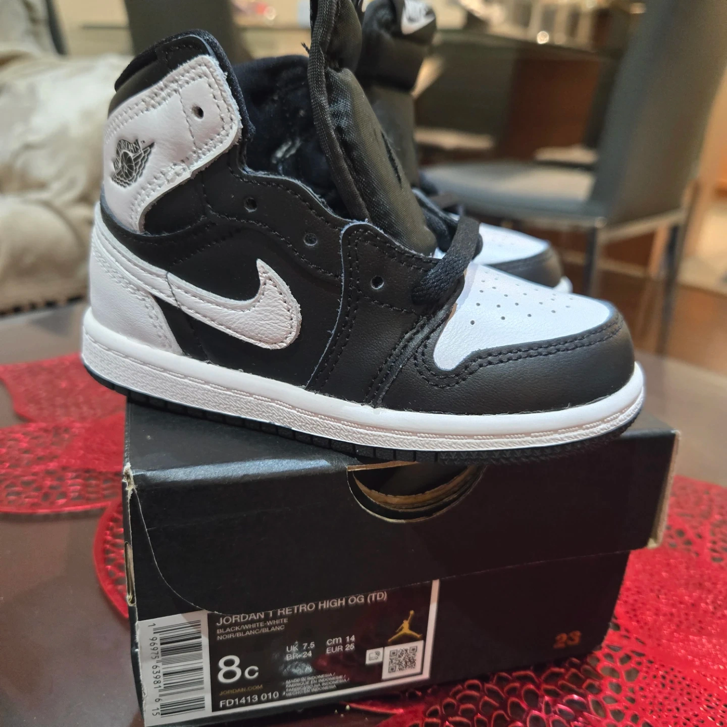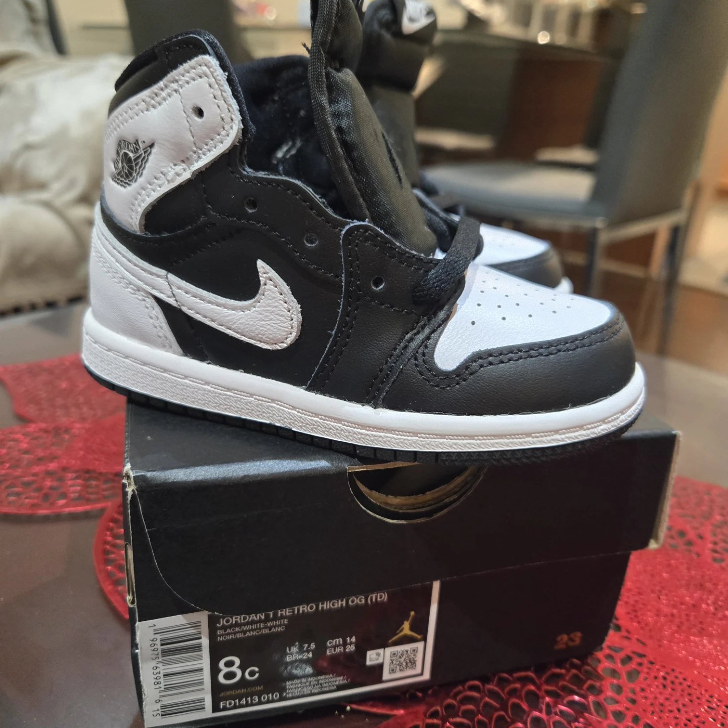 These Jordan 1 Retro High OG (TD) sneakers are in great shape and ready for a new home! They come in size 8C and feature the classic black and white colourway. The box is included!