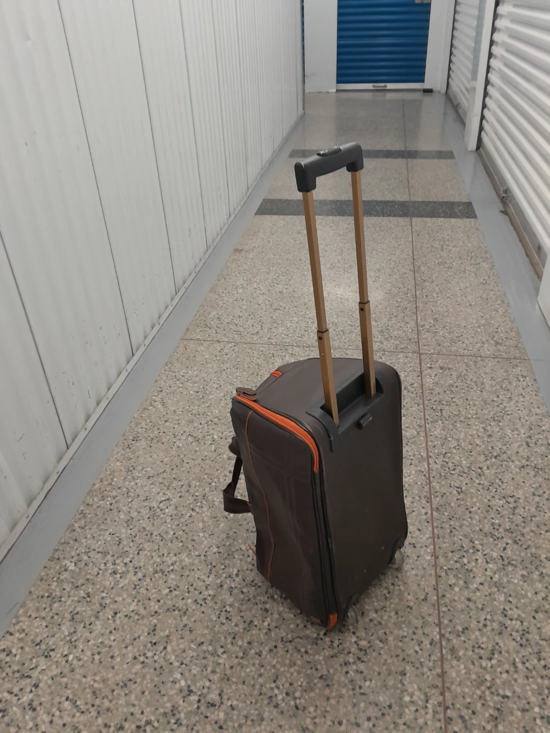 Rolling duffle bag in brown with orange trim. It's perfect for travel or storage. It has a retractable handle and wheels for easy transport. It's in good condition and ready for its next adventure!