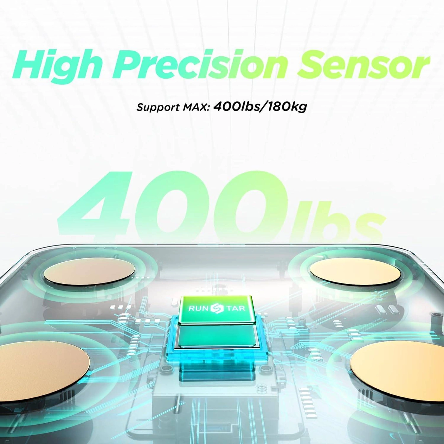 Get insights into your health with this RUN STAR smart scale! It offers 22 core measurements, including heart rate, visceral fat, water weight, and BMI. The extra-large VA screen displays 8 core data points at a glance. It also features a high-precision sensor and supports up to 400lbs/180kg