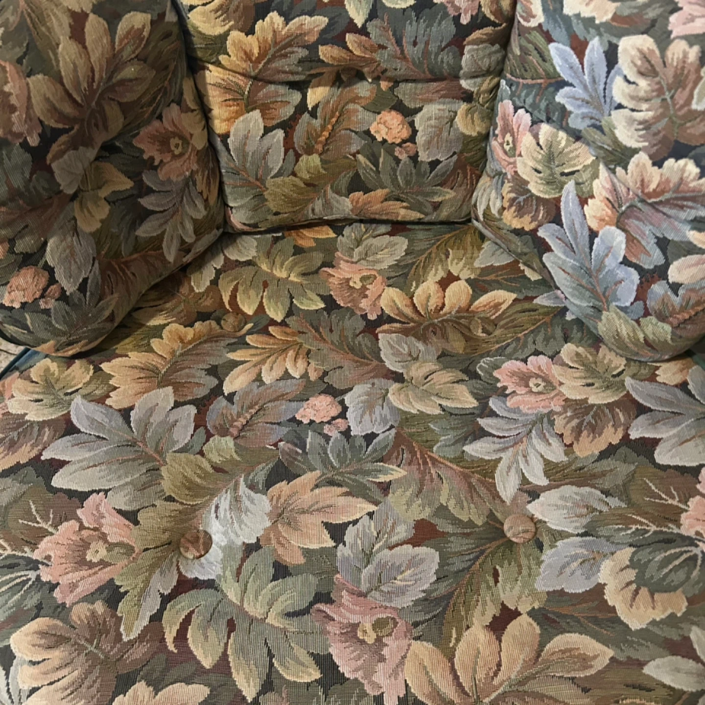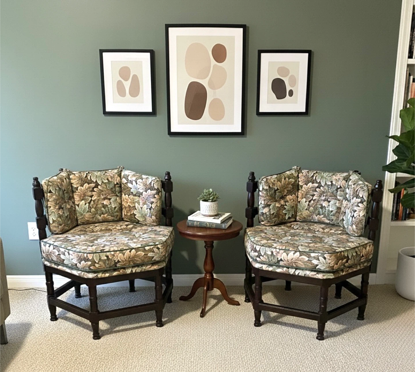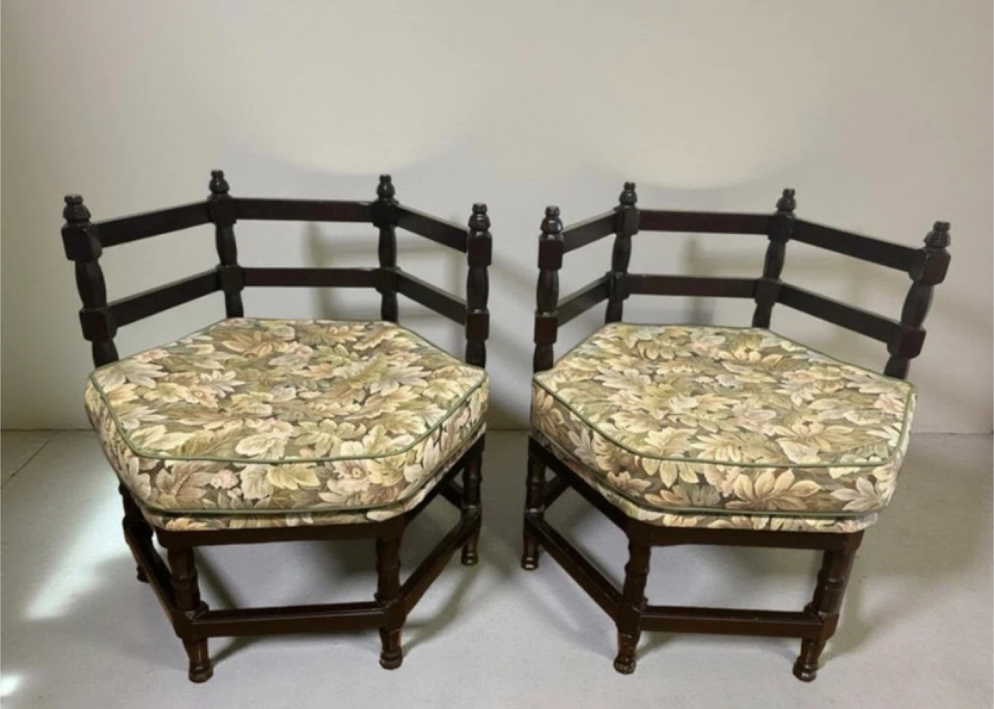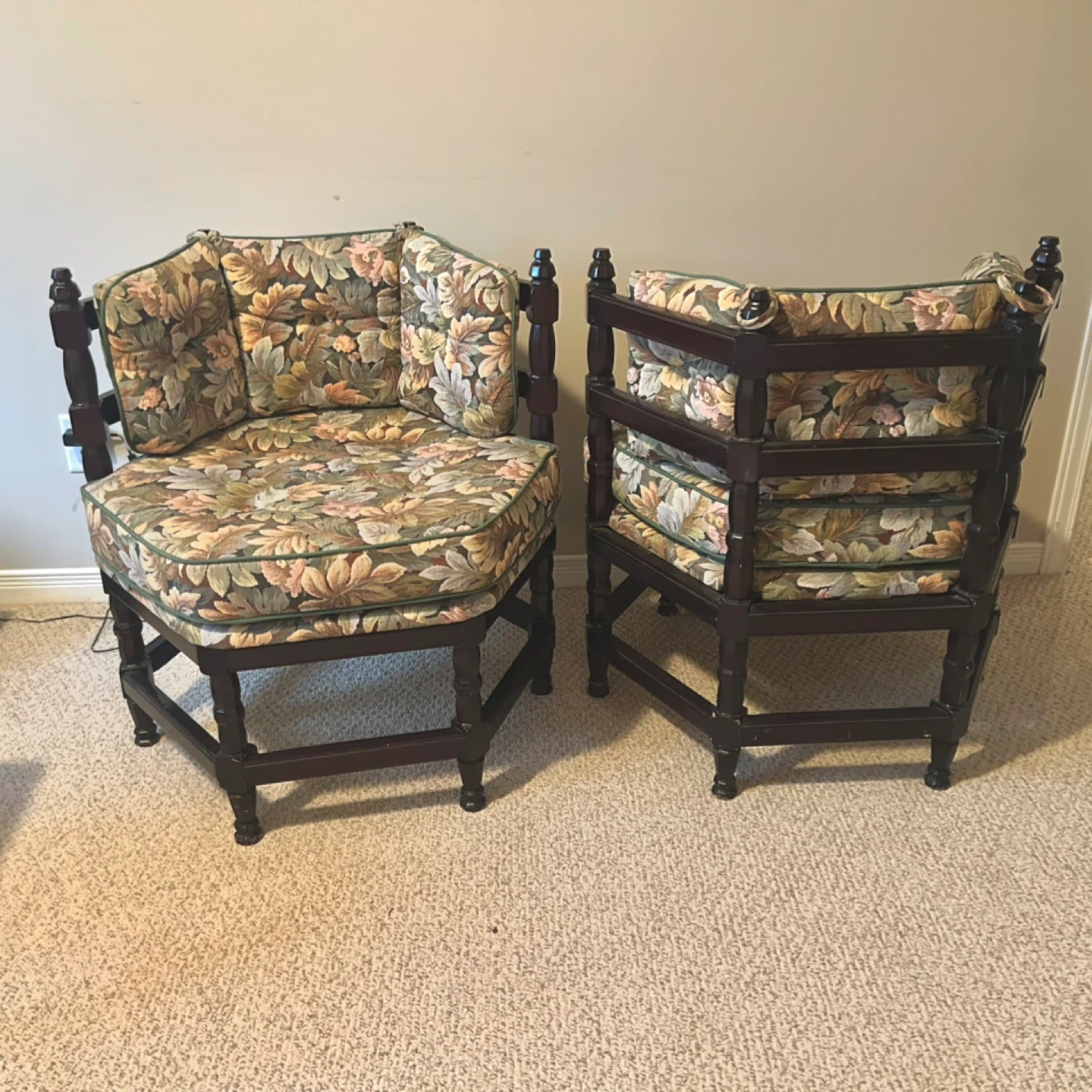 set of 2 Unique wood Accent Chairs Seat cushion is attached - back cushions can come off - good condition no rips or damage - height to top back of chair H31in - W28in -