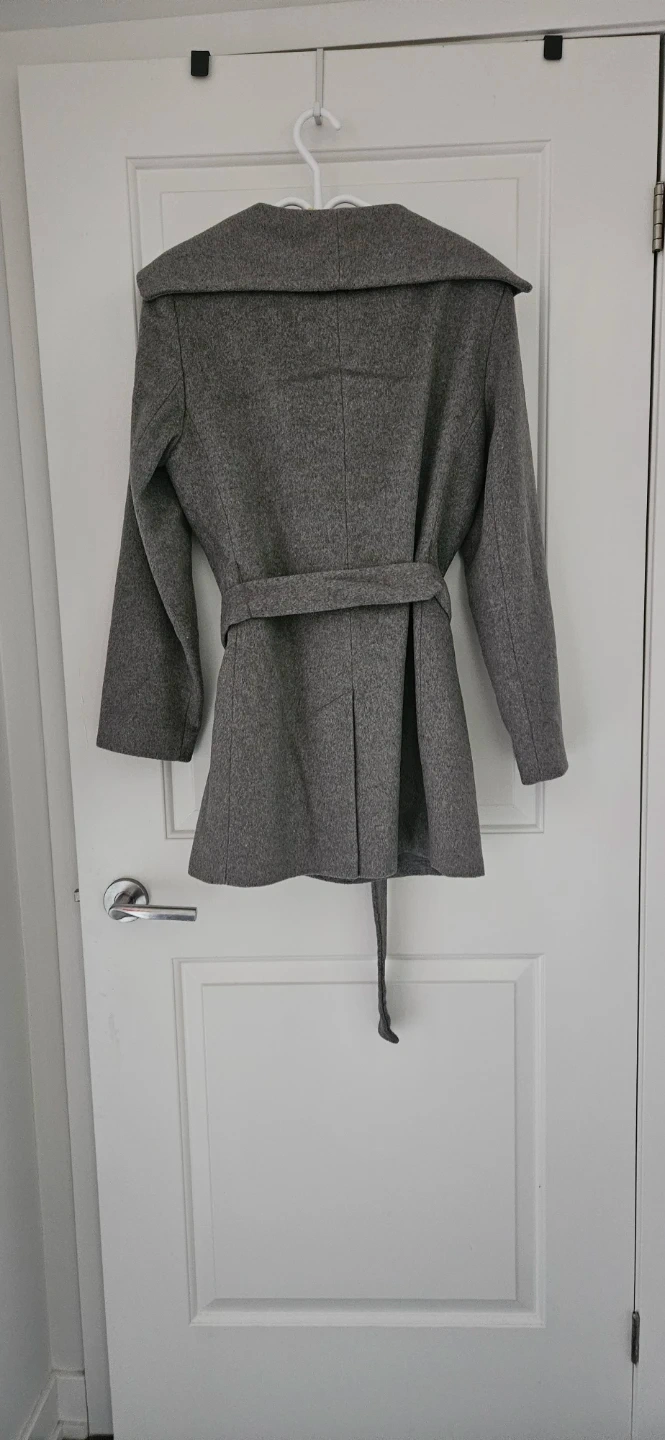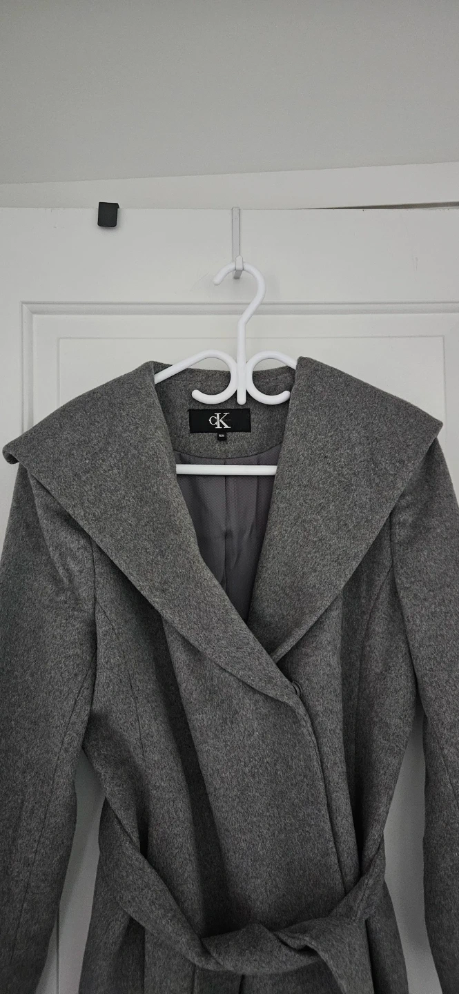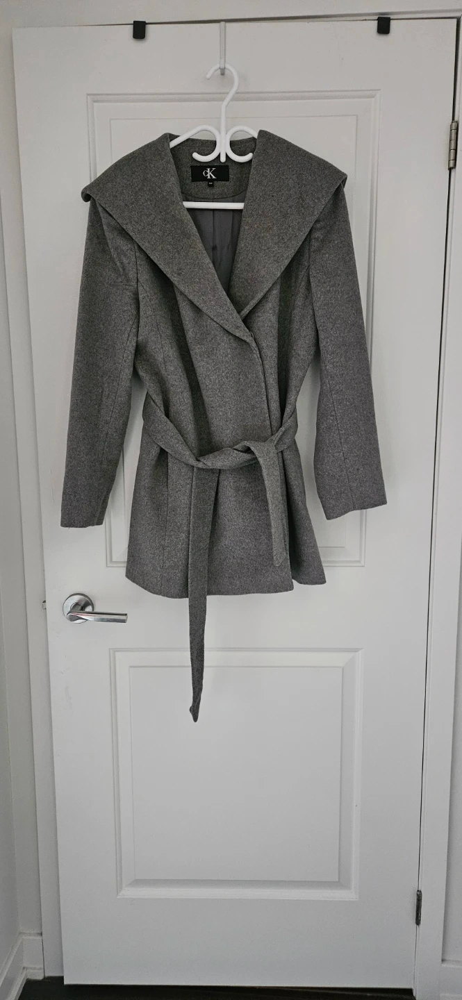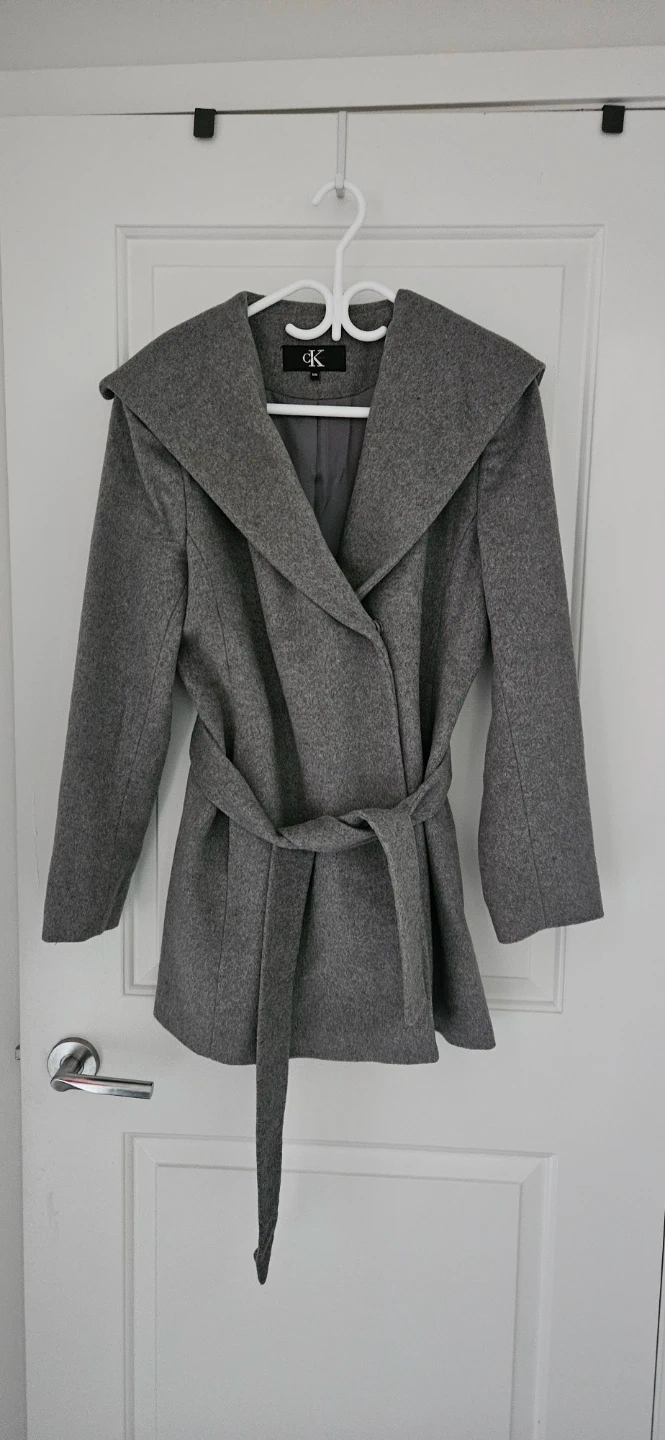 Selling a Calvin Klein grey wool blend coat in size medium. It's virtually brand new and features a stylish hooded design with a tie belt waist. Perfect for the winter and cooler months! Dry cleaned and ready to use!