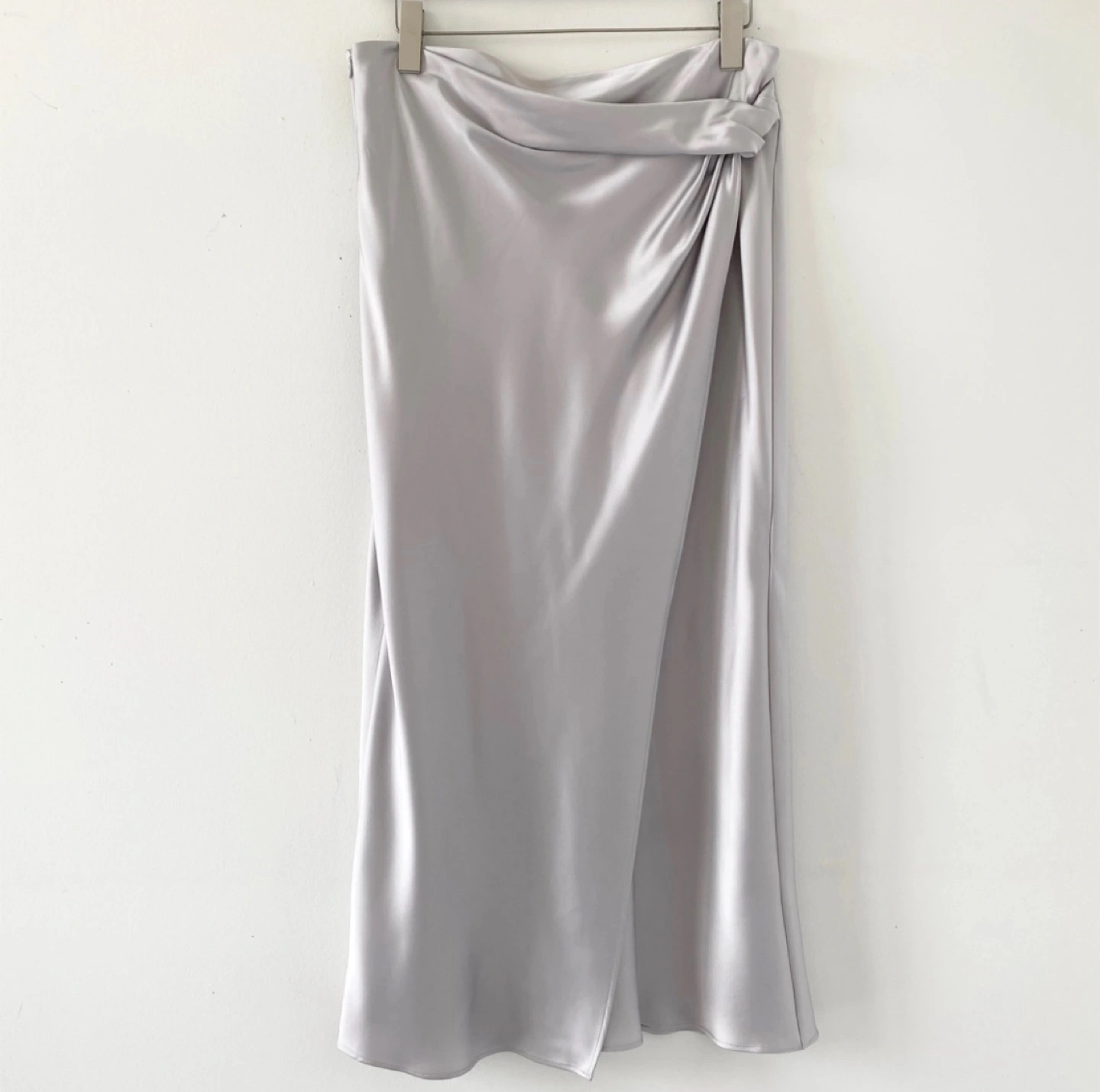 New without tag Zara faux wrap skirt with knot details and side invisible zipper closure. Made of medium weight 97% polyester, 3% elastane in a silver colour. It's very soft, silky and drapes like a dream! Can be dressed up or down.