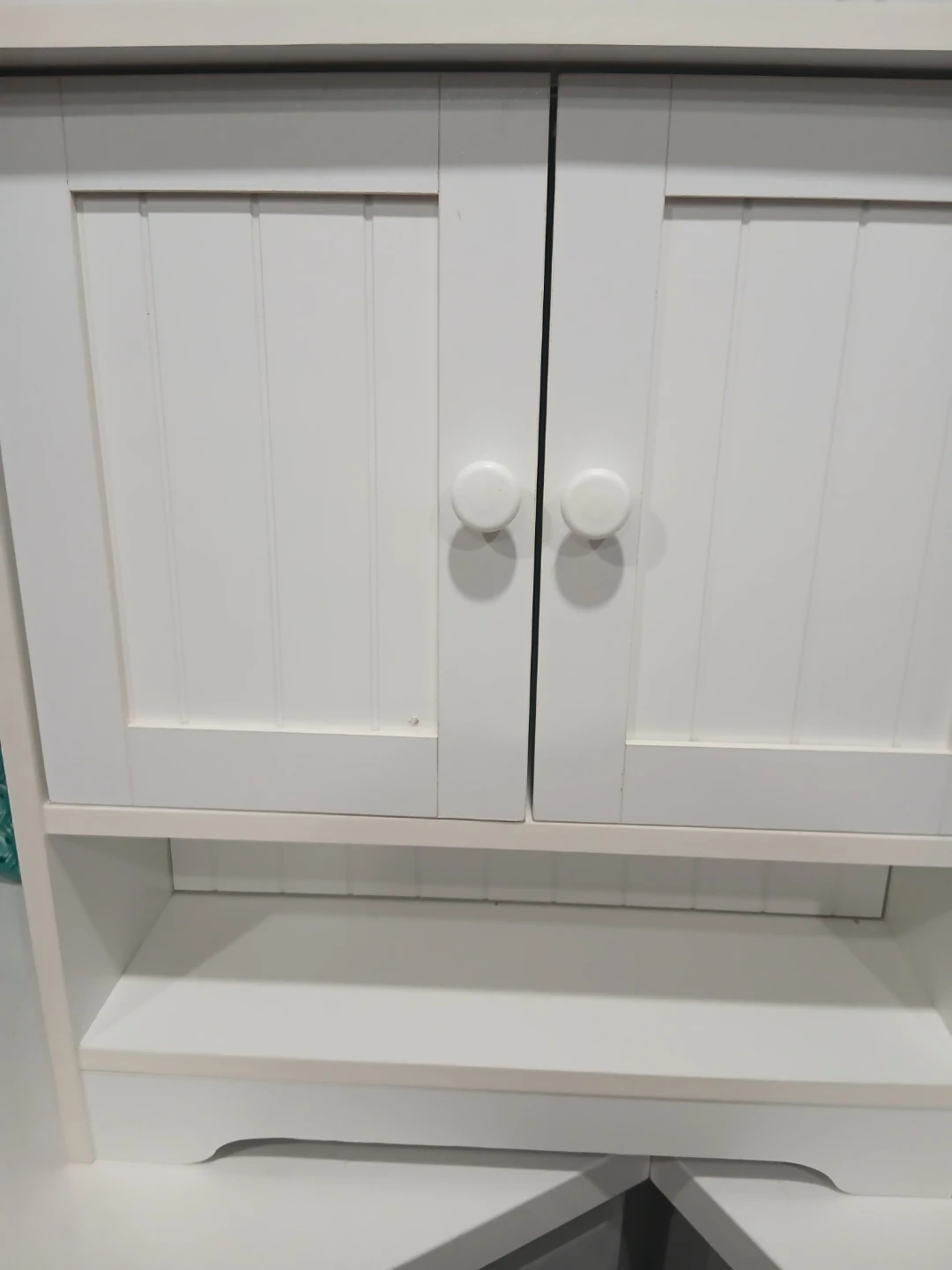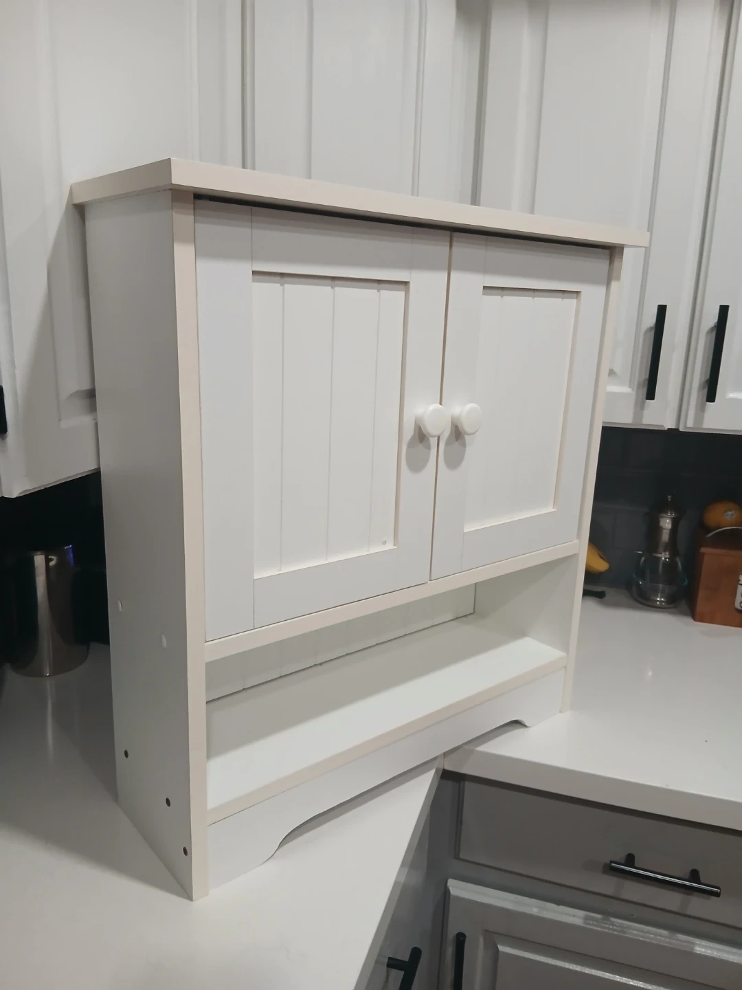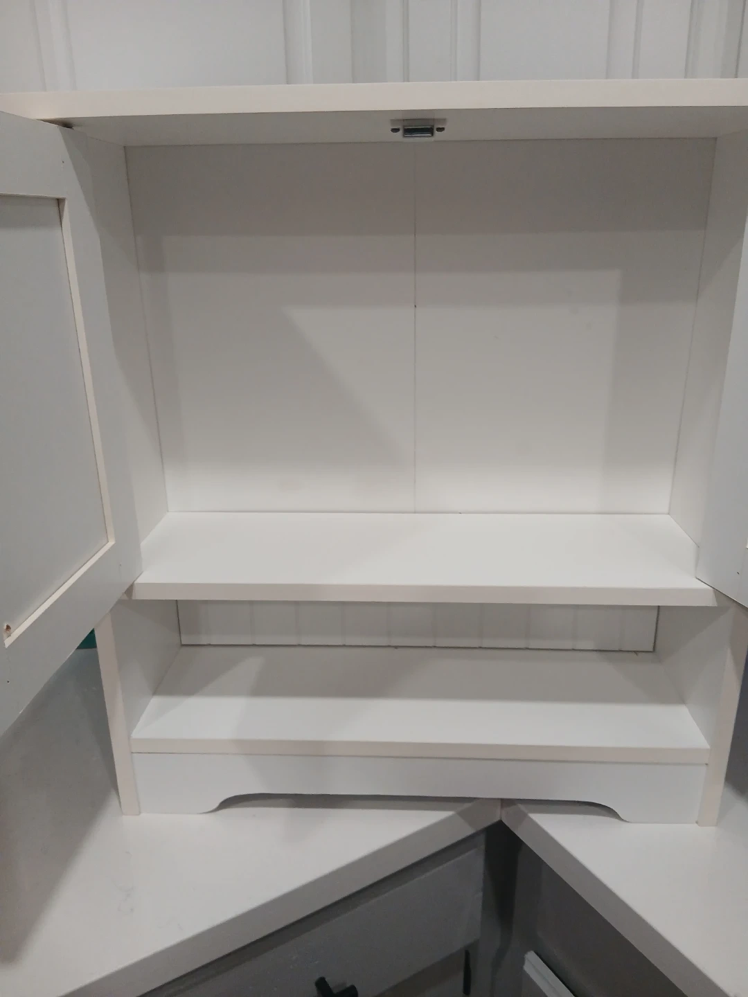 Here's a cute white wooden wall cabinet, perfect for adding some extra storage. It's in great shape and ready to be installed in your home. It features a two-door cabinet on top and an open shelf at the bottom.