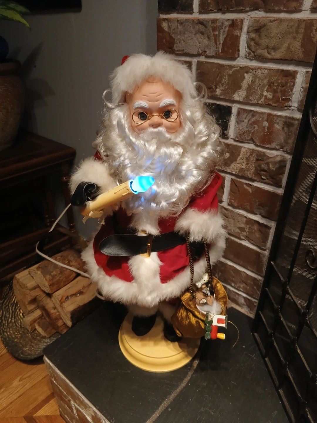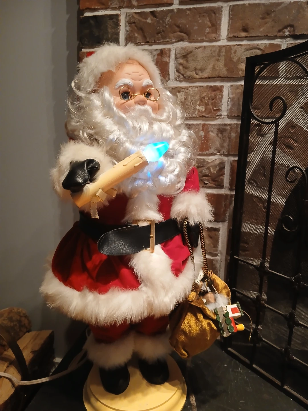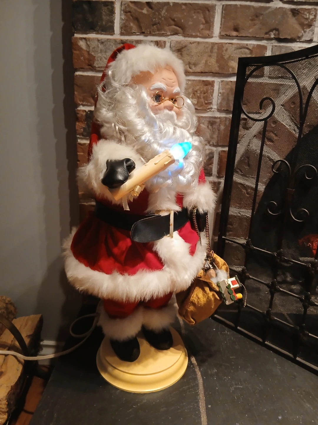 Here's a charming animated Santa Claus figure! He's wearing his classic red and white suit and holding a scroll that lights up. He also has a bag full of presents. This would be a great addition to your holiday decor!This is vintage and his head moves