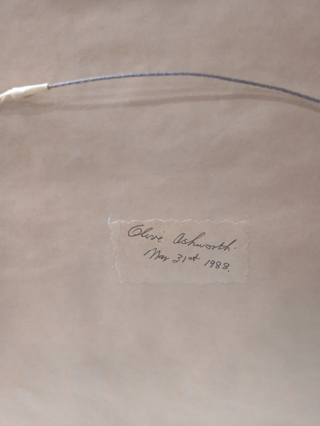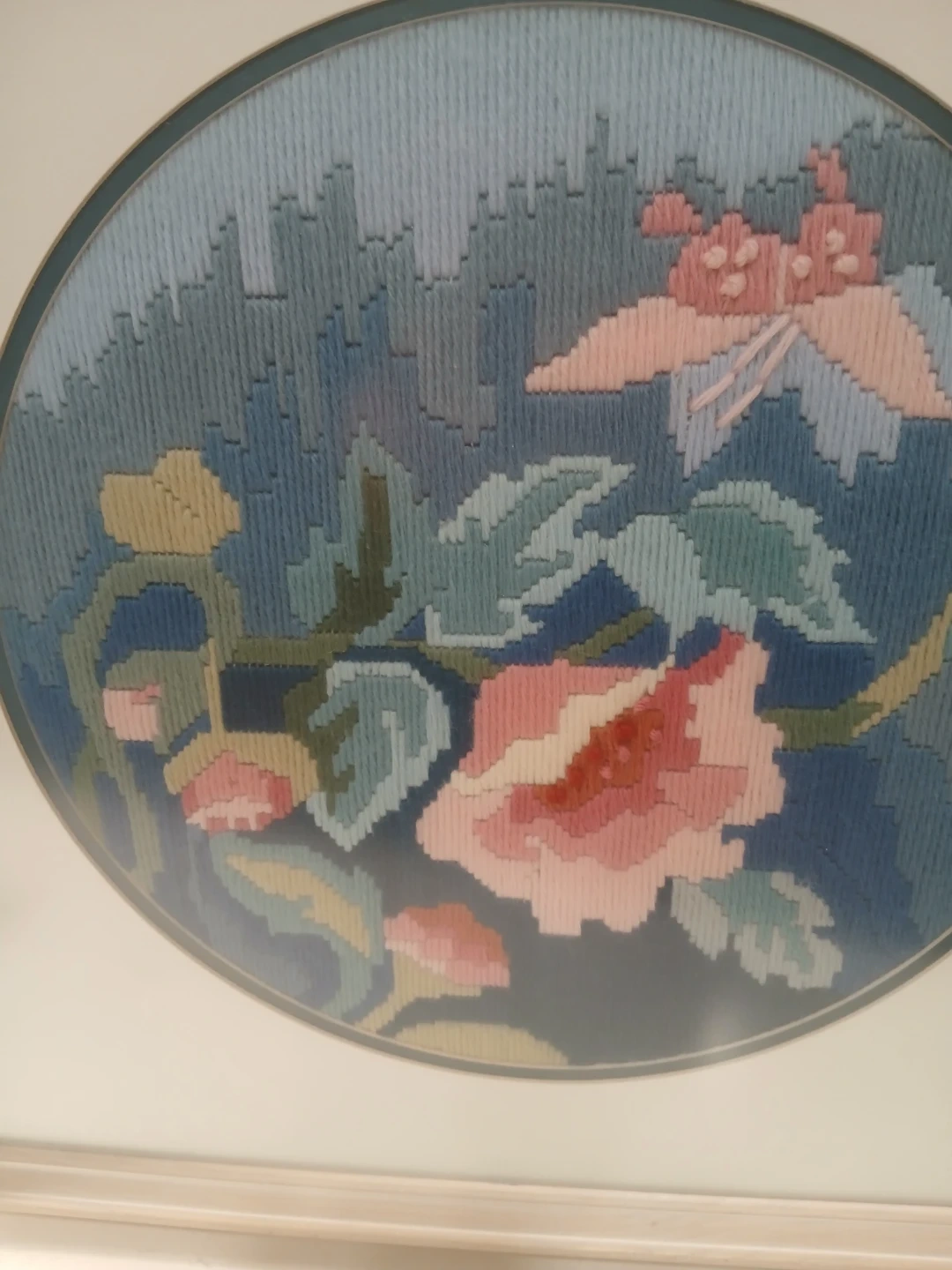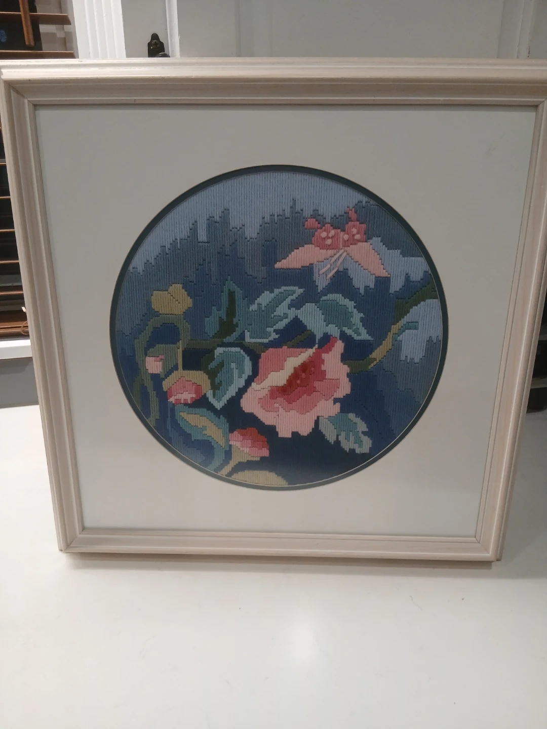 Selling a vintage framed needlepoint art piece. It features a floral design with a mix of blues, greens, and pinks. The artist's name, Olive Ashworth, and the date May 31, 1988, are written on the back, measures 18" X 18"