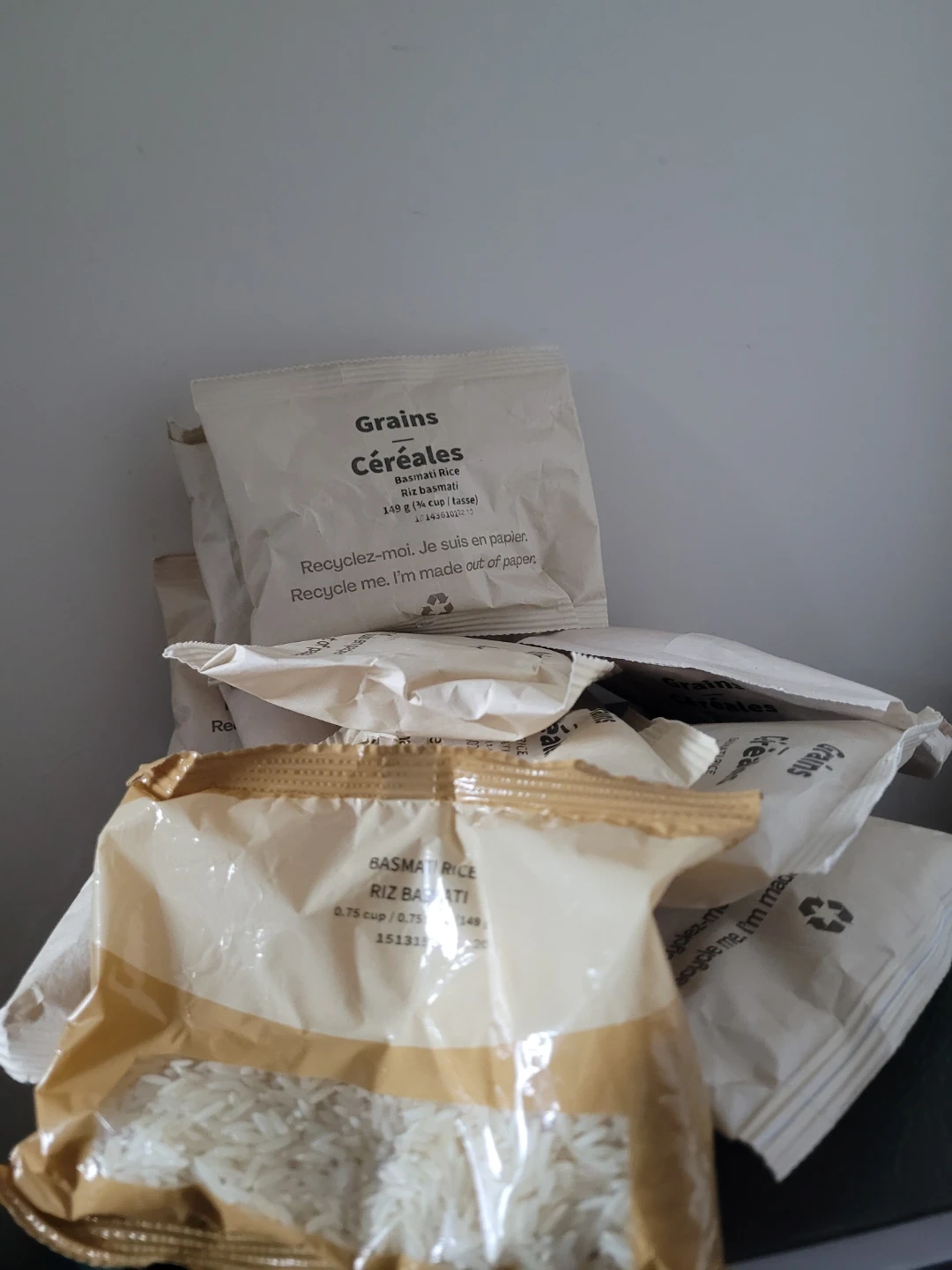 Selling individual packages of Grains Céréales Basmati Rice! Each package contains 149g (½ cup/tasse) of rice. The packaging is recyclable, so you can feel good about reducing waste!