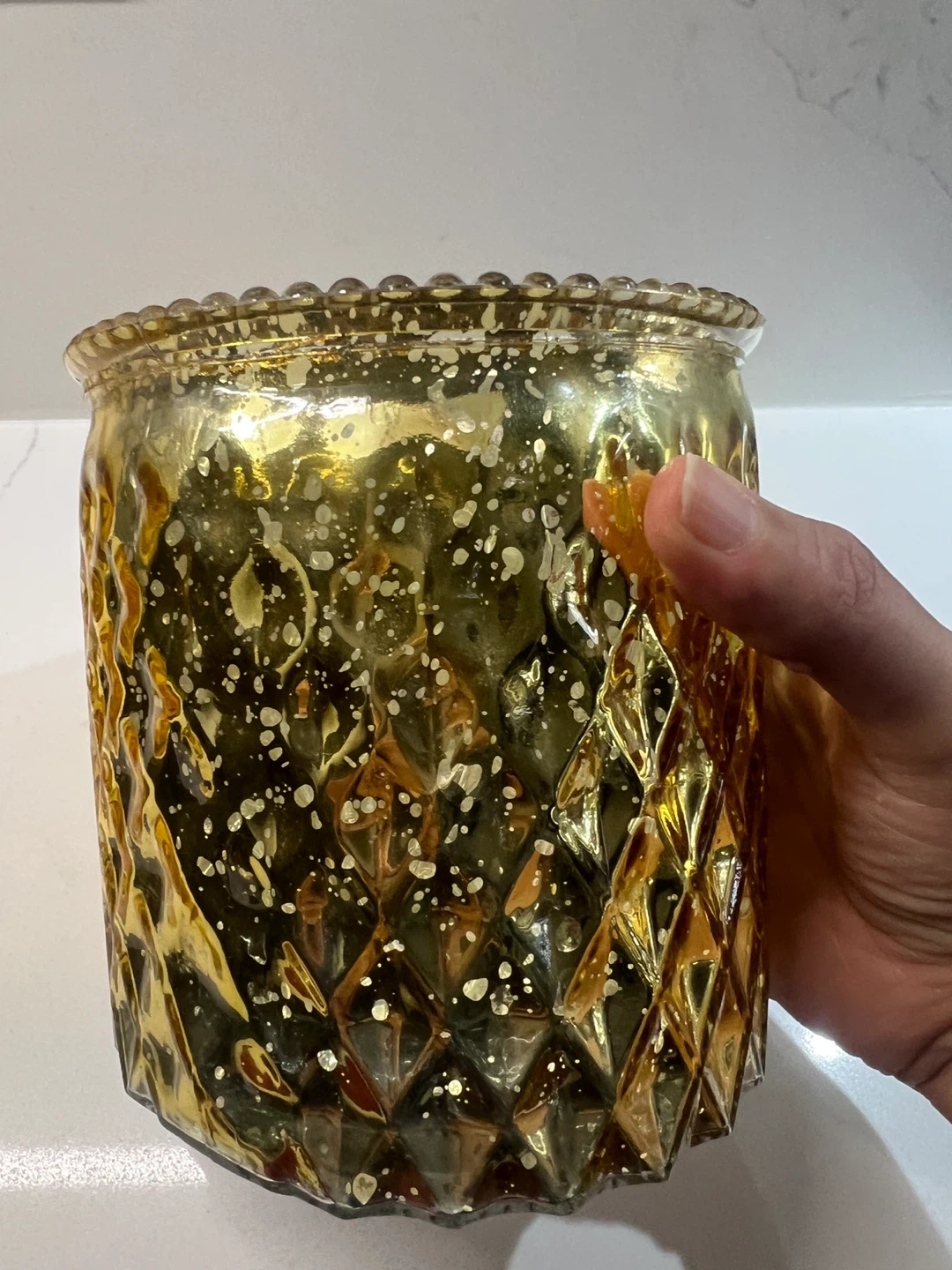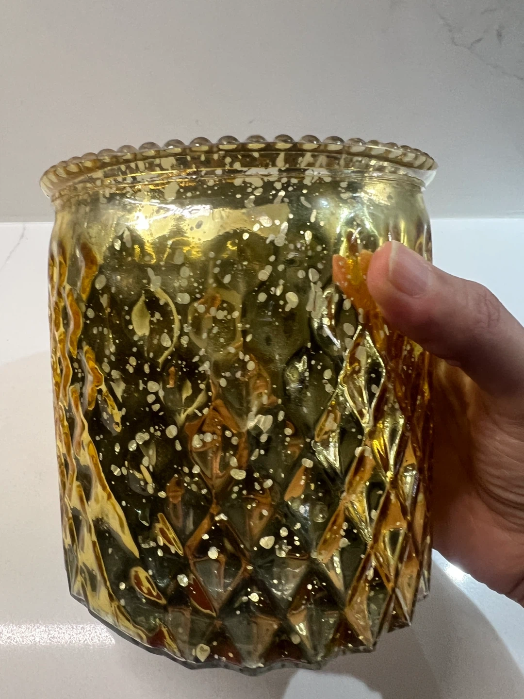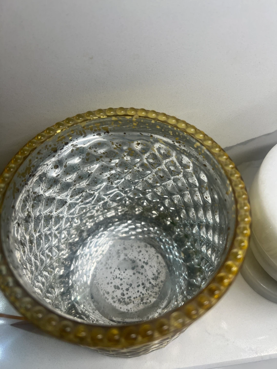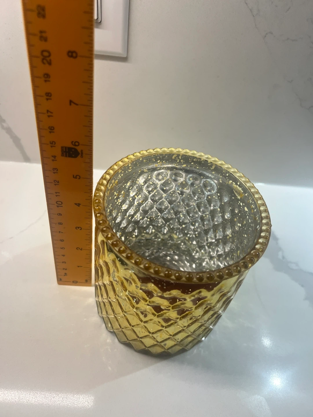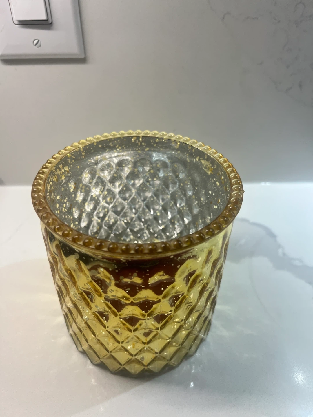Selling a lovely gold decorative flower pot/ candle holder! It's in great shape and would add a touch of elegance to any room. The textured design catches the light beautifully, creating a warm and inviting ambiance