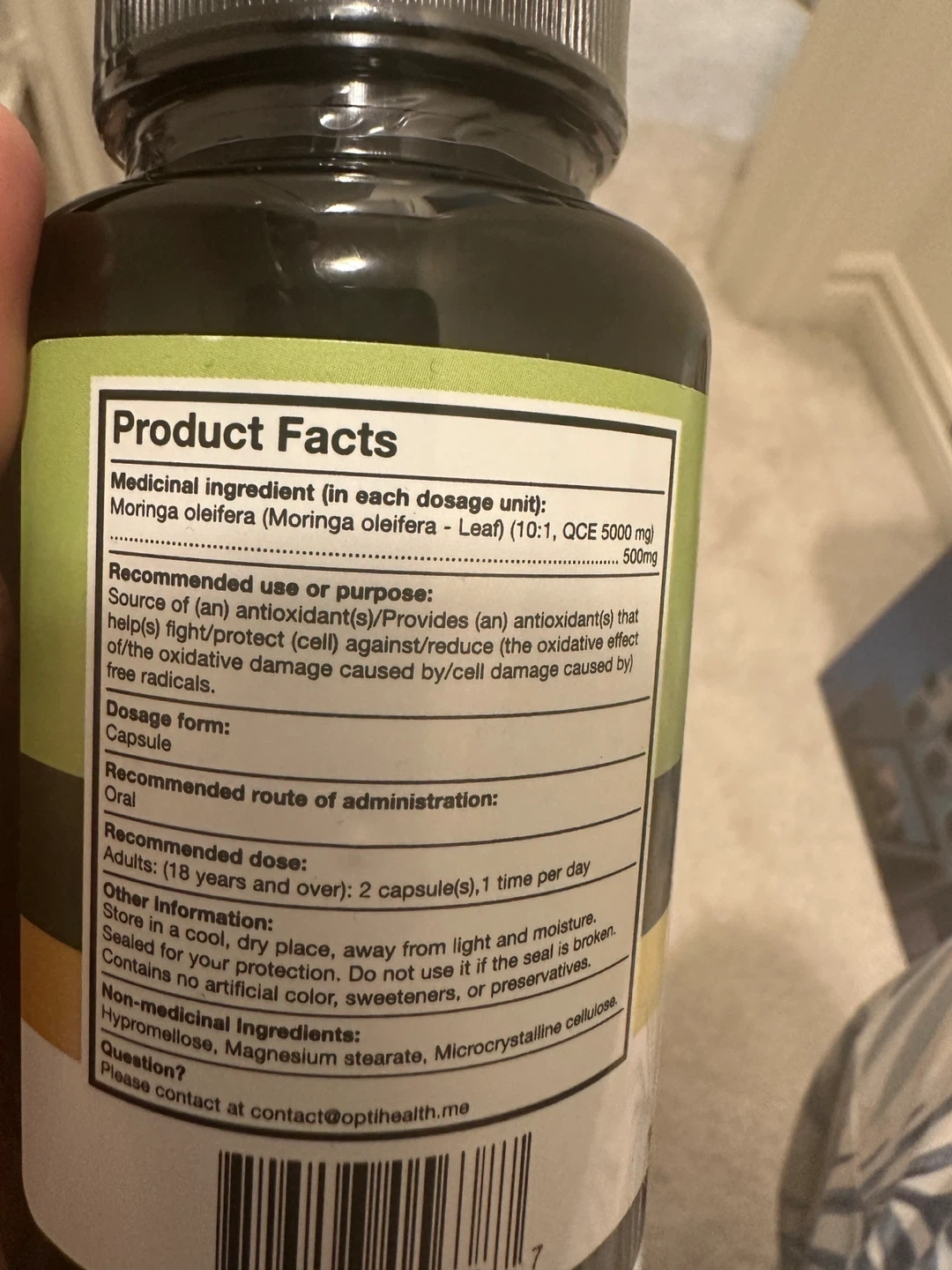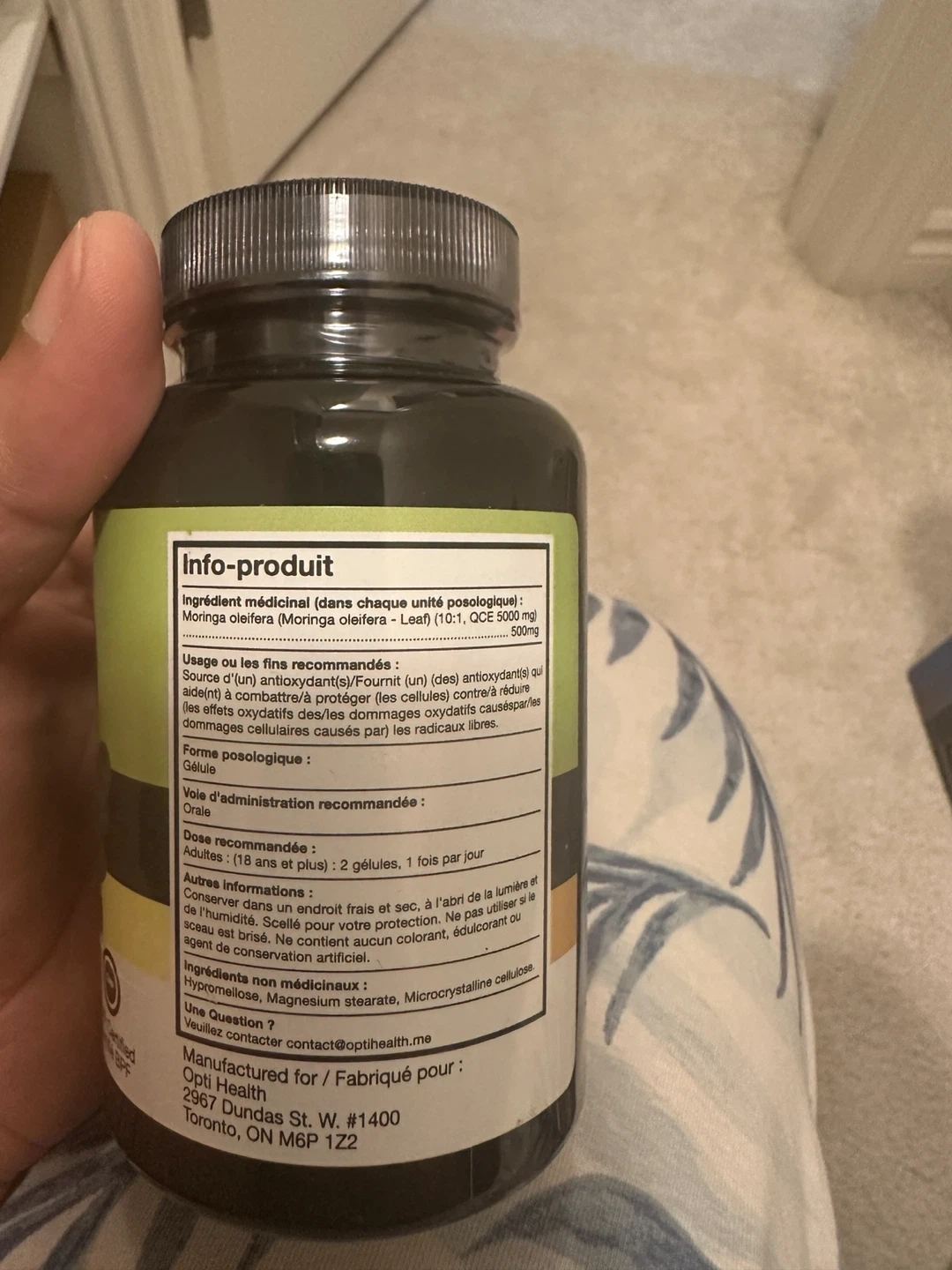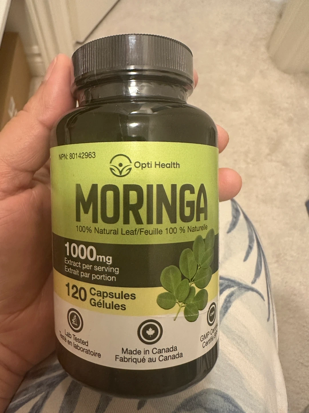Selling a bottle of Opti Health Moringa capsules. It contains 120 capsules with 1000mg extract per serving. The medicinal ingredient is Moringa oleifera (Moringa oleifera - Leaf) (10:1, QCE 5000 mg) 500mg. Take 2 capsules per day. It's made in Canada!