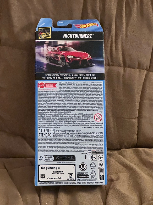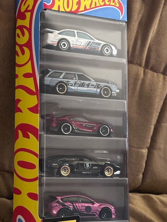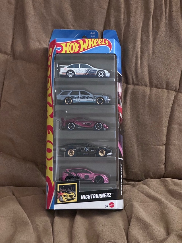Add some collectable cars to your collection with this Hot Wheels Nightburnerz 5 pack! The cars are new in box, ready for display or play. Here's what you get in the pack: * '87 Ford Sierra Cosworth * Nissan Maxima Drift Car * 20 Toyota GR Supra * Dinan Veloce * Subaru WRX STI These cars are eager to escape their packaging and zoom into your collection, but don't worry, if the ad is still up, they're still here, waiting for a new home!