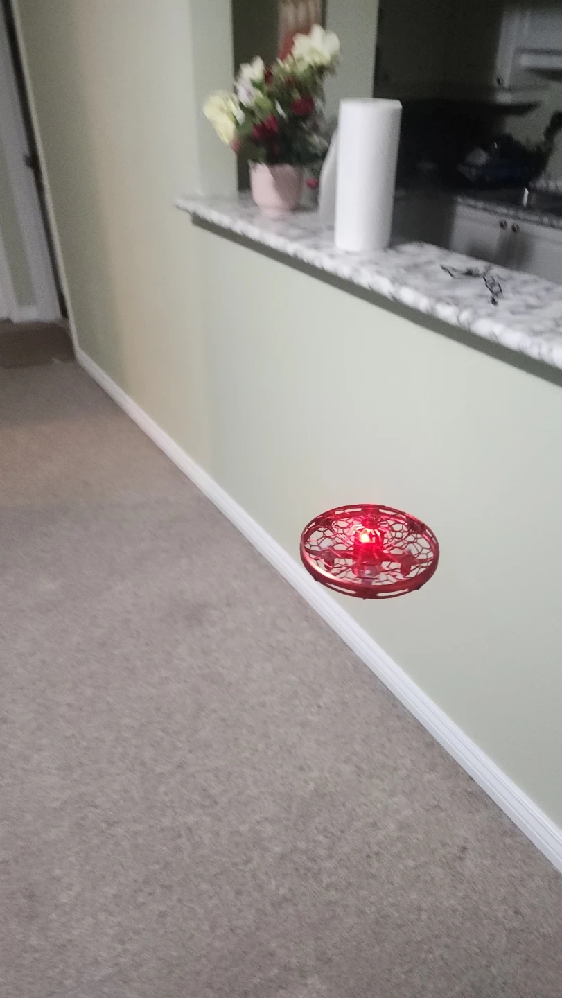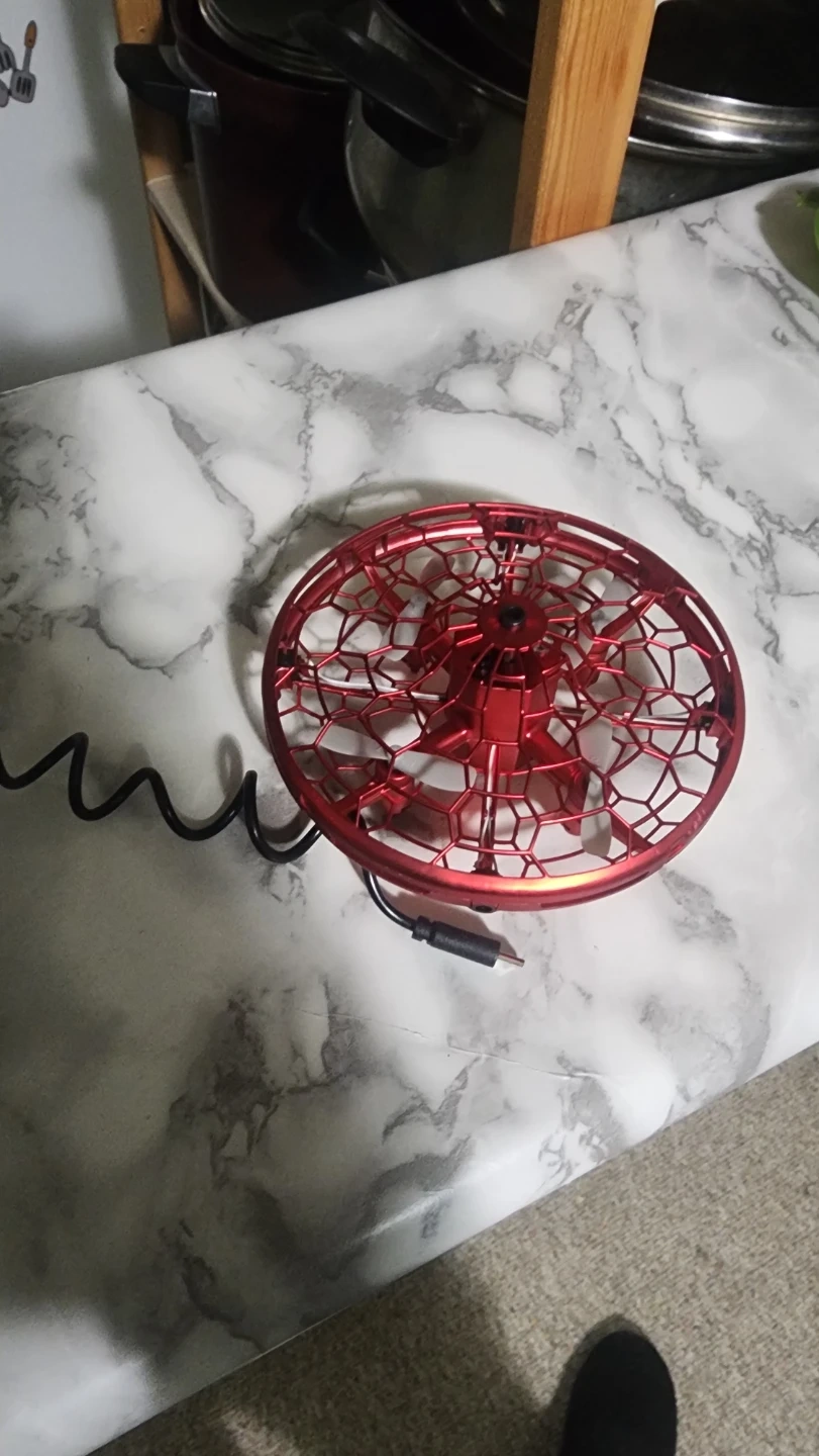 Check out this fun red flying UFO induction toy! It's a cool little gadget that flies around and is sure to provide some entertainment. It comes with a charger so you can keep the fun going!
