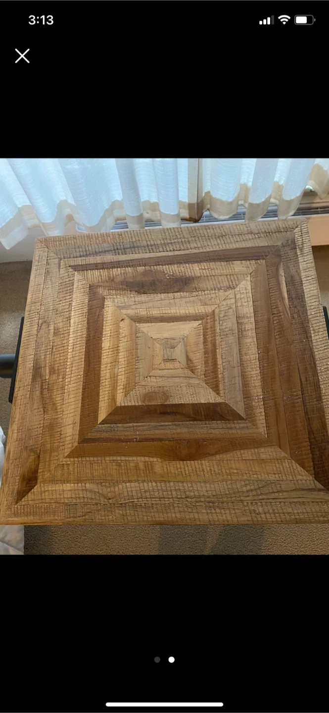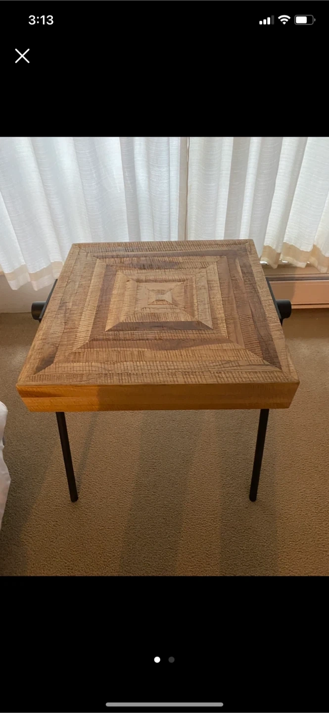 Selling a teak wooden side table. It has a unique square pattern on top and black metal legs. It's in great condition and would be a nice addition to any room