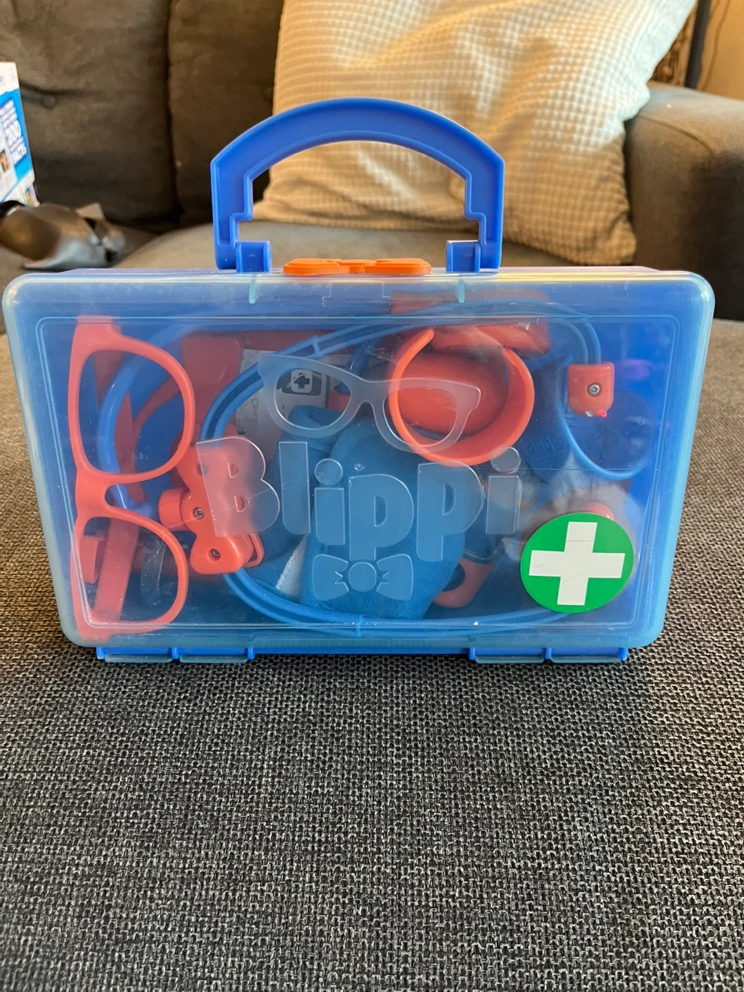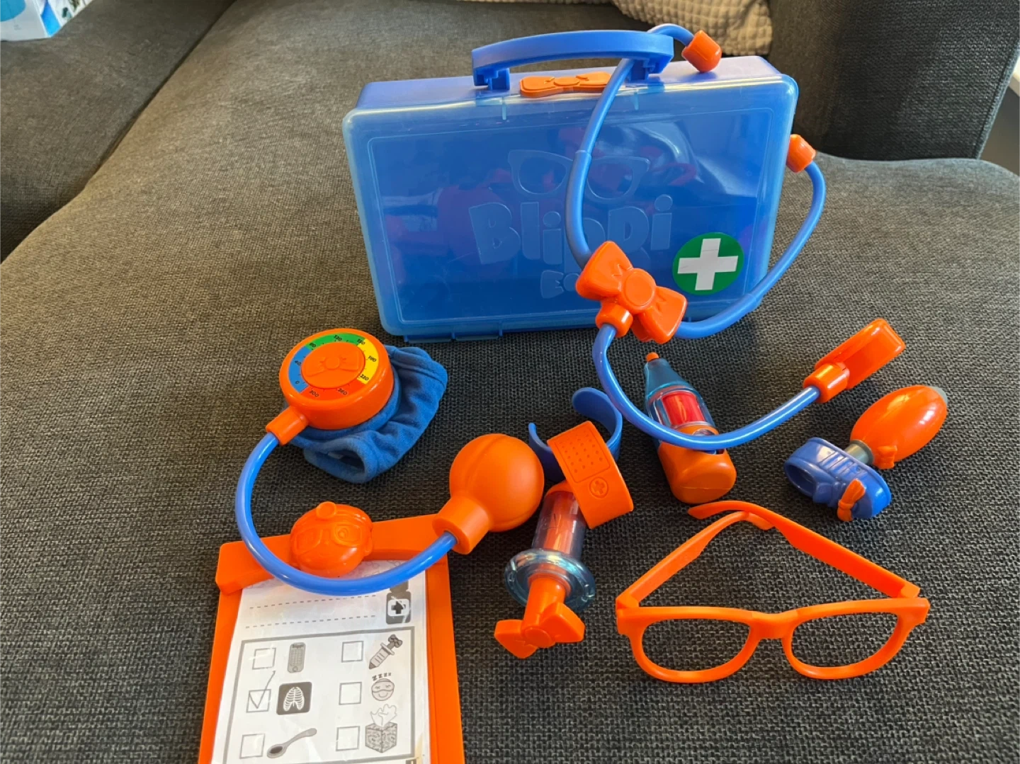 Blippi doctor roleplay kit for your little one! Includes a stethoscope, glasses, blood pressure cuff, syringe, and other doctor tools all in a handy carrying case.